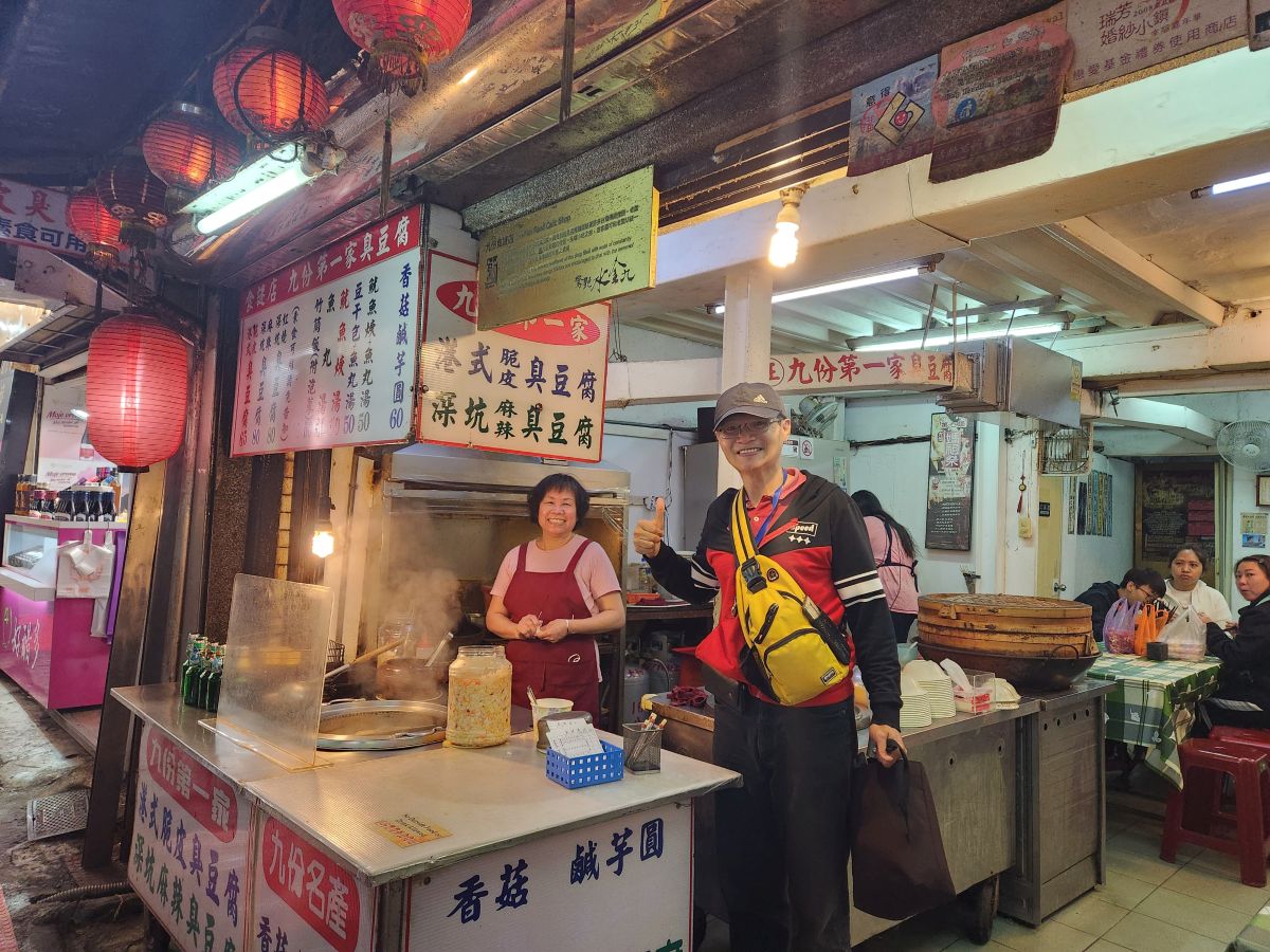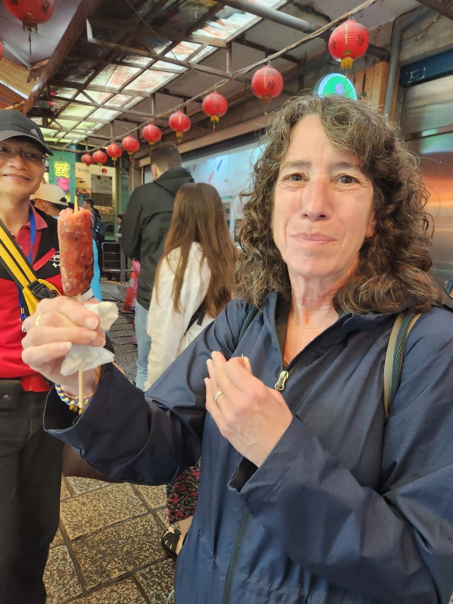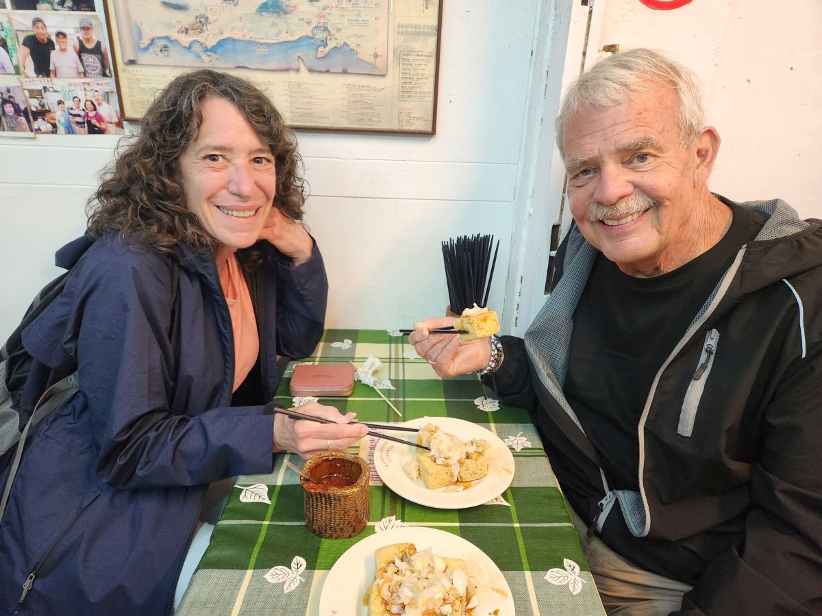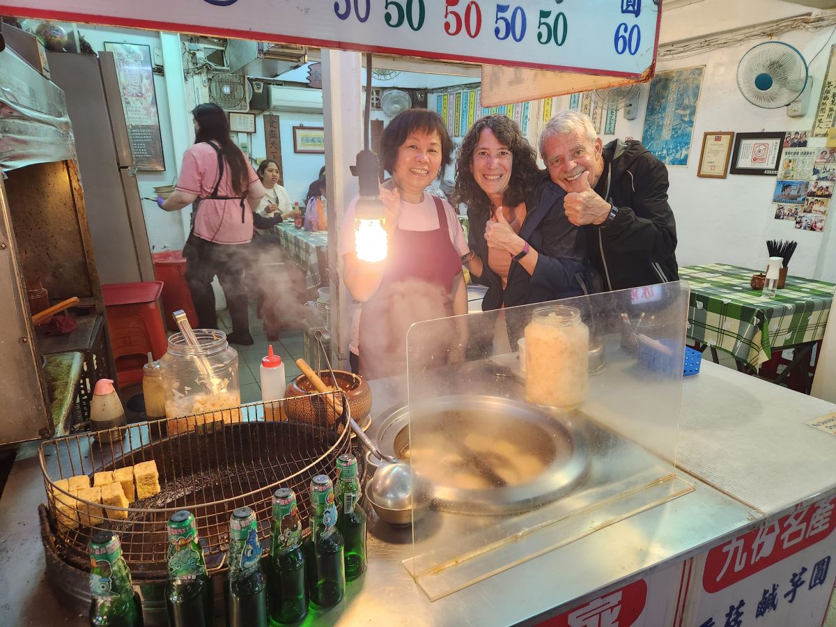 Then it is on to the Cho tofu shop – stinky tofu. Yes, stinky tofu! It is fermented and either steamed or boiled or fried and a favorite of Taiwanese, but not of foreigners. So when we tell Vincent we want to try it, he’s thrilled. He suggests we try the fried, getting us a plate to share, and a whole plate for himself. And it is great. Seriously. I was totally expecting to hate it, but this stuff is really good. First of all, it isn’t as stinky as you’d suspect, secondly it has an excellent deep sort of meaty taste, and the pickled onions that come with it make it even better. Vincent is so excited we like it, he just can’t believe it. He says we are the first foreigners he has ever known that really enjoyed Cho tofu. And to his point, the couple at a table behind us are so amazed that we are here, eating and enjoying it that they take a picture of us! Too funny. Vincent then decides that we need to also try the steamed tofu in broth, buying a bowl for the 3 of us to share. It’s a little spicy he says. Um. Little? It is actually excellent, but way too spicy for me – especially without a beer to wash it all down! But still – what a fun time! And Vincent treats us because he is so happy and excited we liked everything. Leaving the restaurant, we take some photos with mama who was cooking, because she, like everyone is really excited we liked everything.