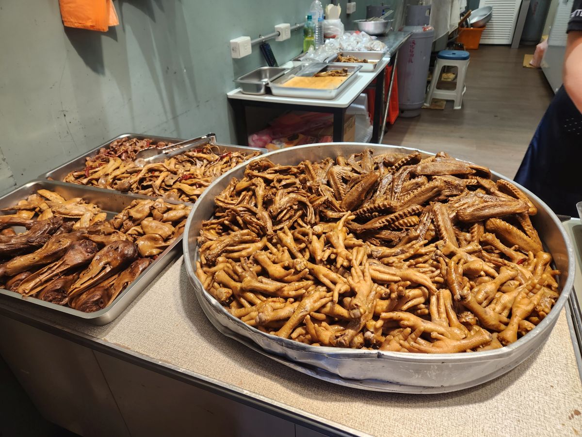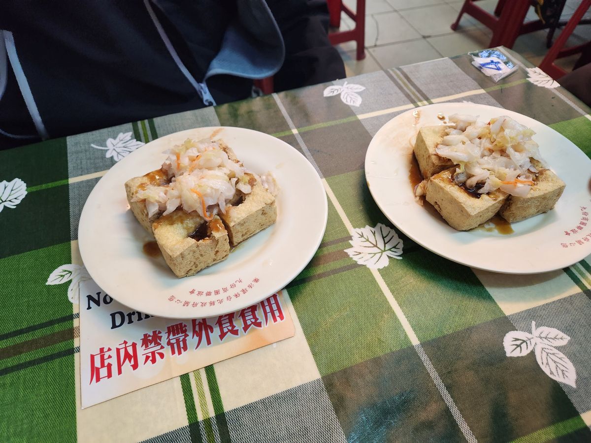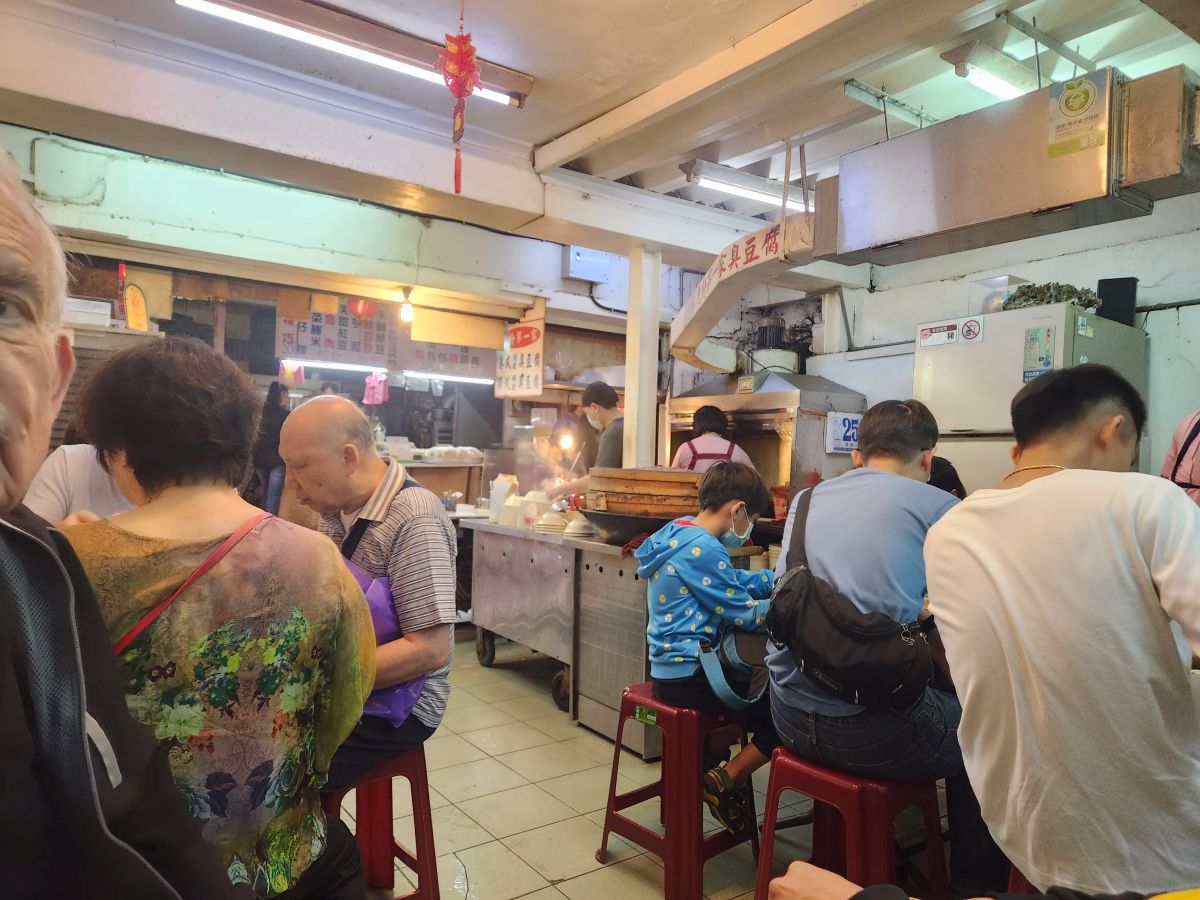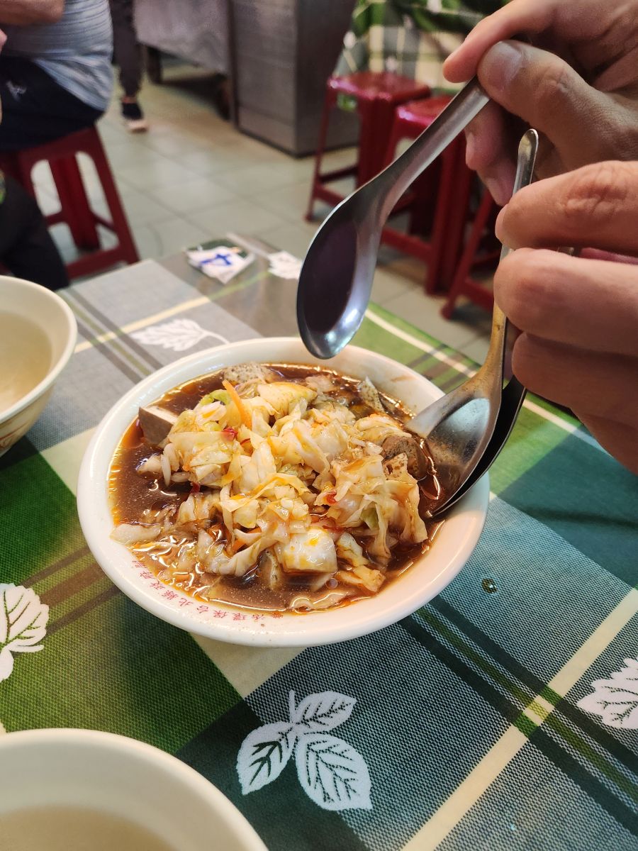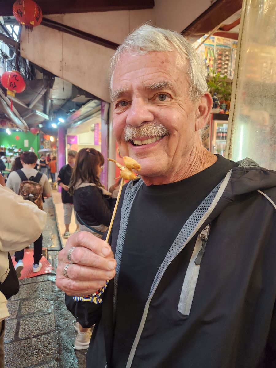 Then it is on to the Cho tofu shop – stinky tofu. Yes, stinky tofu! It is fermented and either steamed or boiled or fried and a favorite of Taiwanese, but not of foreigners. So when we tell Vincent we want to try it, he’s thrilled. He suggests we try the fried, getting us a plate to share, and a whole plate for himself. And it is great. Seriously. I was totally expecting to hate it, but this stuff is really good. First of all, it isn’t as stinky as you’d suspect, secondly it has an excellent deep sort of meaty taste, and the pickled onions that come with it make it even better. Vincent is so excited we like it, he just can’t believe it. He says we are the first foreigners he has ever known that really enjoyed Cho tofu. And to his point, the couple at a table behind us are so amazed that we are here, eating and enjoying it that they take a picture of us! Too funny. Vincent then decides that we need to also try the steamed tofu in broth, buying a bowl for the 3 of us to share. It’s a little spicy he says. Um. Little? It is actually excellent, but way too spicy for me – especially without a beer to wash it all down! But still – what a fun time! And Vincent treats us because he is so happy and excited we liked everything. Leaving the restaurant, we take some photos with mama who was cooking, because she, like everyone is really excited we liked everything.