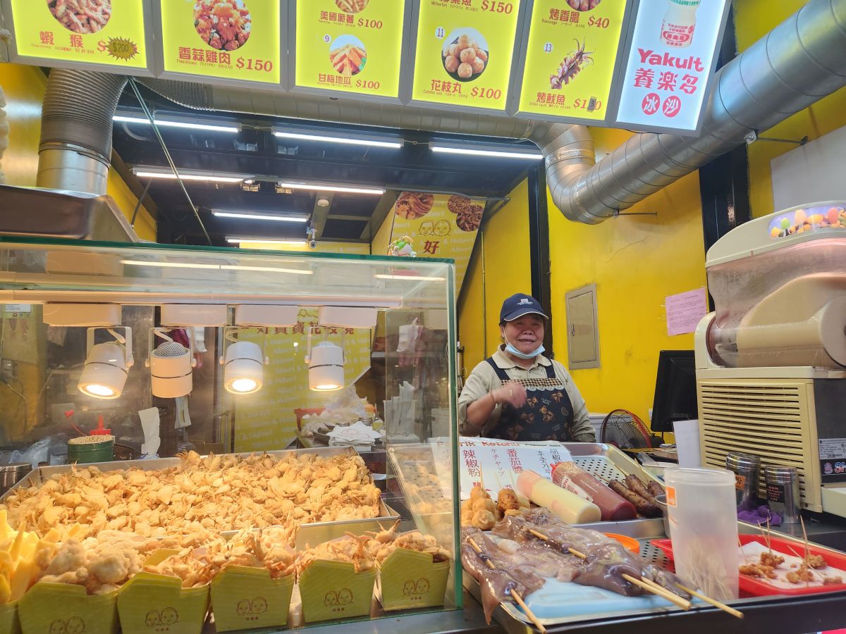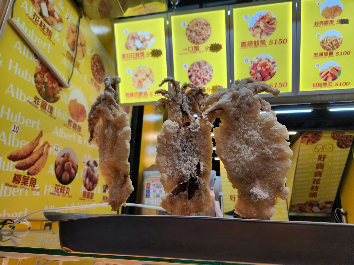 Next up a big bag of fried seafood – cuttlefish cubes and crab! Yes, crab! Little baby crab claws all battered up and fried. So yummy – and here again, the lady selling the seafood is just so happy to see we enjoy it!