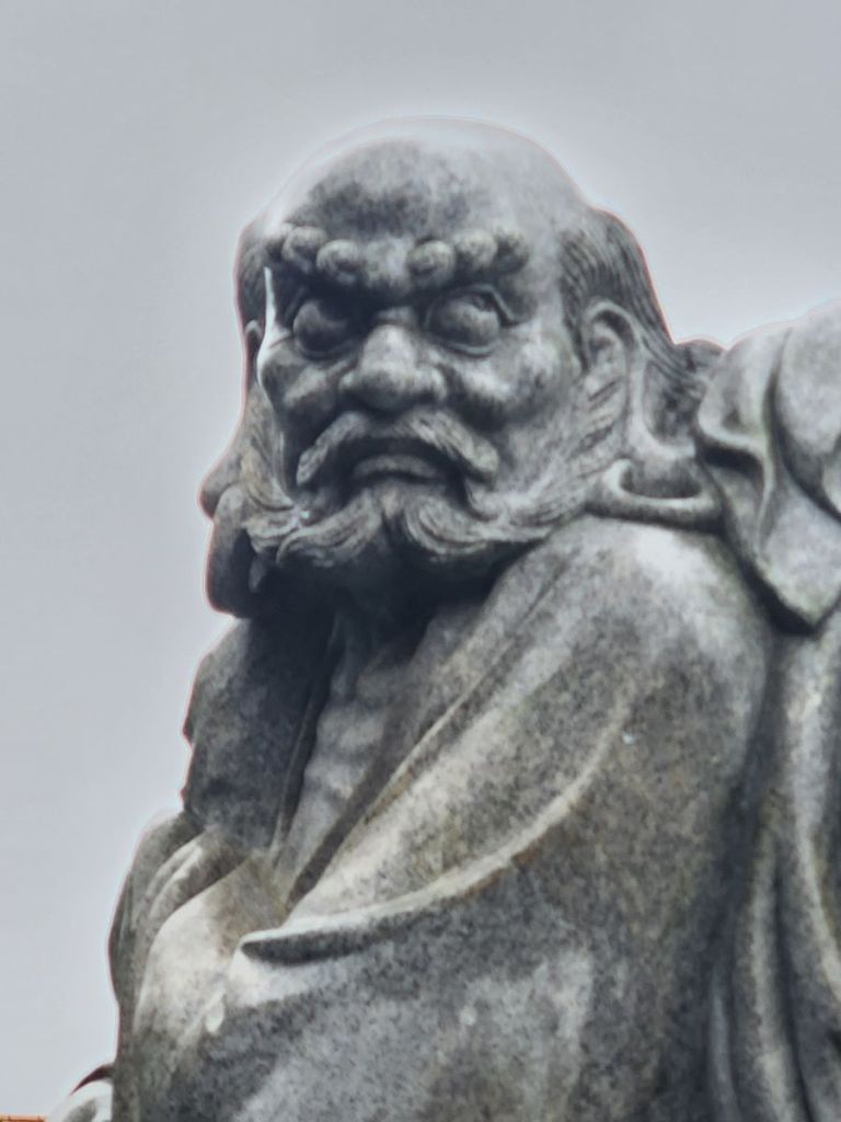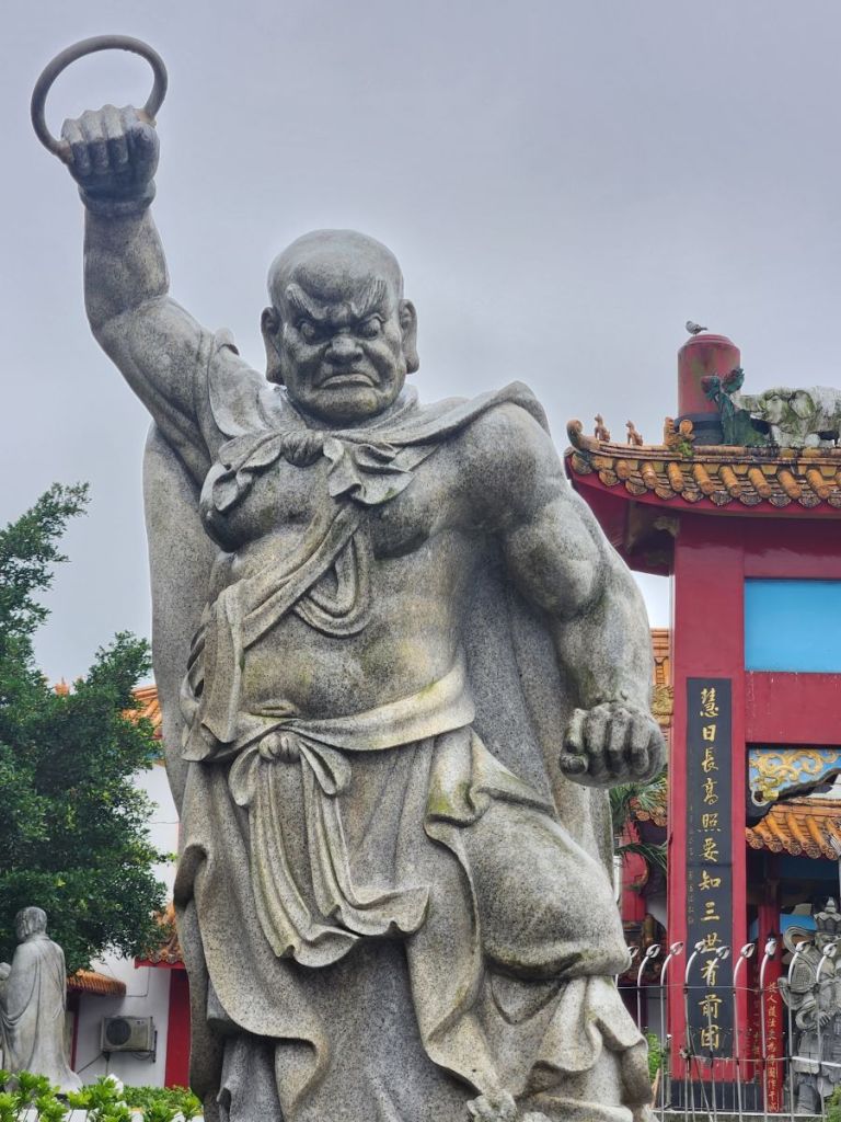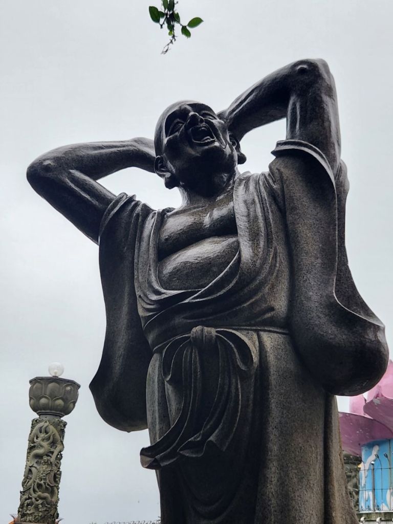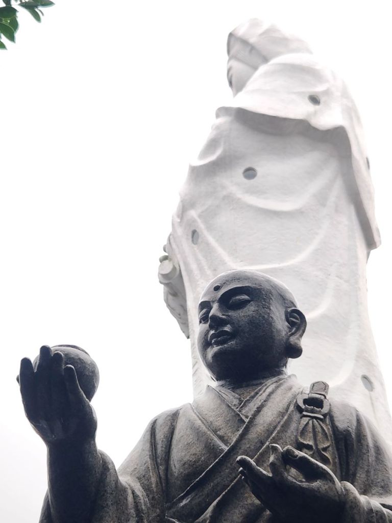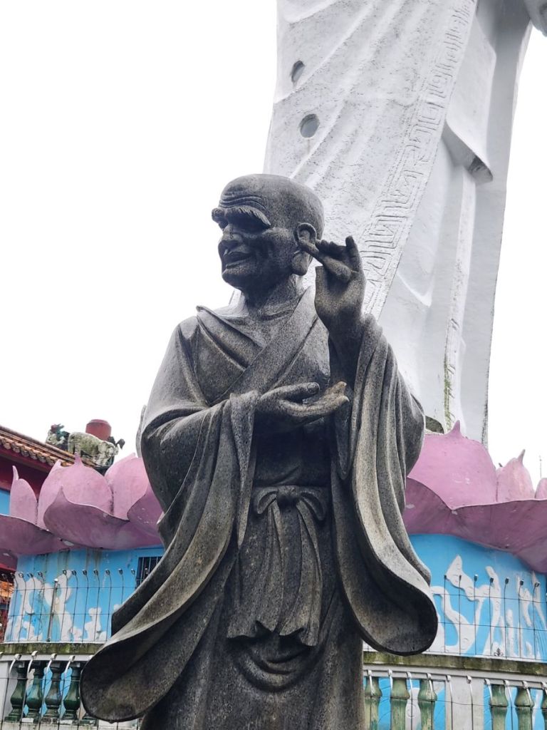 We wander around the complex, marveling at the statues and sculptures (what is that monk doing with the stick in his ear?) and looking out over the harbor in the mist and rain. The sheer volume of huge statues is just overwhelming and we love wandering amongst them, even in the rain, examining the detail and taking pictures. Not to mention the bell ringing! Vincent insists we ring the bell – which is a whole lot harder than it looks, we can tell you. But we do try, and it is really a great feeling once we accomplish at least a little gong on that huge thing!