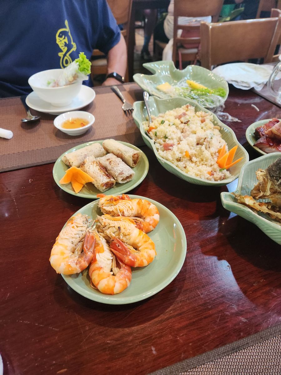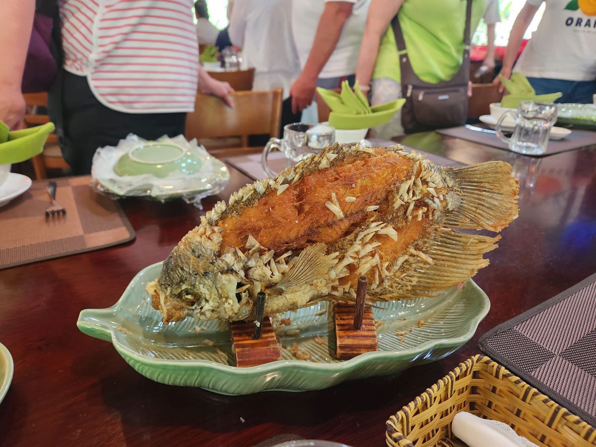 Arriving at the Rest Stop, which is not the “traditional” type of gas station/restaurant rest stop you always see, it is more of a resort restaurant and souvenir shop all in one. Huge open air eating areas with ponds and lotus plants everywhere, we think we’ve been here before, but who knows. It’s included and we don’t care! We grab a table, eventually sharing with 2 couples traveling together, originally from the States who have lived in Oaxaca Mexico for the last 20 years! Cool. The food is family style for 8, but we only have 6 at the table – so extras all around! First course is Elephant Ear fish – which is actually piranha! – cooked in the traditional “crippy” fish way. I was thinking we’d just dig in, but no, one of the waitresses arrives and expertly pulls the flesh off the fish to make fabulous spring rolls. Let the smorgasbord begin! Along with the spring rolls there are plates of pork ribs, fried pork rice, grilled shrimp, pork wrapped in rice noodles and fried – which is oh so very good! – fish cakes on lemongrass and a hot pot soup. Really excellent meal.