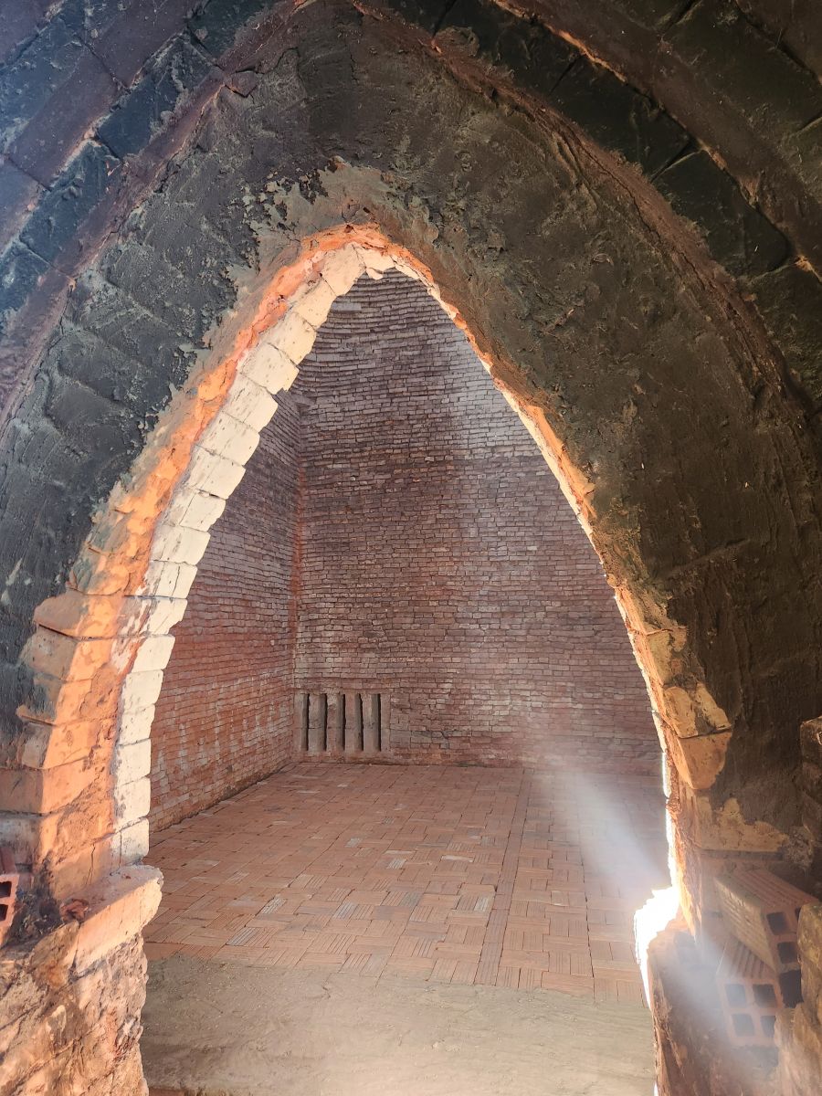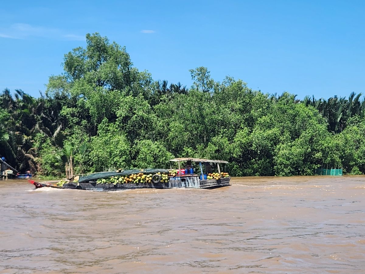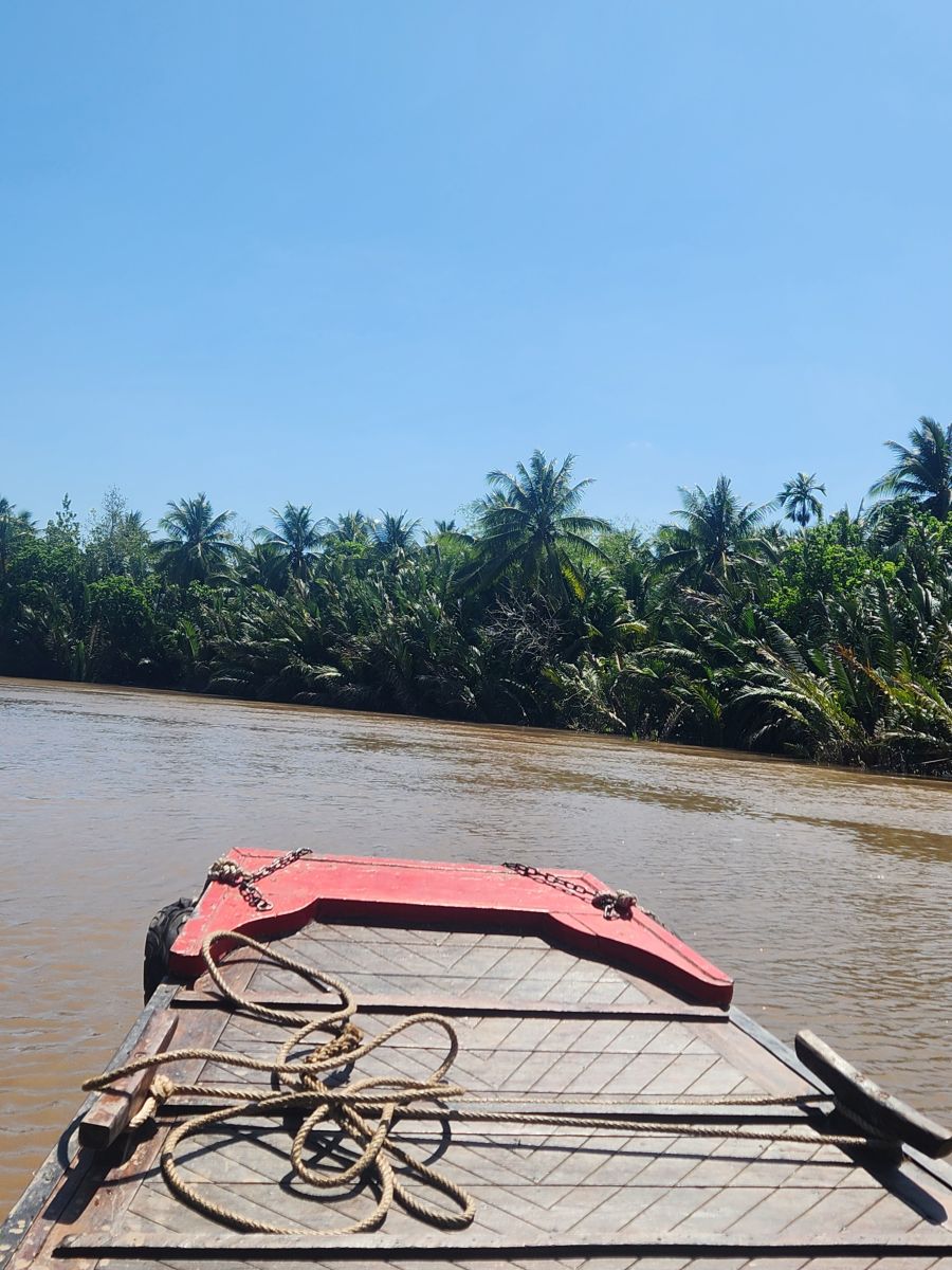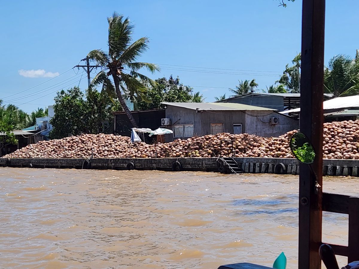 Another hour on the bus, crossing different branches of the Mekong with the now ubiquitous fish farms (I mean really, it is where all the frozen fish we buy at home comes from, so we get why the farms are everywhere!), then to a little boat dock where we board our launch to take us down the Mekong. We’re lucky enough to grab the front seats and are off down the river we go, enjoying the breeze (have I mentioned the heat??? Over 100 degrees today. Joy!), past the factories making charcoal and other things out of coconut shells to the brick factory where our adorable local “guide” (gorgeous Vietnamese woman in traditional dress who has decided to wear our bus number sticker in her hair!) leads us through the factory, while our bus guide tells us about collecting the clay from the river, how it is formed into the brick, then dried and put into the enormous kiln fired with rice husks – which we get to tour as well.
