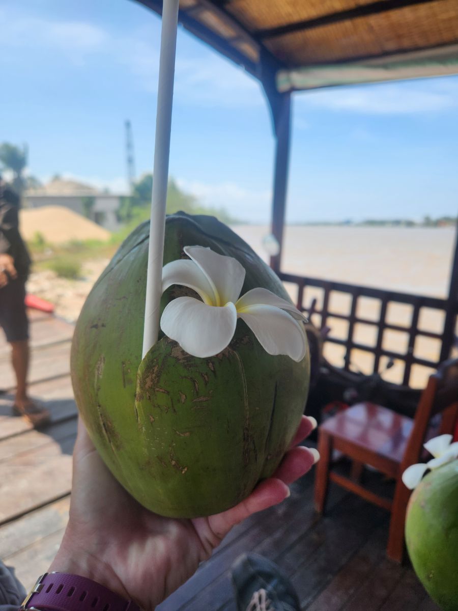 Back to the boat, we are treated with the local “beer” – actually coconut water, but it’s cute. And very well done with a pretty little lotus flower on the side. Another 20 minute ride takes us on a wide tributary of the Mekong with more fish farms and fishing nets tied up to tree trunks stuck in the middle of the river, eventually landing at the coconut factory.