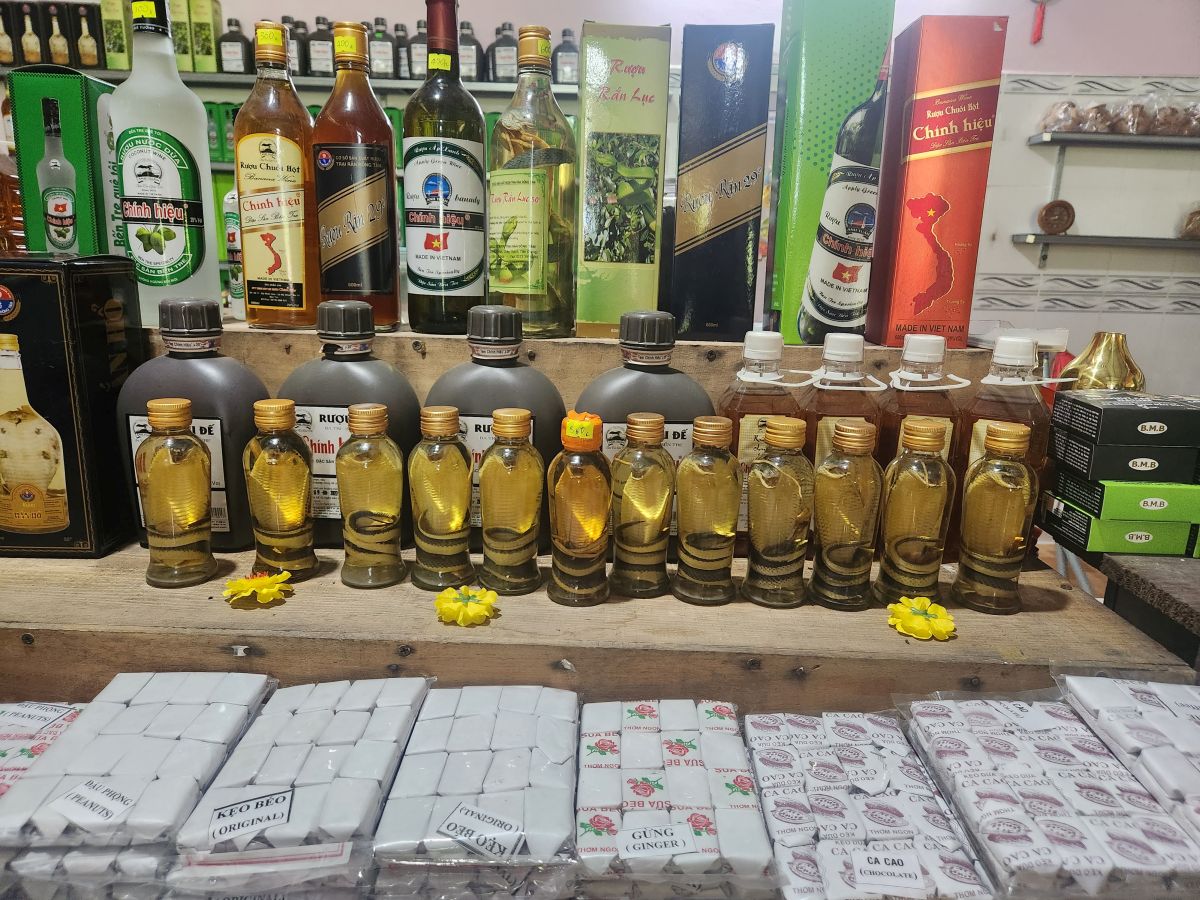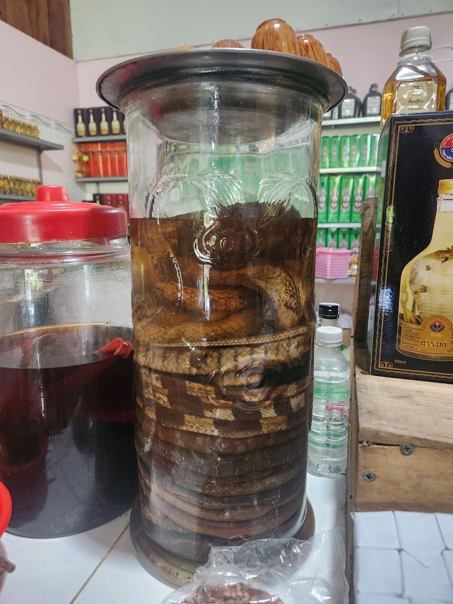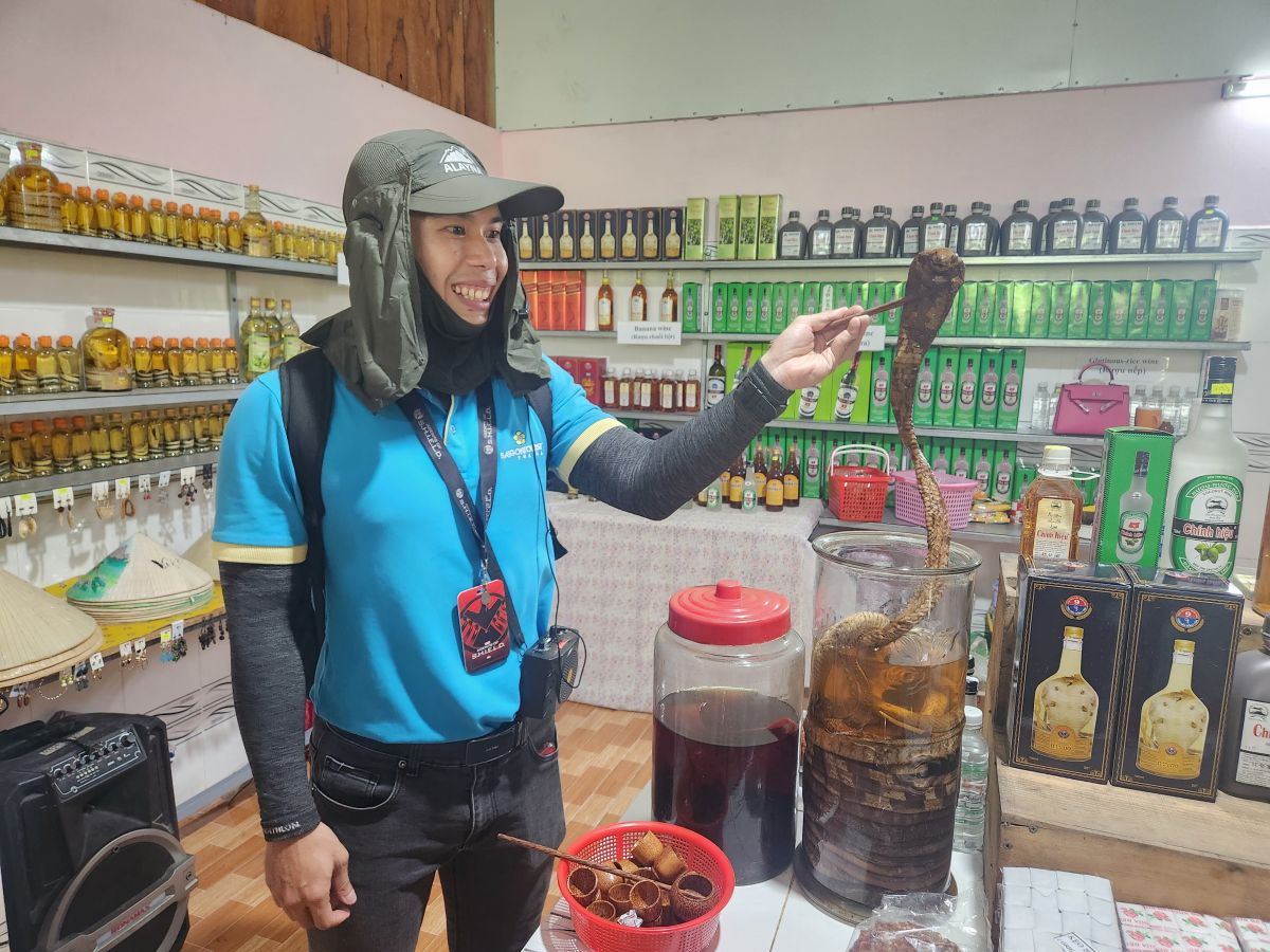 Here of course we learn how to husk a coconut and scape the insides – which we’ve seen – but more importantly we get to try “Happy Water.” Guide-boy (what else can I call him?) has been explaining Happy Water to us on the bus – it is water that has some sort of animal (think snake, rat, scorpion) or fruit in it, and buried for months to ferment. He says Vietnamese drink Happy Water every day – they must be very happy Vietnamese! The Happy Water here is of course snake wine – with a lovely Cobra inside that Guide-boy delights in showing off. He is adorable, no name or not! Ed tried some – I took a little sip and well, it’s 100% alcohol, think grain, and not my style.