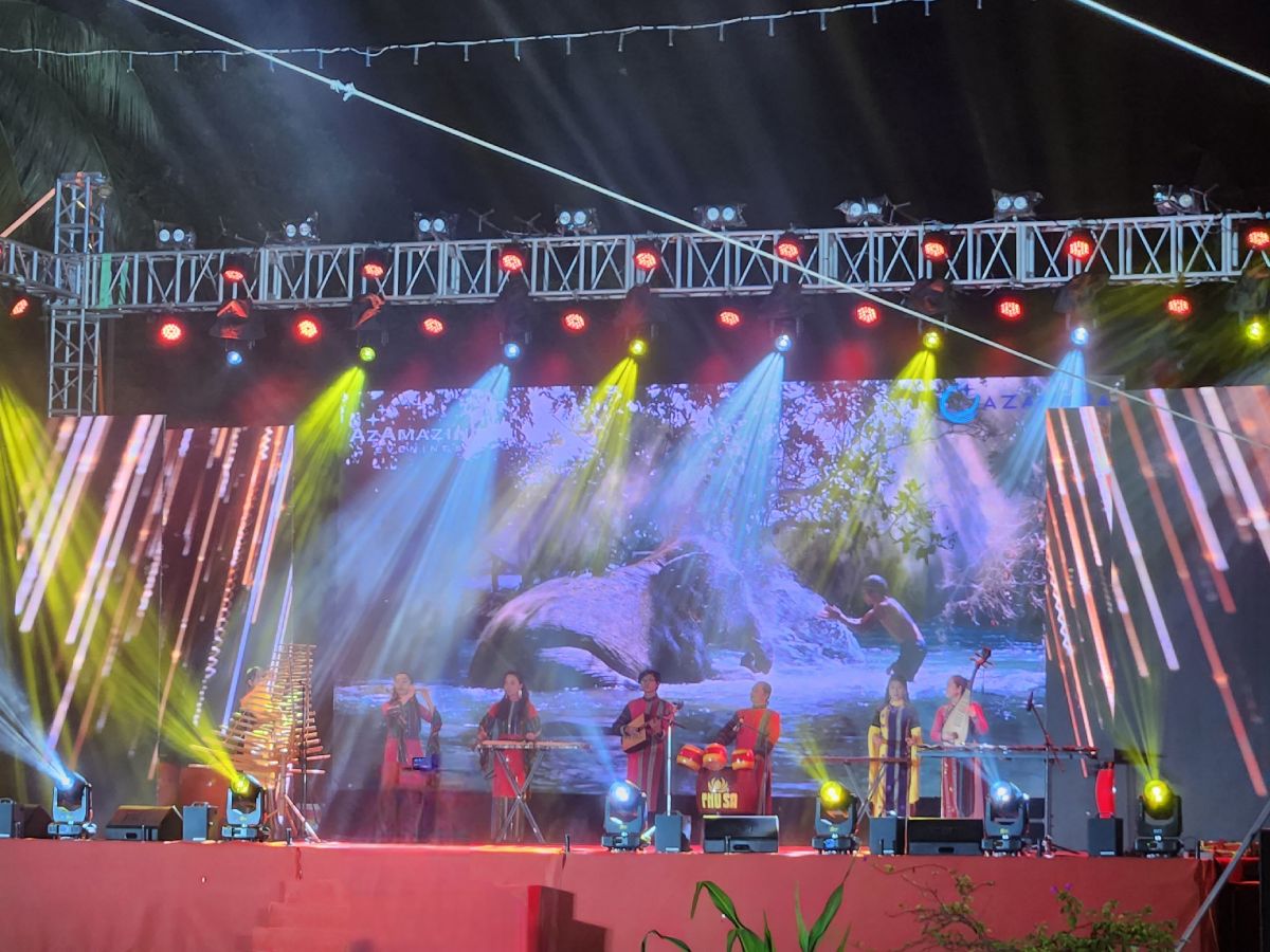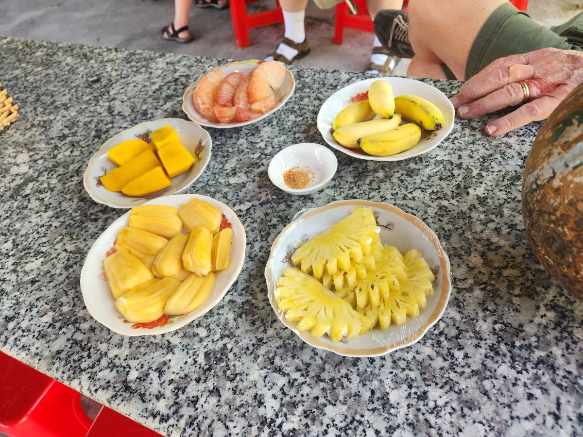 But – this place is also the coconut candy place – and we get to try a bunch of samples which makes us buy way too much of it to take back to the ship. Actually the objective is to divide it up and give it to the GR guys/gal who are so great and so overworked because of all this transition IT stuff it isn’t even funny! After shopping, we all sit down to a wonderfully refreshing fruit buffet with – ready? – jackfruit!!!! I’m in heaven and not above eating every piece of jackfruit on the plate once our tablemates are done with it. Nope, not a problem! There is also some excellent mango and pineapple and pomelo with salt – and tea – eh – you know my thoughts about tea. But all in all, an excellent little stop. And while we are snacking, we have a cultural song and dance show put on for us. Just lovely.