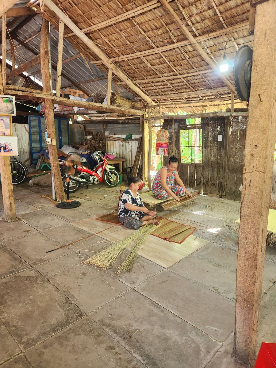 Back in the boat we head off to our next stop, passing through gorgeous trees towering over the river on a narrow little branch of the Mekong. Guide-boy gets us all to do photos on the front of the boat as we glide through the peaceful waters (so sweet! Plus, he’s really a good photographer!), then we leave the boat to hop on what Guide-boy calls “tanks.” Very cute, but they are actually sort of like motorcycle Song Theaws. Two benches facing each other on a flat bed mounted to the back of the motorcycle. The “tank” takes us to a bamboo mat maker shop, which was really interesting. We watched a demonstration, learned how it was done, how long it took to make a mat, and how little it cost. Crazy cheap for that amount of work. We actually bought 2 new sun hats made of bamboo that fold really nicely. Were they made here? Eh, who knows, but at $2 USD each, they’re a bargain and much lighter than our rain hats. We’re stylin’ now!