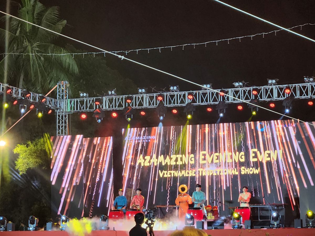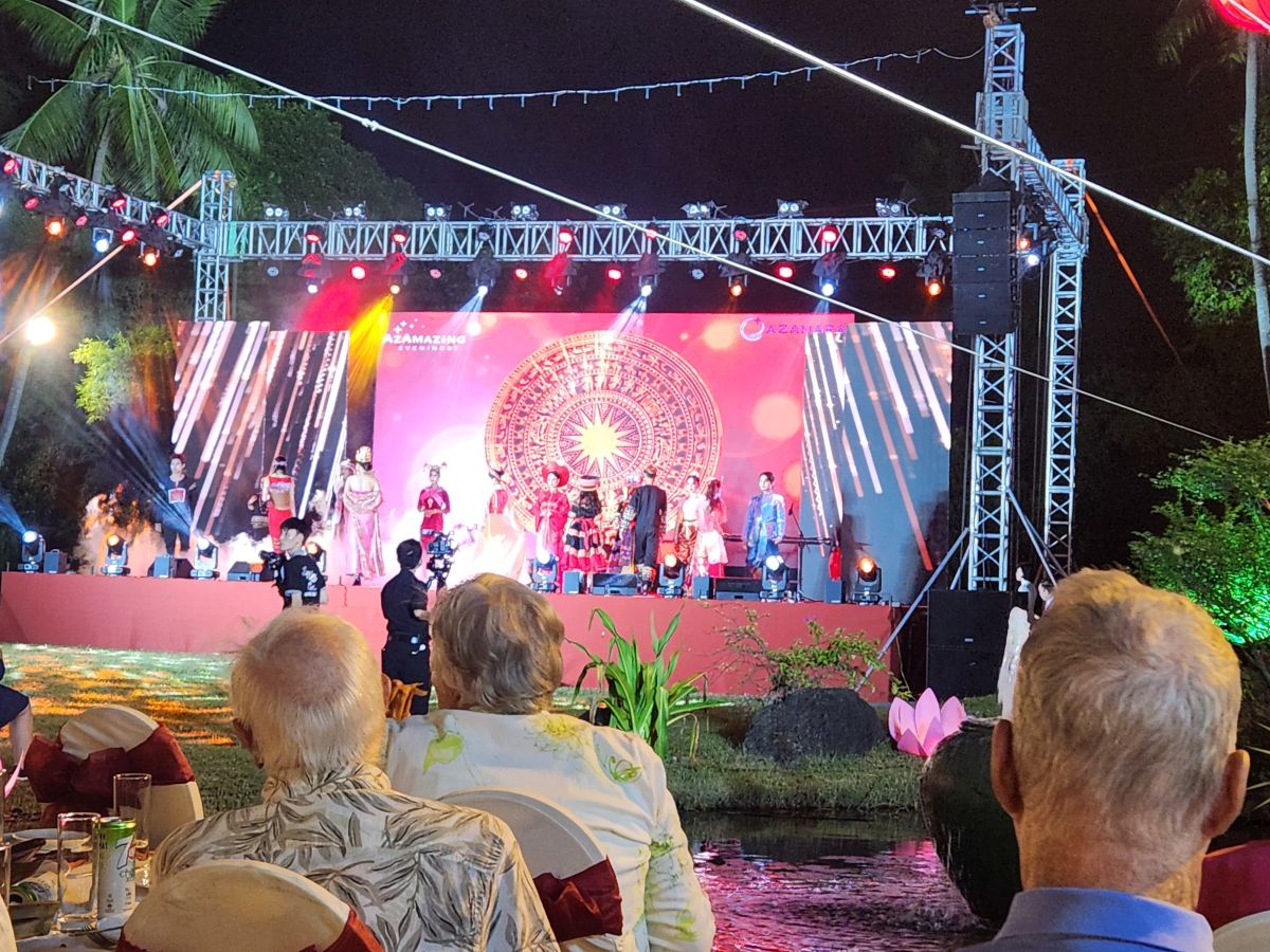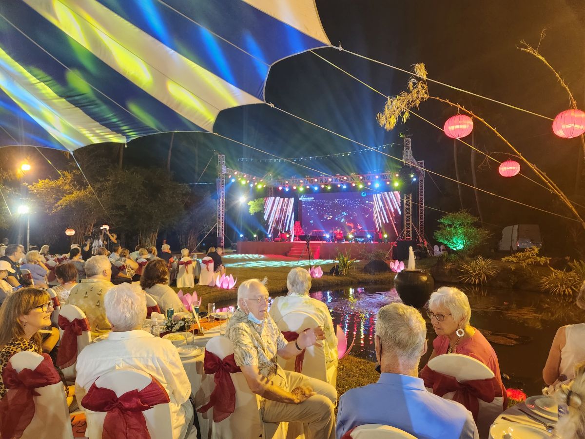 All we can say is holy cow! This is our first off-ship Azamazing Evening since the restart, and while we’ve loved all of the onboard events (they’ve been fantastic) this was spectacular. We arrive at the village – which isn’t a real village at all but a recreated village in the middle of some section of the city (it took 30 minutes to get there) – but which has the look and feel of an old ancient village, especially at night. There are lanterns and thatched roof structures and ponds with lotus flowers and just a lovely atmosphere. We are guided through the entire village, back to a huge meadow area that is reserved specifically for us. Walking down the path, passing different craft artisans who were making figurines out of sweet rice paste, a calligrapher writing out your name, origami makers and a portrait artist – all of which you could do for free. We had the calligrapher do our name before we made our way into the meadow with tables for 600, all in white linen with chairs wrapped in white and red ribbons facing a monstrous stage.
