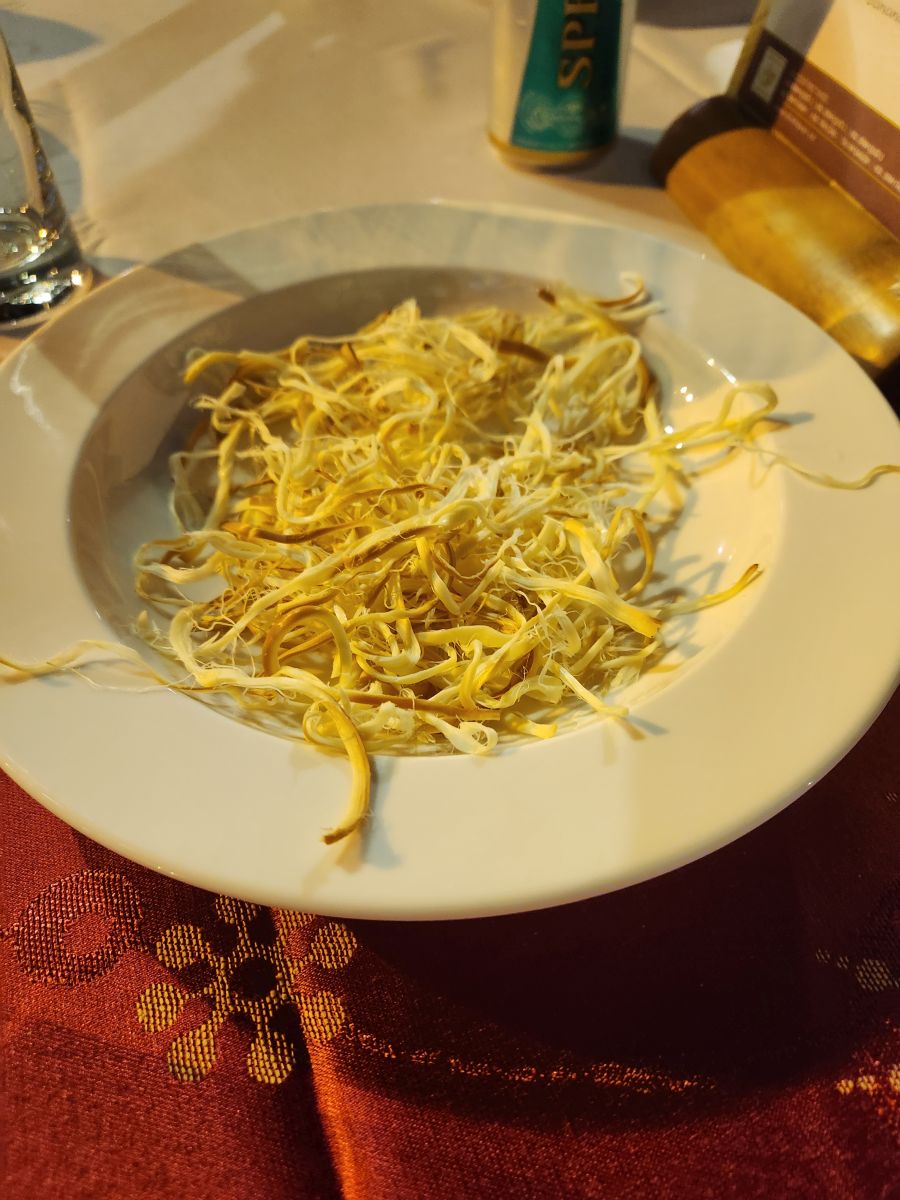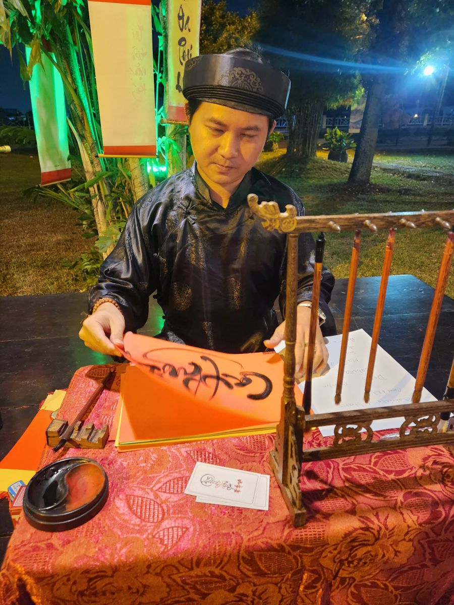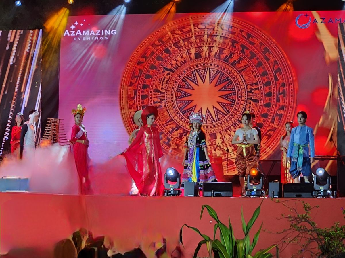 All we can say is holy cow! This is our first off-ship Azamazing Evening since the restart, and while we’ve loved all of the onboard events (they’ve been fantastic) this was spectacular. We arrive at the village – which isn’t a real village at all but a recreated village in the middle of some section of the city (it took 30 minutes to get there) – but which has the look and feel of an old ancient village, especially at night. There are lanterns and thatched roof structures and ponds with lotus flowers and just a lovely atmosphere. We are guided through the entire village, back to a huge meadow area that is reserved specifically for us. Walking down the path, passing different craft artisans who were making figurines out of sweet rice paste, a calligrapher writing out your name, origami makers and a portrait artist – all of which you could do for free. We had the calligrapher do our name before we made our way into the meadow with tables for 600, all in white linen with chairs wrapped in white and red ribbons facing a monstrous stage.
