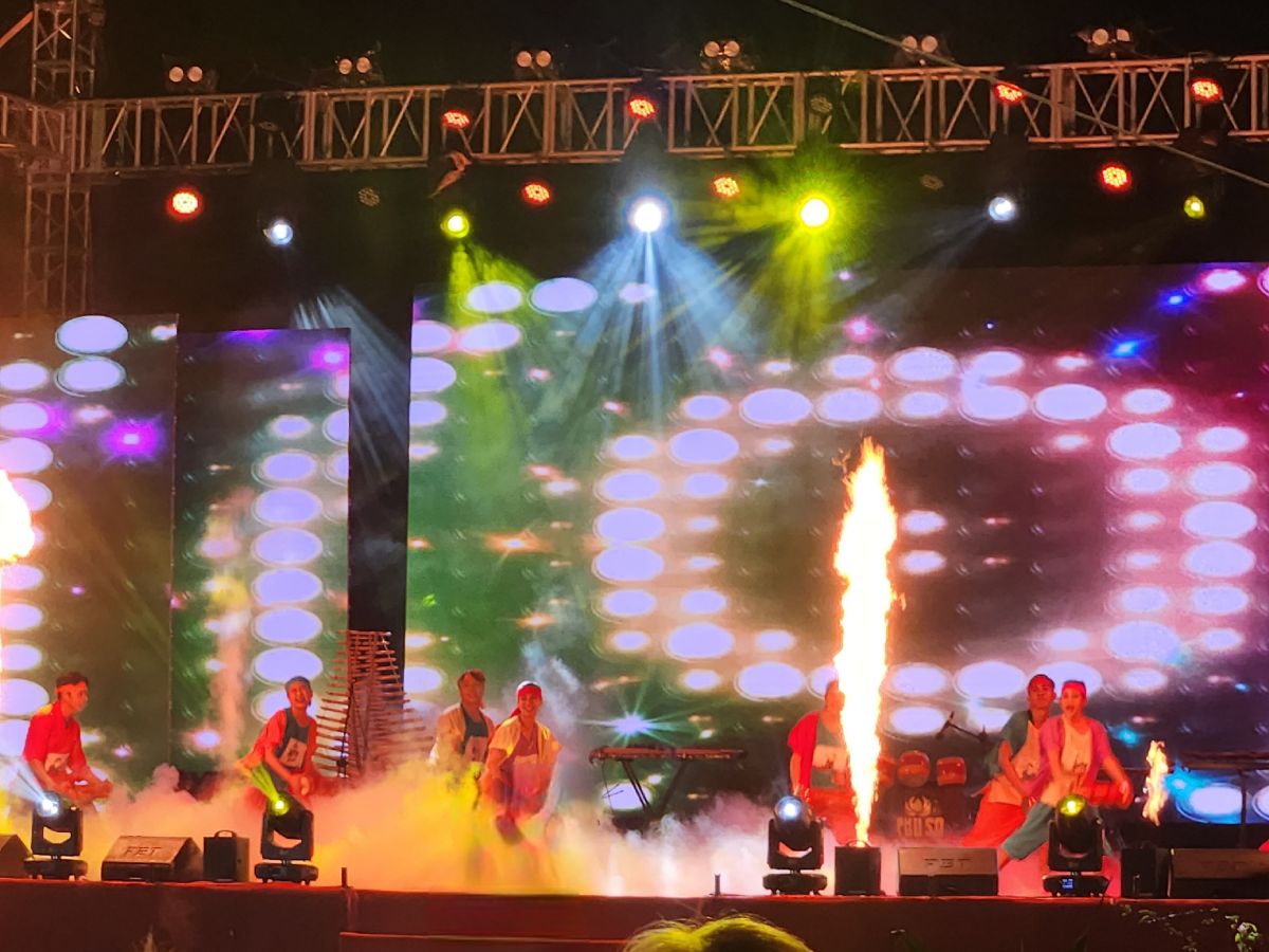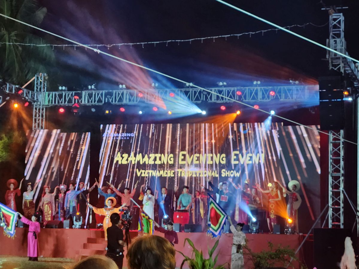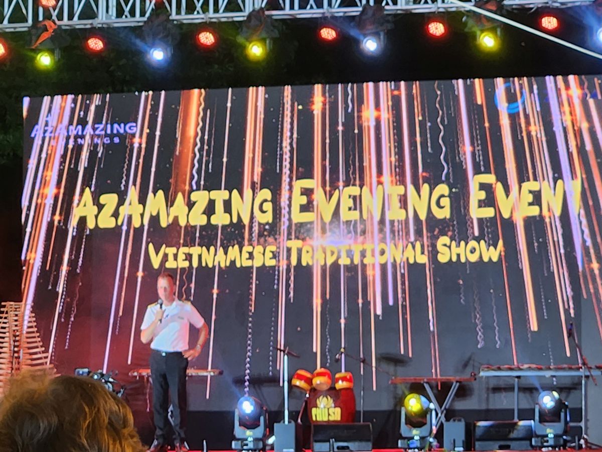The show that ensued was definitely a “wow” as they described it in the daily Insider program. Captain Jonas introduced the show – amidst an incredible fireworks display – one of which was a rocket that launched right near us and shot out directly at the stage (we have no idea how he didn’t even flinch at that!) – which contained about 6 different music, dancing and fashion show acts, all directed by a famous Vietnamese director, Tran Minh Cuong. During the show, we were treated to local snacks of smoked cheese, fried sticky rice and nuts and fruit as well as 2 drinks. The finale was another famous artist called Duc Dau who sang and danced for us to the final accompaniment of more fireworks.