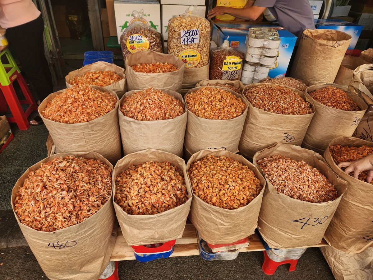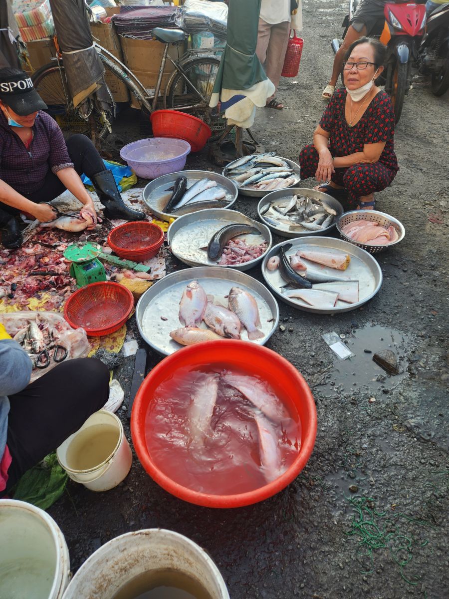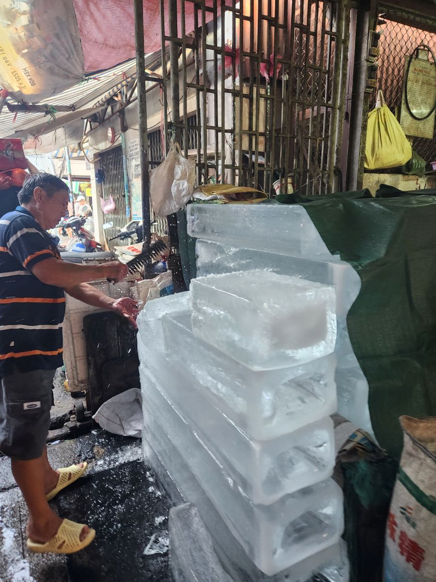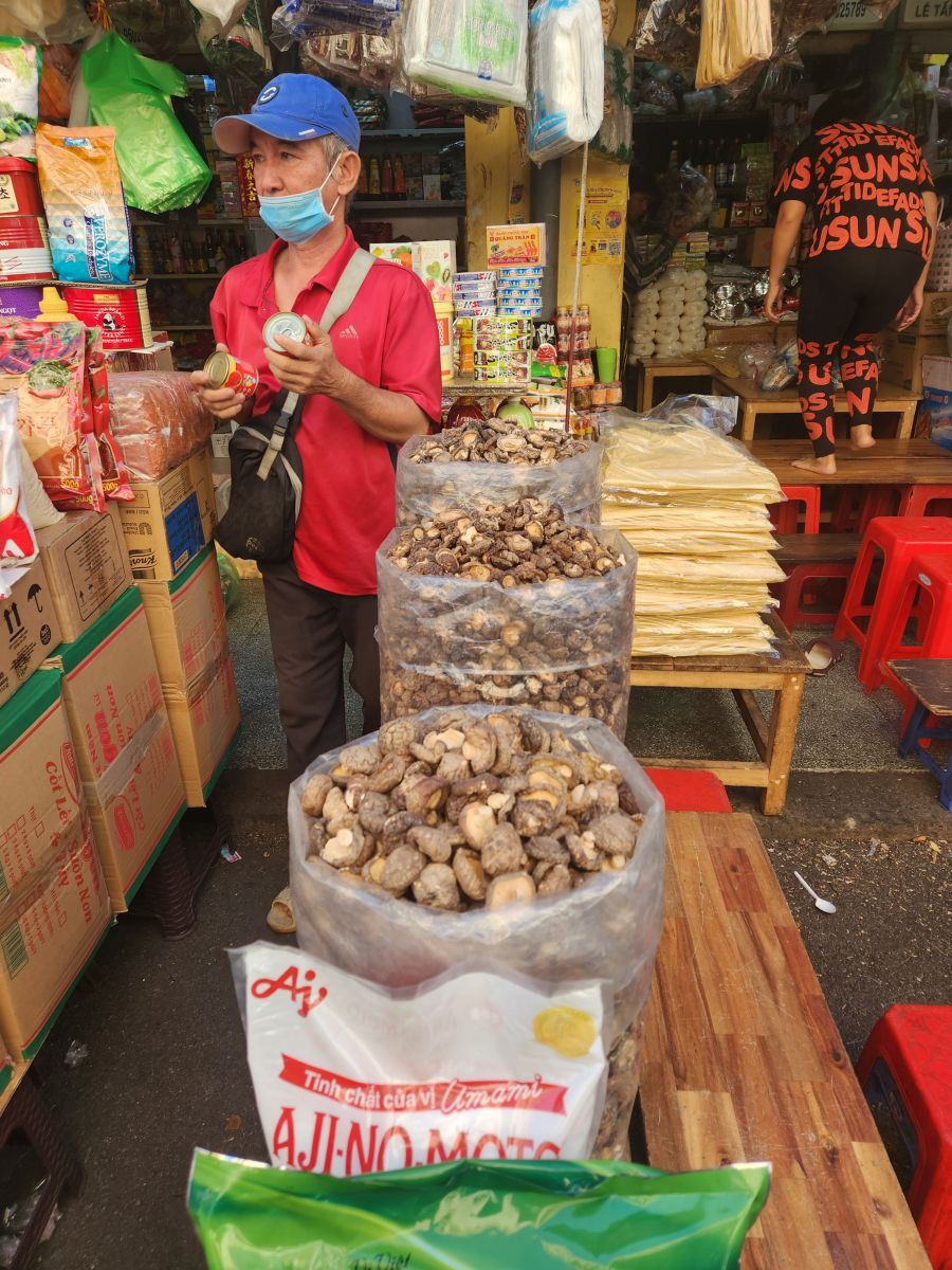 We are finally off on our tour, heading first the Binh Tay market which has been explained as an excellent place to try street food. Hmmmm….we were hoping to go here last so we could at least get some local lunch, but as it turns out, there isn’t really any street food here. It is more local market with huge bags of dried goods, candy, and assorted other items that you would mostly buy wholesale. It is very much like Wararot Market in Chiang Mai, just not as many produce vendors. And because it is so early in the morning, not everything is open yet. So we end up walking through stalls and stalls of bagged nuts, dried shrimp (in all different sizes, there are some huge ones here – not at all like what we are used to using from Thailand), dried mushrooms and then the fish market area with all the live fish in the big round tin buckets. We also wander through the clothing area upstairs, which is pretty empty because no one is open yet, then back down, passing the ice vendor who is chopping up the ice with a huge nasty looking ice pick/knife, and out into an open courtyard with a beautiful shrine (where some local guy is taking all the mandarin oranges that have been left as offerings!).