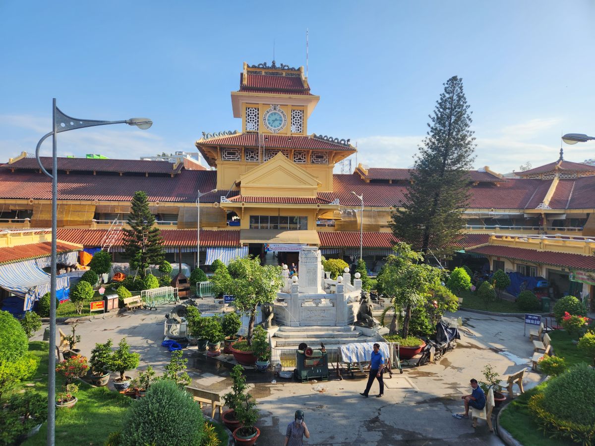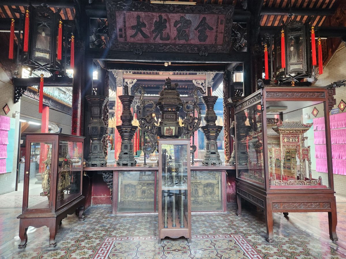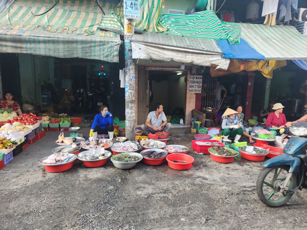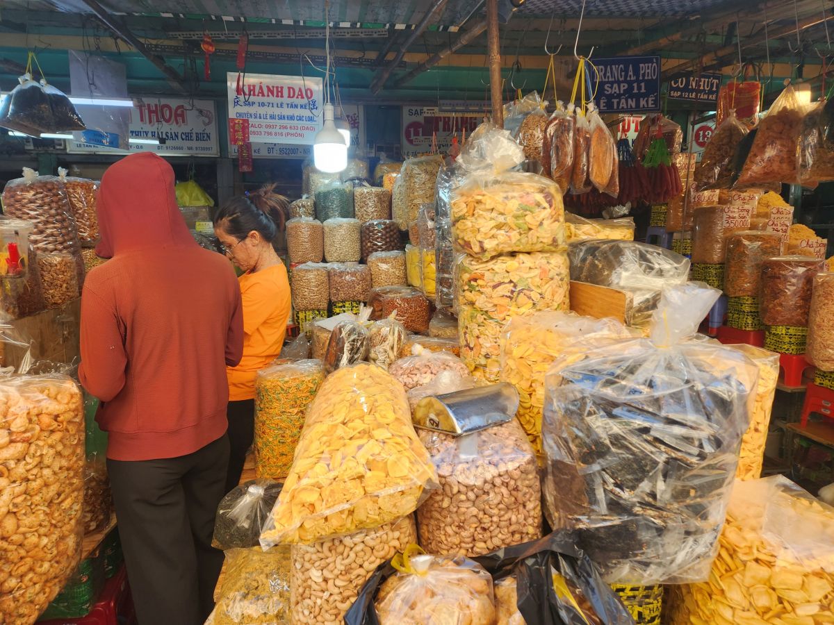 We are finally off on our tour, heading first the Binh Tay market which has been explained as an excellent place to try street food. Hmmmm….we were hoping to go here last so we could at least get some local lunch, but as it turns out, there isn’t really any street food here. It is more local market with huge bags of dried goods, candy, and assorted other items that you would mostly buy wholesale. It is very much like Wararot Market in Chiang Mai, just not as many produce vendors. And because it is so early in the morning, not everything is open yet. So we end up walking through stalls and stalls of bagged nuts, dried shrimp (in all different sizes, there are some huge ones here – not at all like what we are used to using from Thailand), dried mushrooms and then the fish market area with all the live fish in the big round tin buckets. We also wander through the clothing area upstairs, which is pretty empty because no one is open yet, then back down, passing the ice vendor who is chopping up the ice with a huge nasty looking ice pick/knife, and out into an open courtyard with a beautiful shrine (where some local guy is taking all the mandarin oranges that have been left as offerings!).
