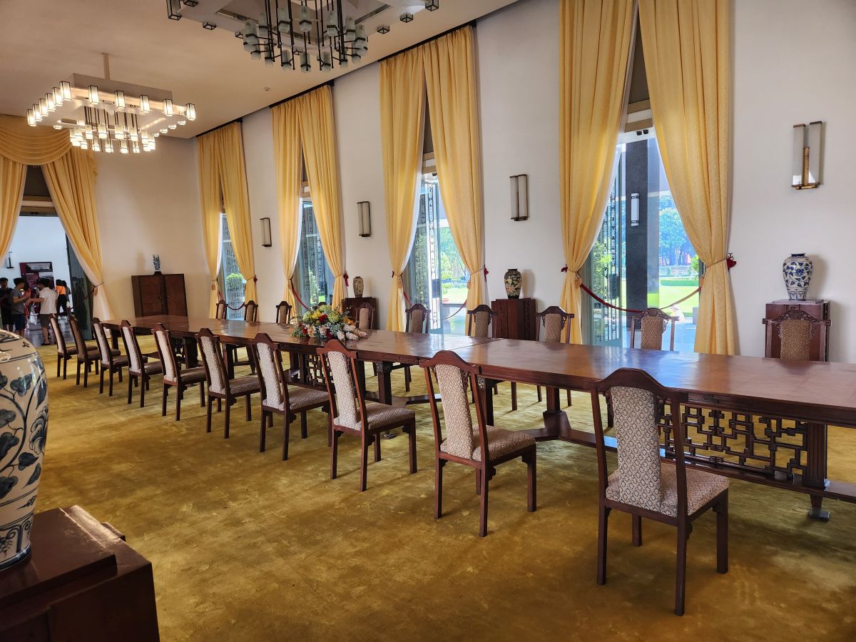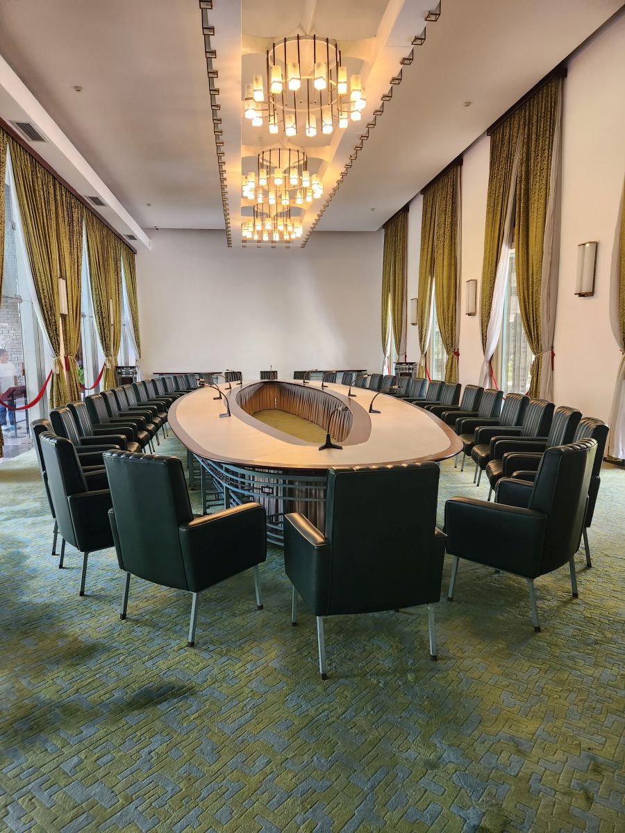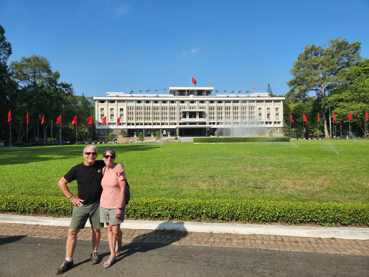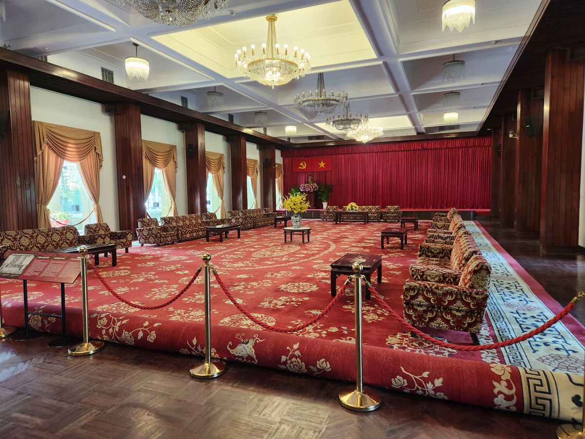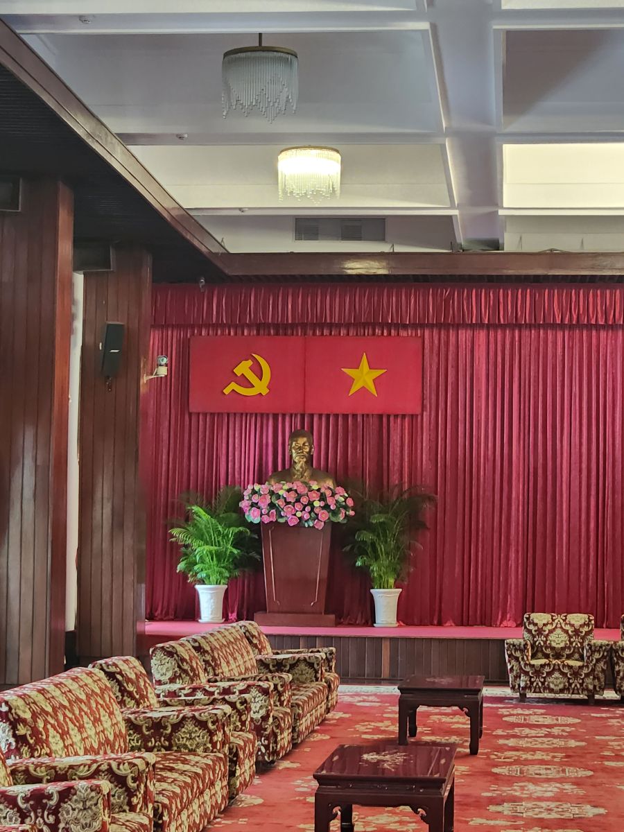 Then it is on to what we feel is the main event, the Independence Palace, or what is commonly known as the Reunification Palace. This is the site of the fall of Saigon where the North Vietnamese Army crashed a tank into the gates. We’d just driven by this on previous visits, so actually visiting was a big draw of this tour. Entering at the ellipse drive, we have a photo session in front of the Palace with Kingsley playing photographer again – then we all troop into the Palace.