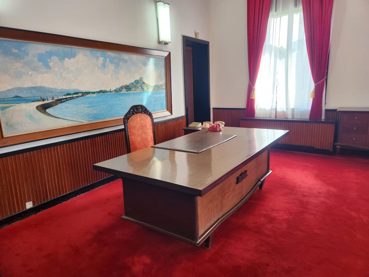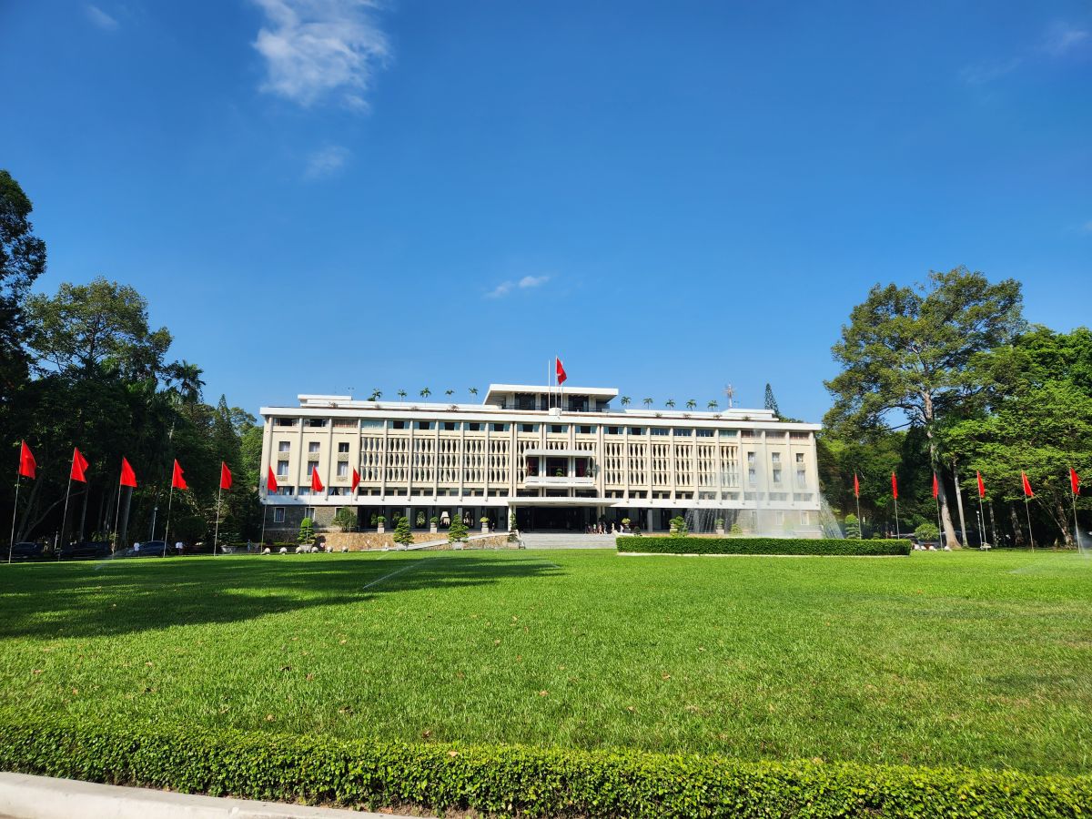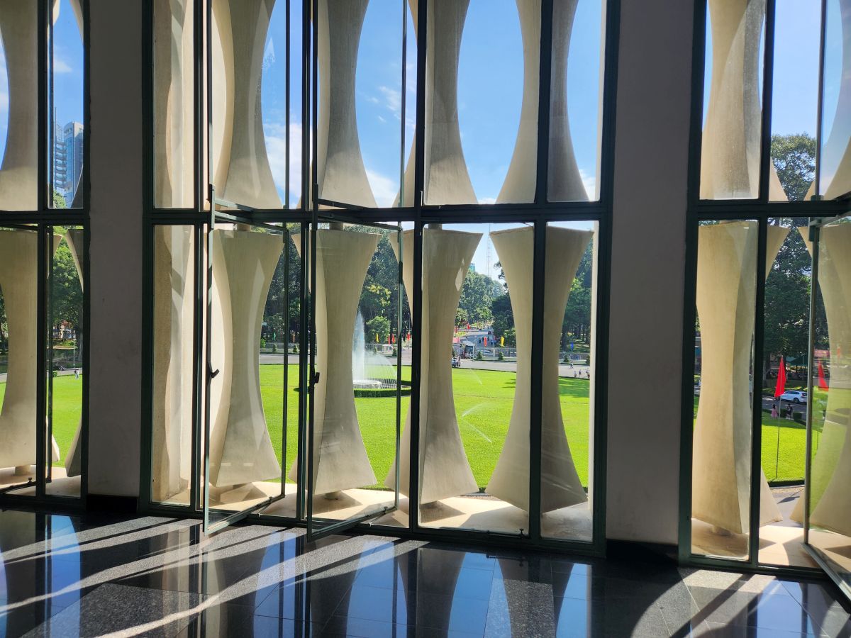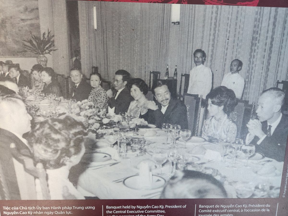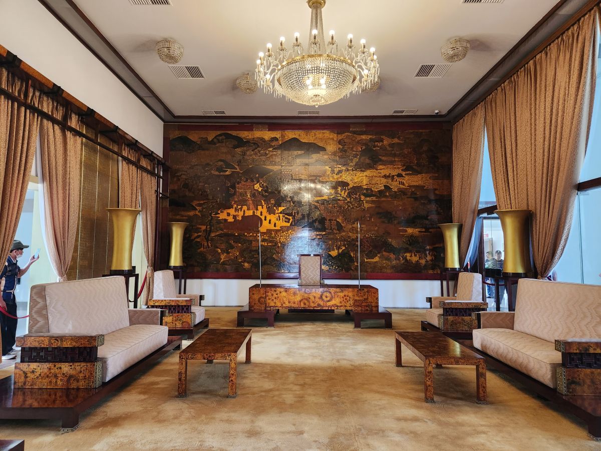 Then it is on to what we feel is the main event, the Independence Palace, or what is commonly known as the Reunification Palace. This is the site of the fall of Saigon where the North Vietnamese Army crashed a tank into the gates. We’d just driven by this on previous visits, so actually visiting was a big draw of this tour. Entering at the ellipse drive, we have a photo session in front of the Palace with Kingsley playing photographer again – then we all troop into the Palace.