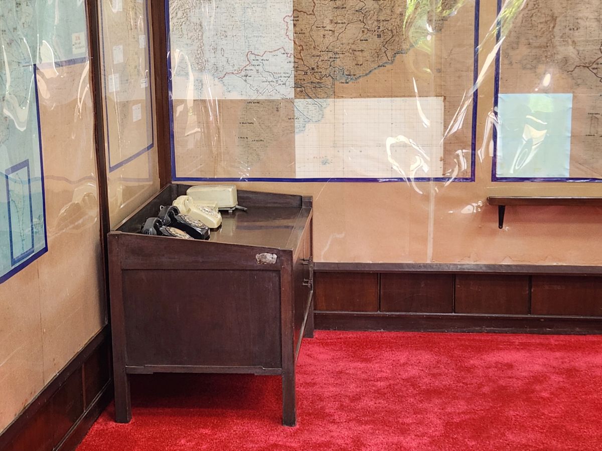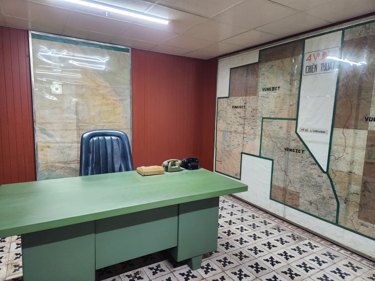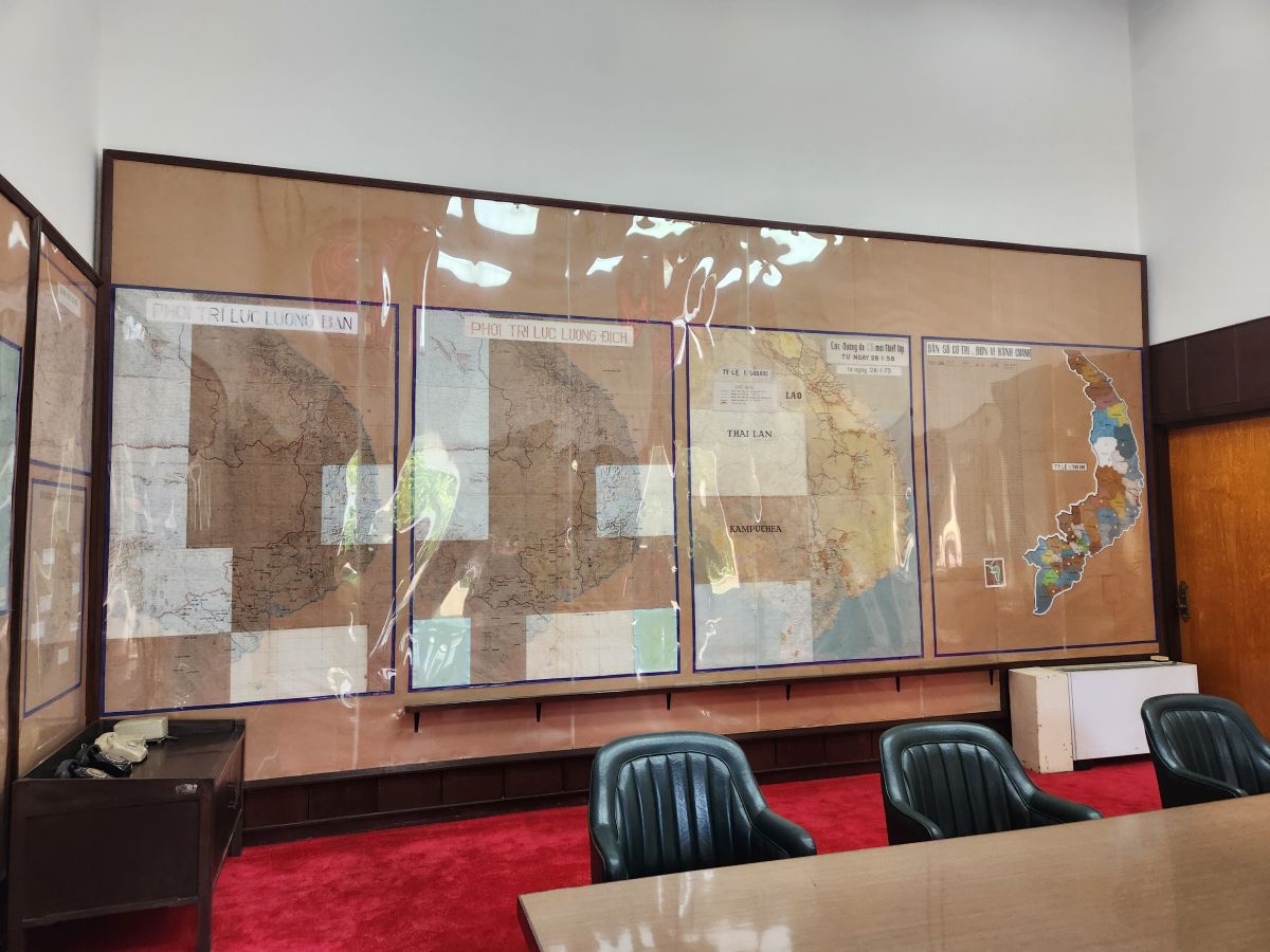 Probably the best part of this tour though were the tunnels underneath the palace, which were created for security from bombings that happened during the war. Even though it is down a lot of stairs with no elevator (stairs! More stairs! Yeah, the others are already grumbling) we manage to get most of our group down here and together to tour the different rooms that are essentially war rooms. This is where everyone worked and managed the war during the fighting. There is the President’s war room, essentially the situation room, with maps and these ancient old rotary phones and an adjacent room with a bed for him to sleep. There are rooms full of old standard typewriters and ancient radio transmitters and then another map room with detailed numbers of troops on the ground in 1968. It is all pretty cool and neat to be actually walking these halls (albeit crowded halls!!!).