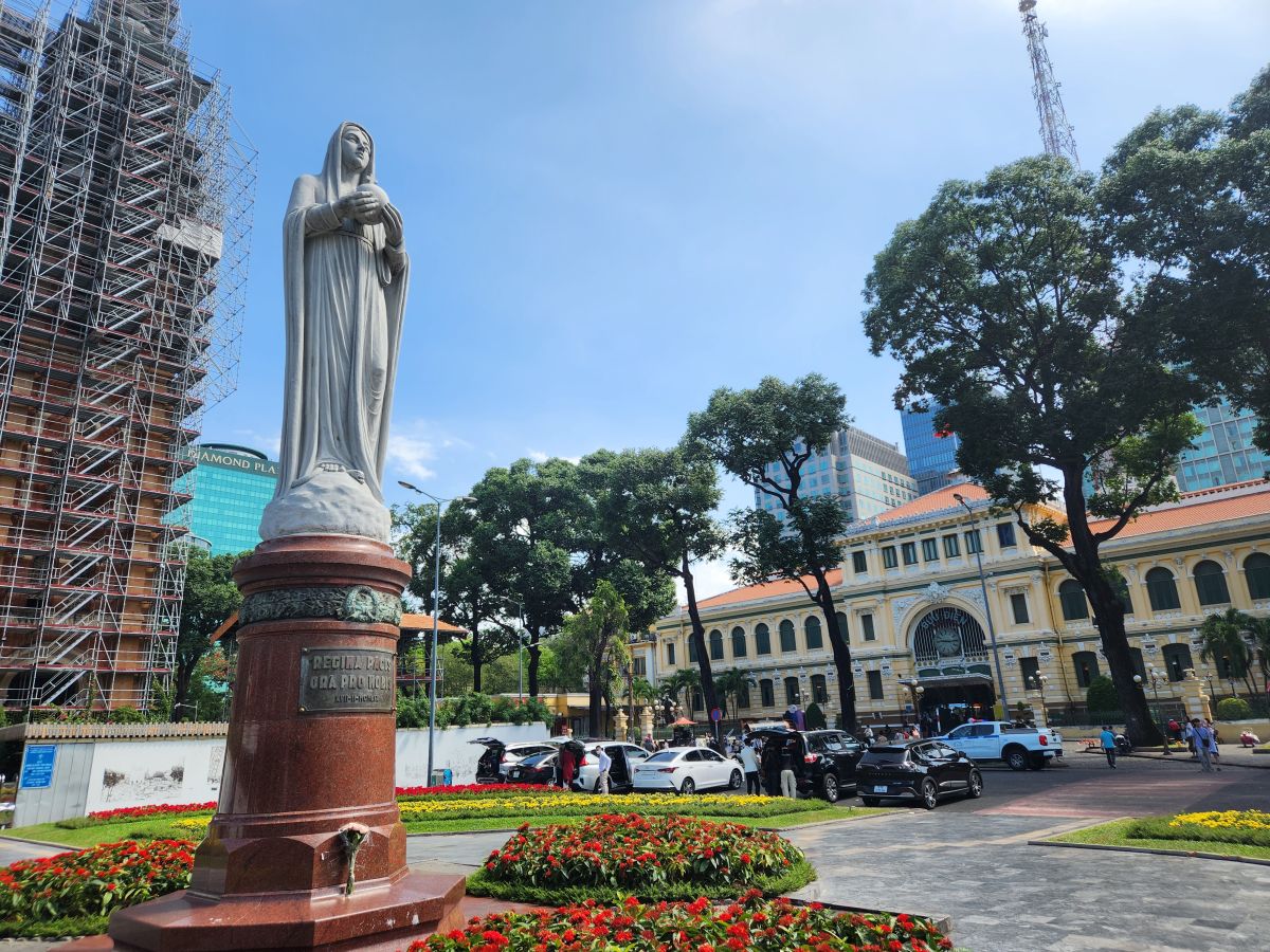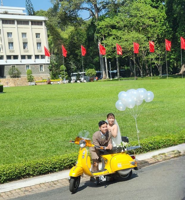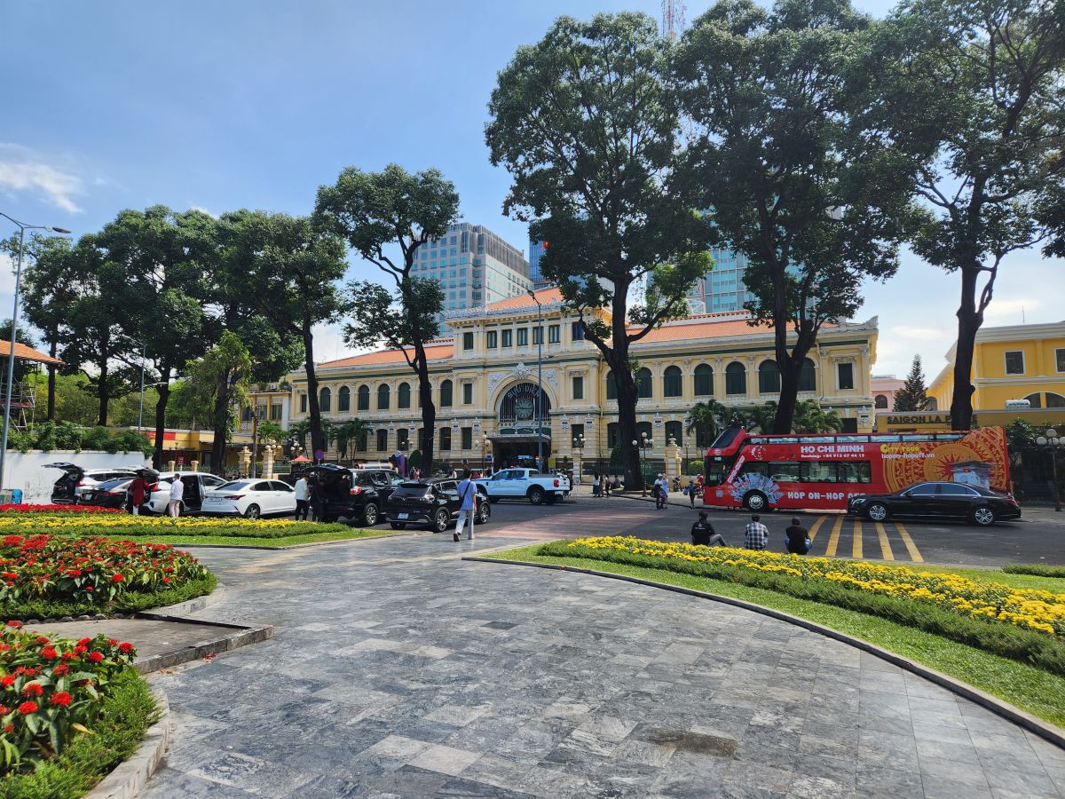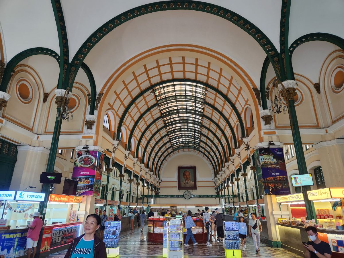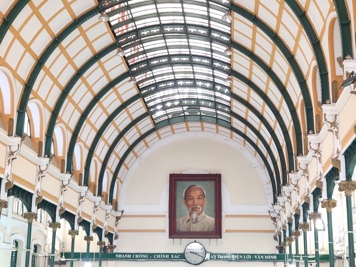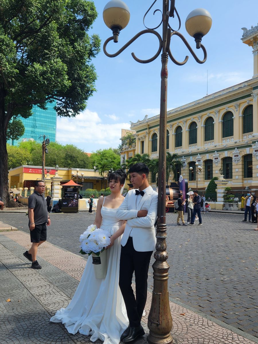 Then we are off to the Notre Dame cathedral, which is under renovation so we can’t go into visit, but we can take some photos from the garden out front. Crossing the street, we enter the Post Office building, which was originally the train station with the huge soaring ceilings and the picture of Ho Chi Minh at the back. Taking our leave, yet another bride and groom are posing outside. Obviously the wedding season has descended upon Saigon!