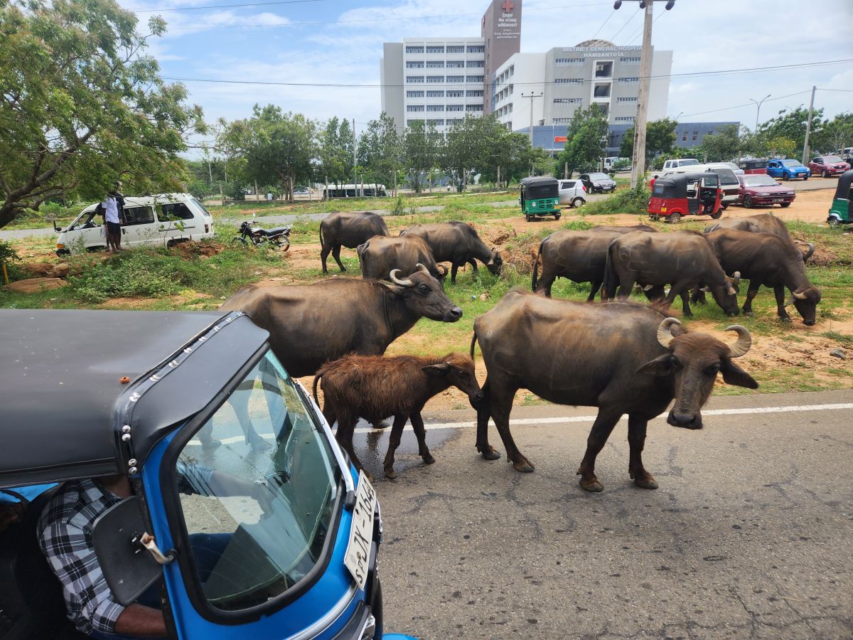 Finally uniting with Ramesh and his driver (whose name we never quite got), we hop into the open air jeep and start our long journey towards the park. Oh, this is fun! It is really hot and humid here, but surprisingly, in the jeep, with all the wind, it is actually quite pleasant. Plus, bouncing around in the back here, we get to watch the world go by. At first that world is just empty – seriously, when I said we were in the middle of nowhere at this port – I didn’t realize just how correct that statement was! We bounce around for miles with nothing on either side of us besides fields, empty roads and the occasional tuk-tuk. Approaching the hospital, we start to see more…well..not exactly civilization – more like more Water Buffalo! Everywhere walking down the road, across the road, in herds, alone. Craziness!