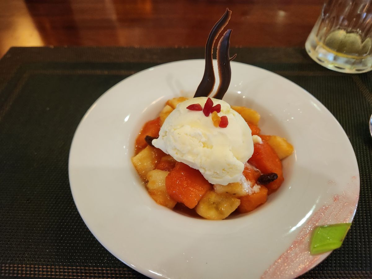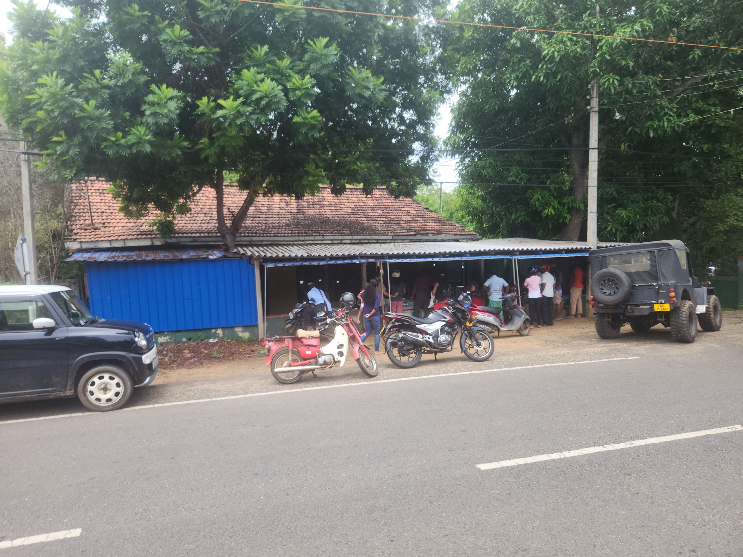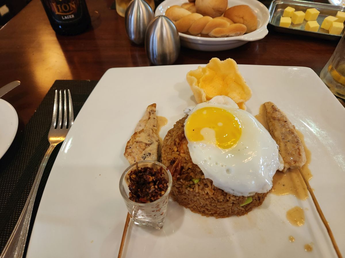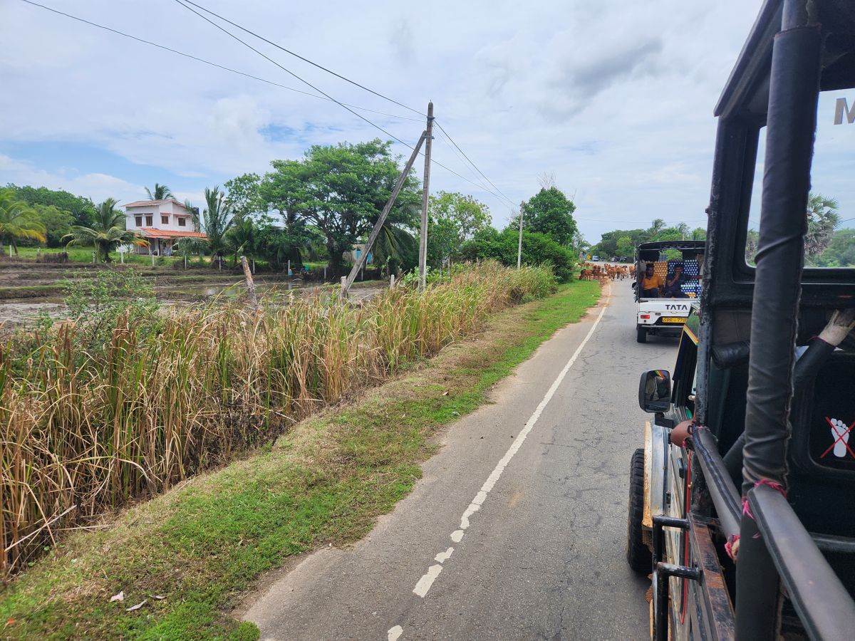 Continuing our drive past a lovely lake, we eventually end up at Chaarya resort and spa for our lunch break. Ramesh escorts us in, tells us he is going home for lunch (guess the seafood was for Ramesh and family’s lunch) and for us to call him when we are finished. Ok then. Chaarya turns out to be a lovely resort, and when we arrive, we have the dining room all to ourselves! The lunch is prix fixe, each course with a choice of 2 different Sri Lankan options. Well, heck, we want to try it all, so we just order one of each. Works perfectly – then we share! What comes next is a smorgasbord of food – all excellent but oh so much! We start with Chicken spring rolls (chock full of chicken and excellent spices) and a watermelon and cheese sort of salad with a nice dressing (very good), then share vegetable and chicken and egg soup (both fantastic), move on the main course (yeah, I’m already stuffed) of lime marinated grilled fish (which is so huge, it’s crazy) and prawn and chicken Nasi Goreng with chicken satay (again, massive, and totally excellent and I wouldn’t have been able to finish it if it was the only thing we were served! And why did they include satay? For heavens sakes, the Nasi Goreng was enough!), finishing the meal with Curd & Trickle (which is essentially yogurt and a sweet syrup drizzle) and fruit salad with ice cream (really refreshingly good, the ice cream was rich but not heavy, excellent). Yeah, well, it was included! Fantastic meal – and we are so stuffed – but all we have to do is ride in the back of the jeep and maybe the bouncing will work off some of our food!