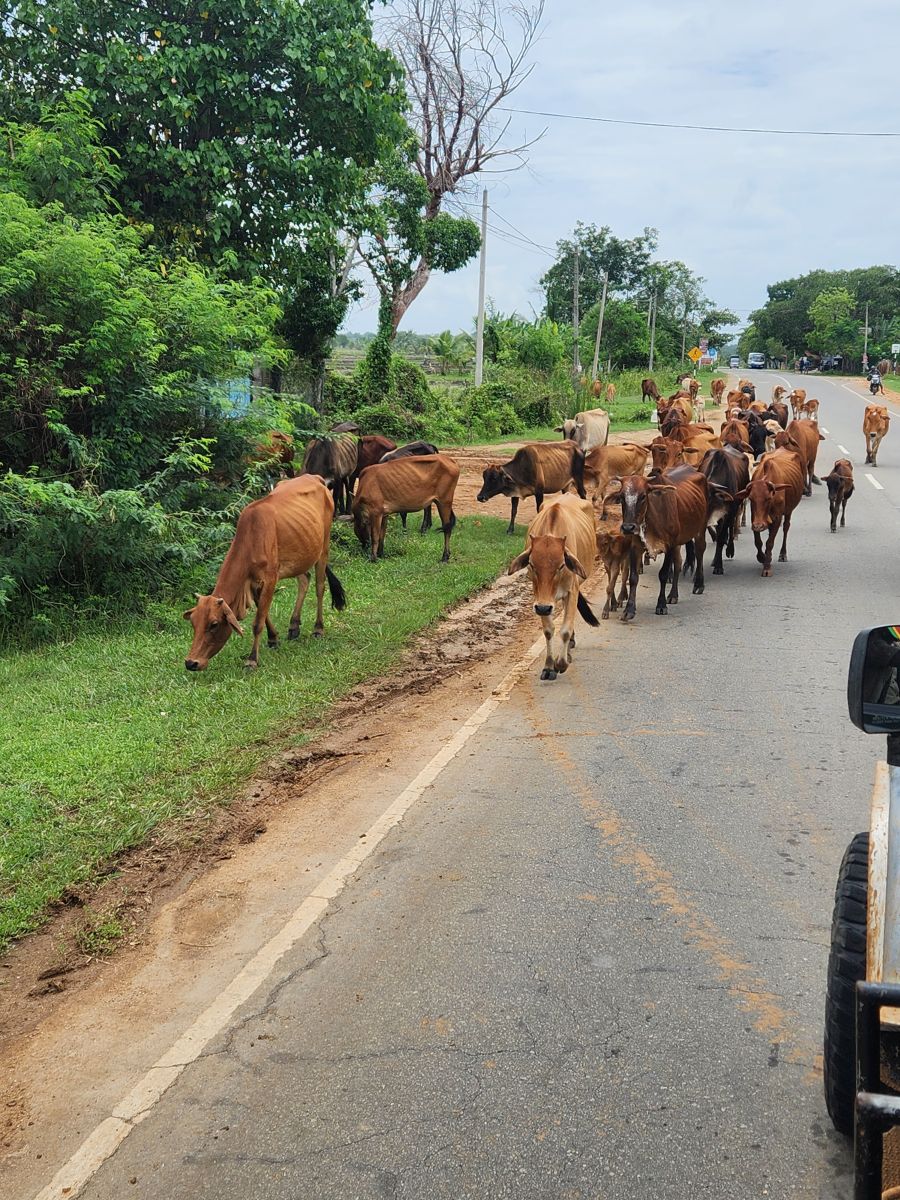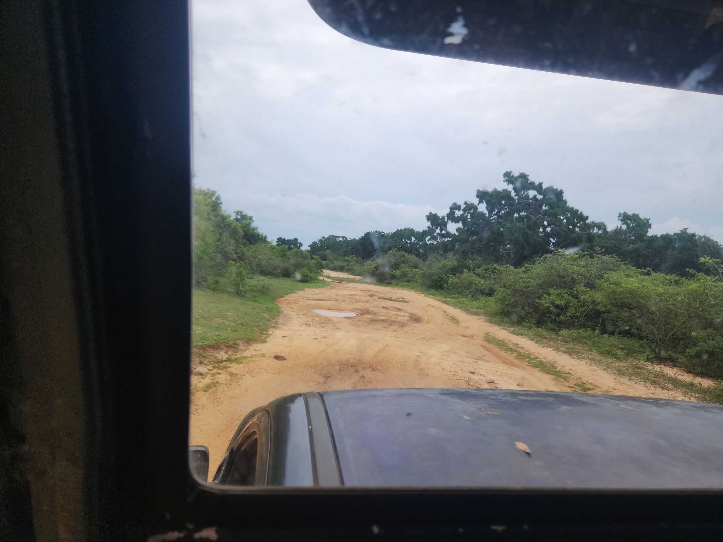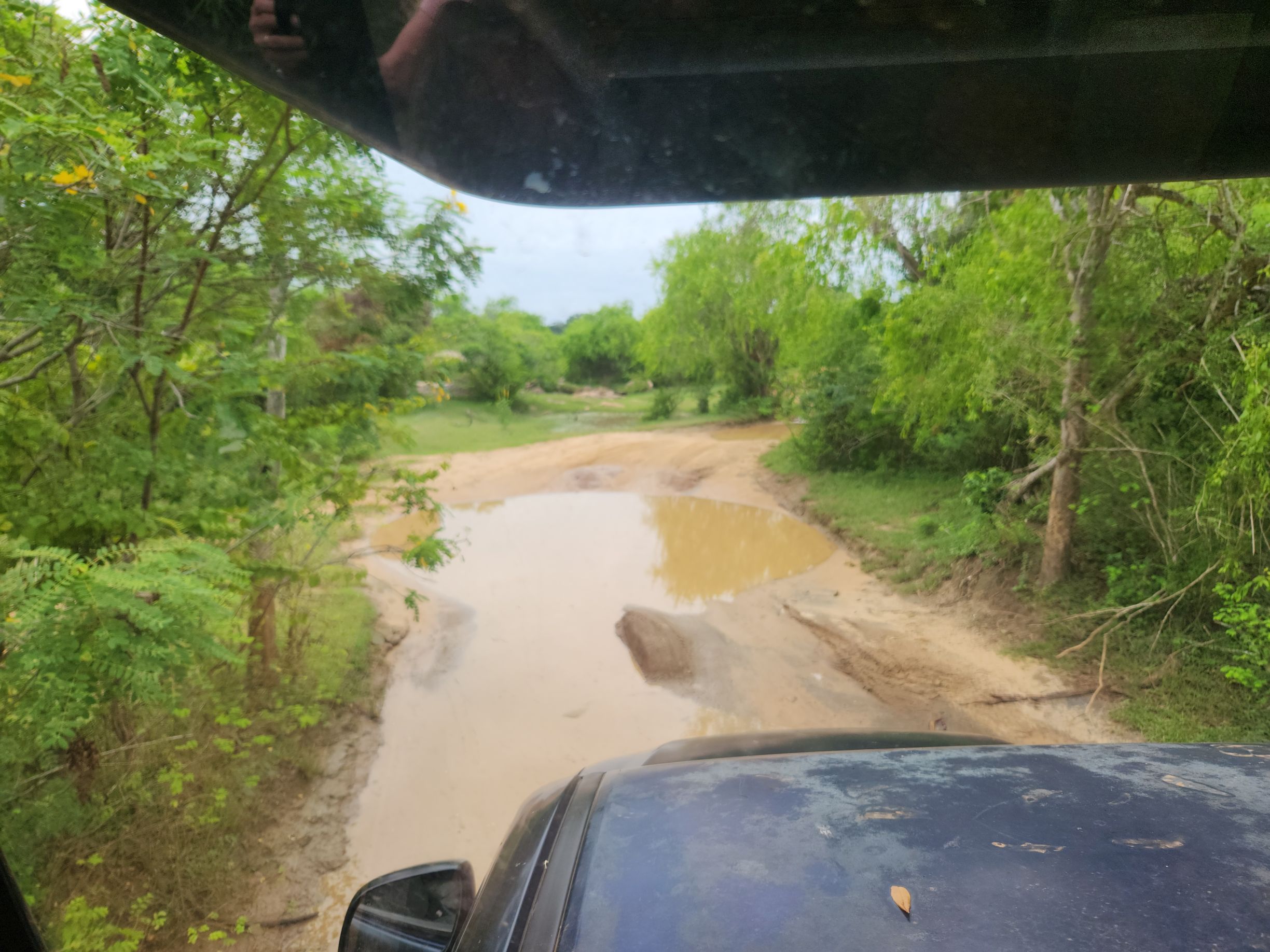And boogie we do – oh boy do we boogie. We can’t go fast in the park, but outside? Different story. Our driver is hauling ass, only slowing down for the biggest of the speed bumps (which strangely enough there are tons out here in the middle of nowhere with no traffic or pedestrians to be found – for the wildlife maybe?), blowing his horn at every scooter and tuk tuk and truck or bus that gets in our way, swerving around obstacles, barely slowing for the cows. Oh boy! And did I mention the rain? No? Well, during our little run from the park, it starts to pour – remember we’re in an open air jeep! We have a roof, sure, and a front windscreen, but there are gaps between everything and the superstructure holding it together, so you we are getting a refreshing little shower along the way. Hey, we always want adventure….
