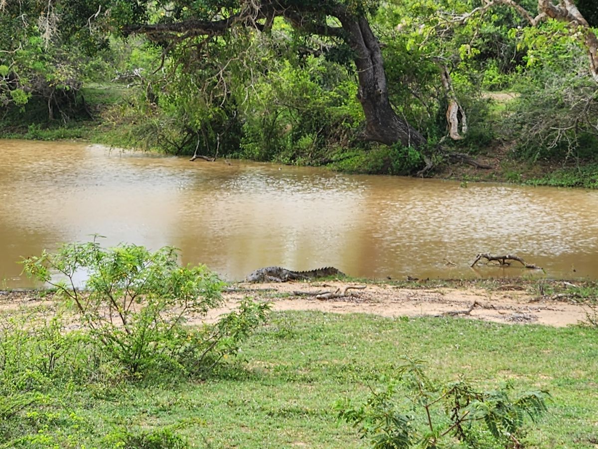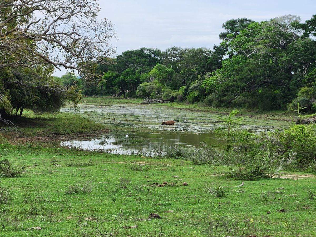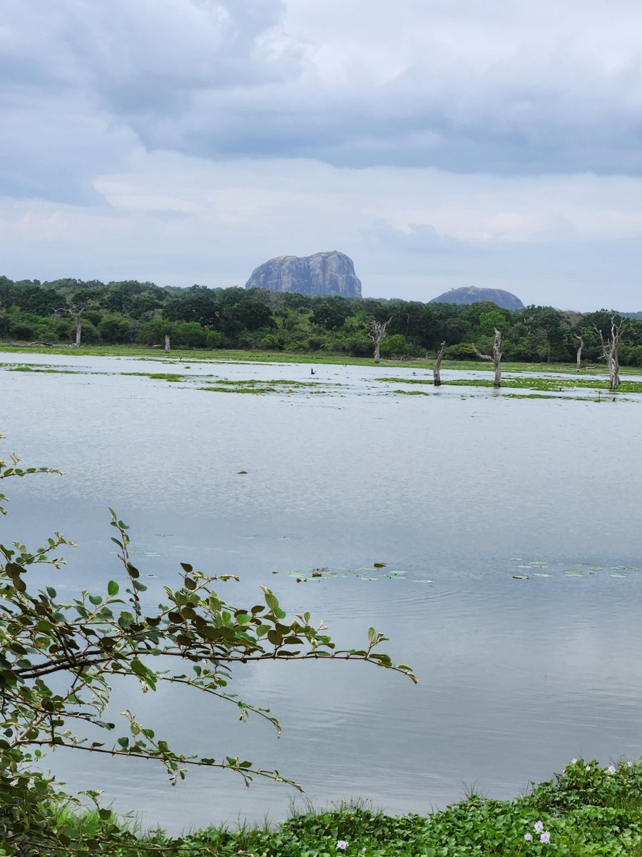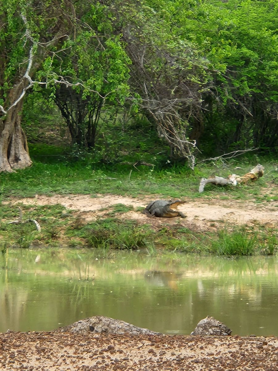 Pushing on, we pass lots of beautiful rock formations and gorgeous parkland scenery, coming upon a dung beetle pushing it’s treasure across the road. Those little things are amazing! Then a Sri Lanka Bee Bird – which is beautiful but who would ever have seen it on that tree where it sort of blends in! And on to spotted deer and water buffalo and a huge crocodile resting on the banks of a lagoon.