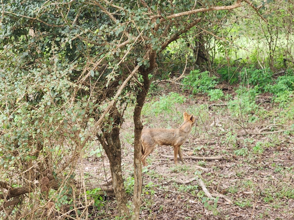 Then another gorgeous lotus filled pond, wild boars, beautiful scenic vistas across a large lake, a monitor lizard lounging in the sun (well, clouds, but still), then a jackal on the road and in the bush and an elephant! In the distance where we get the typical elephant butt picture, but also a great side view back there in trees. And a full antlered buck in the bush.