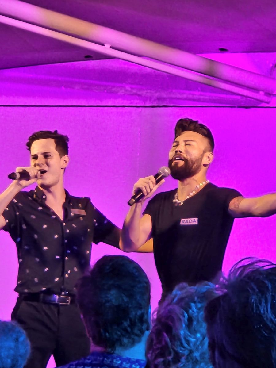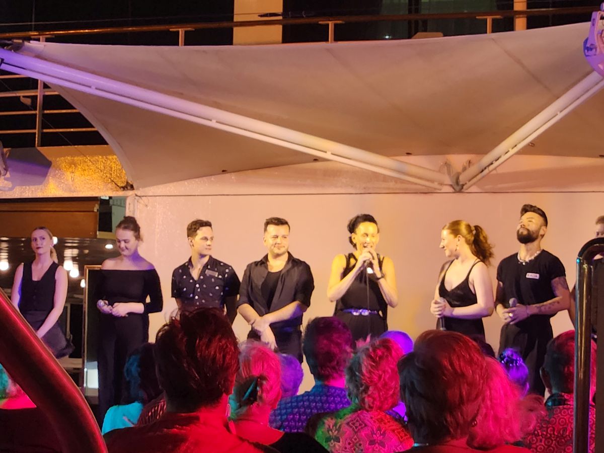 Tonight is dinner in Aqualina and then Broadway under the Stars up on the pool deck – both of which were excellent. I had 3 appetizers – all delish – Ed had app, soup and the special seafood pasta. Yum. Broadway under the Stars was excellent, it was hot, but a really good breeze was blowing, which made it pleasant enough and we grabbed the best seats – 2 by themselves by the hot tub – and had a perfect view and no one around to bother us. AAC forever! Poor Amanda has lost her voice and can’t talk or sing under Doctor’s orders, but of course, she does talk! You’re not going to get Amanda to stop talking. LOL. She lip synced the songs, and it was still an amazing performance. The cast had a group hug at the end because both Amanda and Jose are going on vacation at the end of this cruise. As is Ryszard. Total changeover.