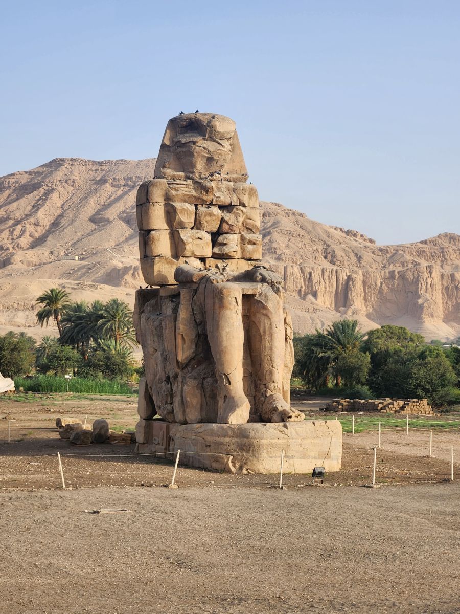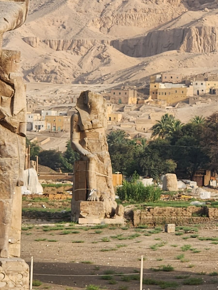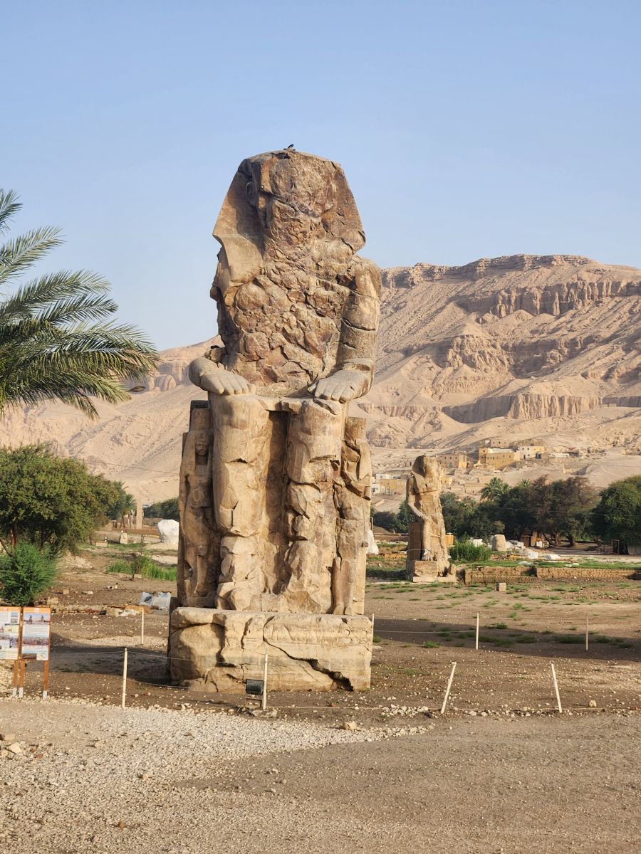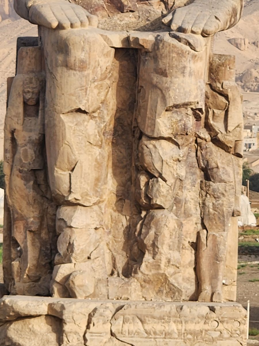 A few minutes later we arrive at the Colossi of Memnon – two giant statues of Amenhotep III in the middle of a field. Amr tells us there used to be temple here behind the statues but is all gone now and only the statues remain. Makes for a better sight actually – just these massive things standing there all alone with the Valley of the Kings mountain in the background. The statues themselves are pieced together, they weren’t found whole, but that makes them even more incredible! Like a giant 3-D jigsaw puzzle! There is even the little Queen on the left side by the King’s leg. There are a couple of other statues in the background – one of which is only a piece of a leg and a hand. Can you imagine finding that when you are excavating for a building or something?