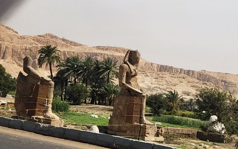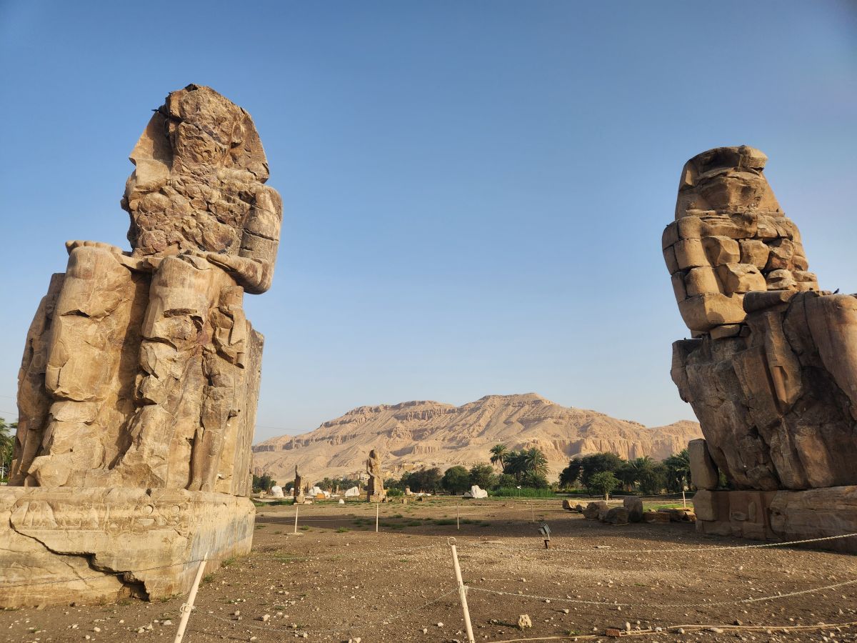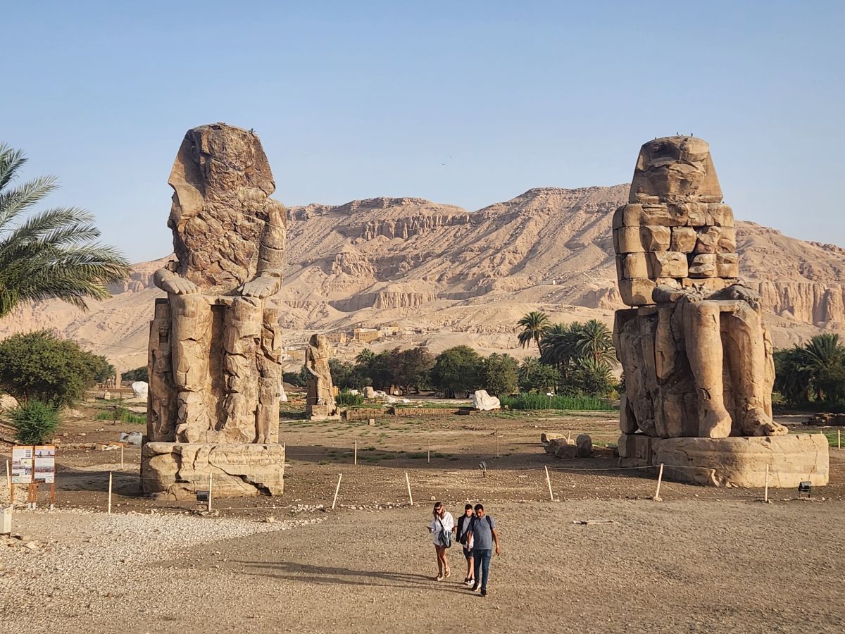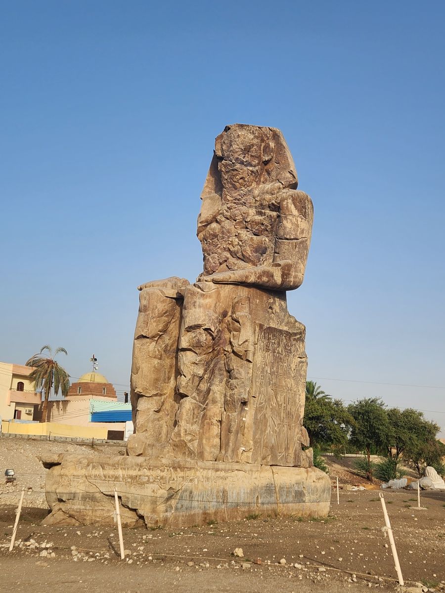 A few minutes later we arrive at the Colossi of Memnon – two giant statues of Amenhotep III in the middle of a field. Amr tells us there used to be temple here behind the statues but is all gone now and only the statues remain. Makes for a better sight actually – just these massive things standing there all alone with the Valley of the Kings mountain in the background. The statues themselves are pieced together, they weren’t found whole, but that makes them even more incredible! Like a giant 3-D jigsaw puzzle! There is even the little Queen on the left side by the King’s leg. There are a couple of other statues in the background – one of which is only a piece of a leg and a hand. Can you imagine finding that when you are excavating for a building or something?