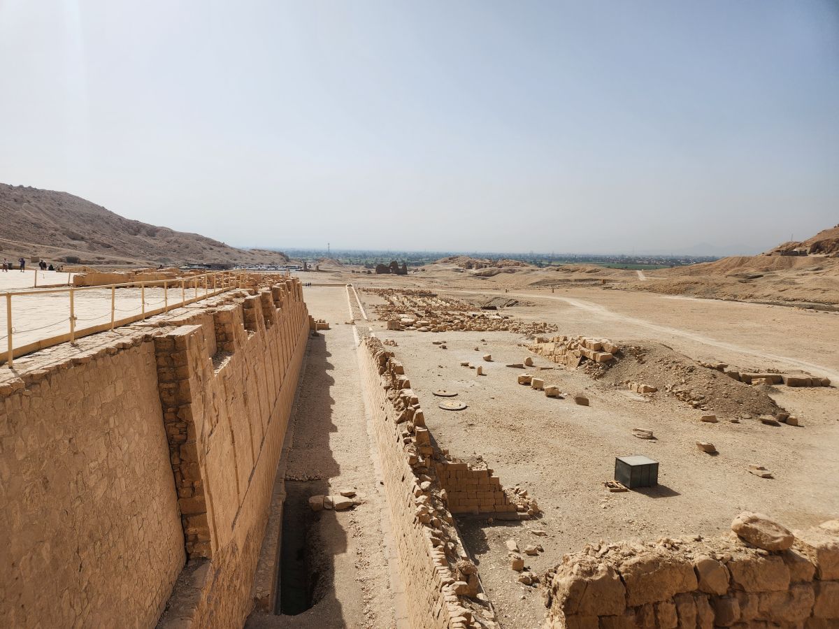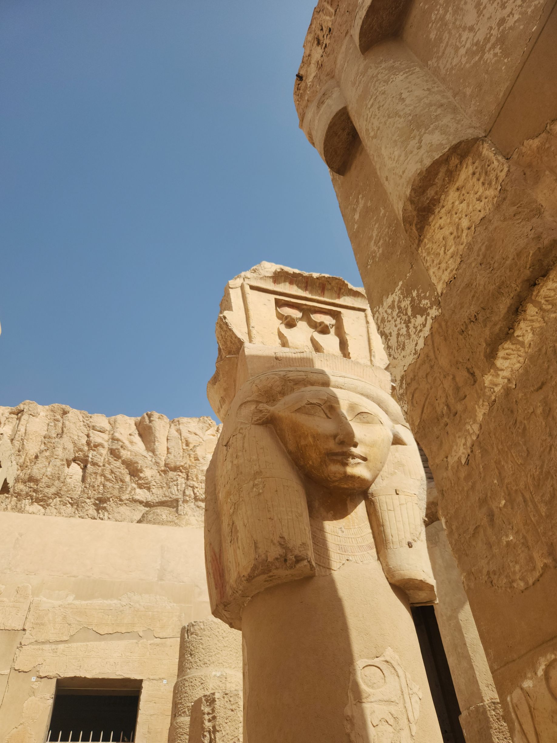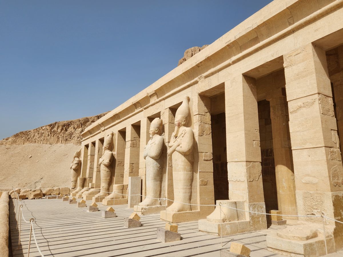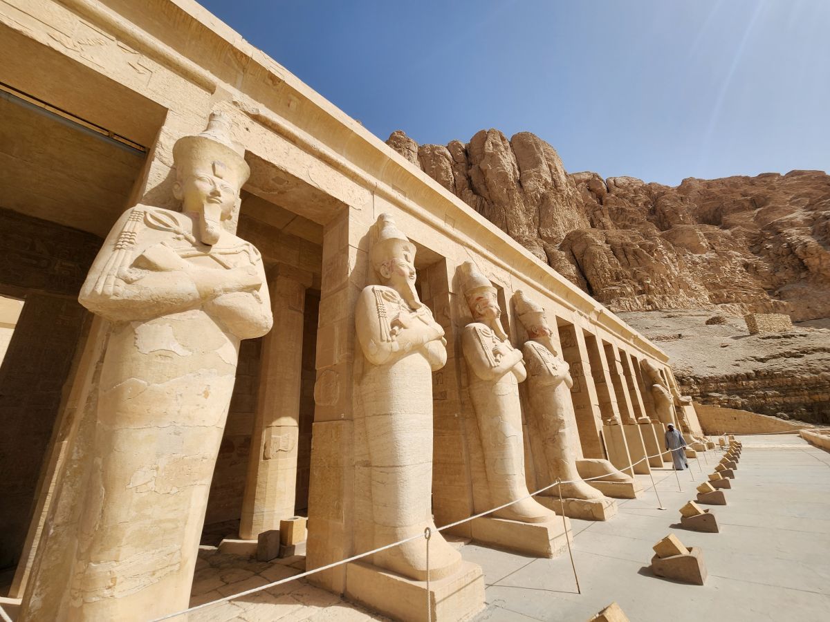 This tomb/complex was wholly different from the Valley of the Kings. Built into the side of the limestone mountain on the exact opposite side from the kings, it’s massive with 3 stories and pillared with huge figurines. The architect promised the queen he would build her a tomb like no other in the land and he did. Built for the wives of the Pharoahs, it was also used for nobles and other members of the royal families. Over 90 tombs were initially found here.