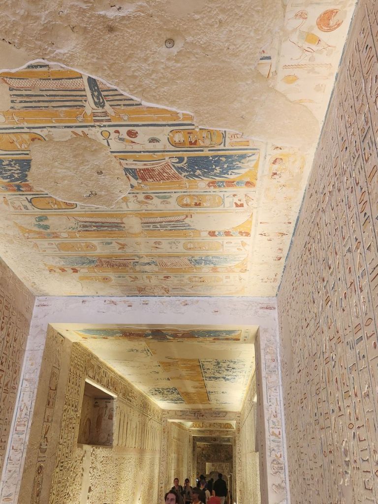 We start off with Ramesses IV tomb which is supposed to be the most impressive of all the tombs, being discovered as early as 1737. Three 3 groups of artists worked on the decorations inside the tomb and because they were working during a time of peace, without any wars, they had plenty of time to finish. The painting and carvings are amazing – they are still so vibrant and bright. With all sorts of scenes of the Book of Caverns, Book of the Dead and Book of Gates. There are cartouches of the king’s names and winged scarabs and hovering vultures (who protected the royals) – still so vibrant and bright – and these are original, not restored!