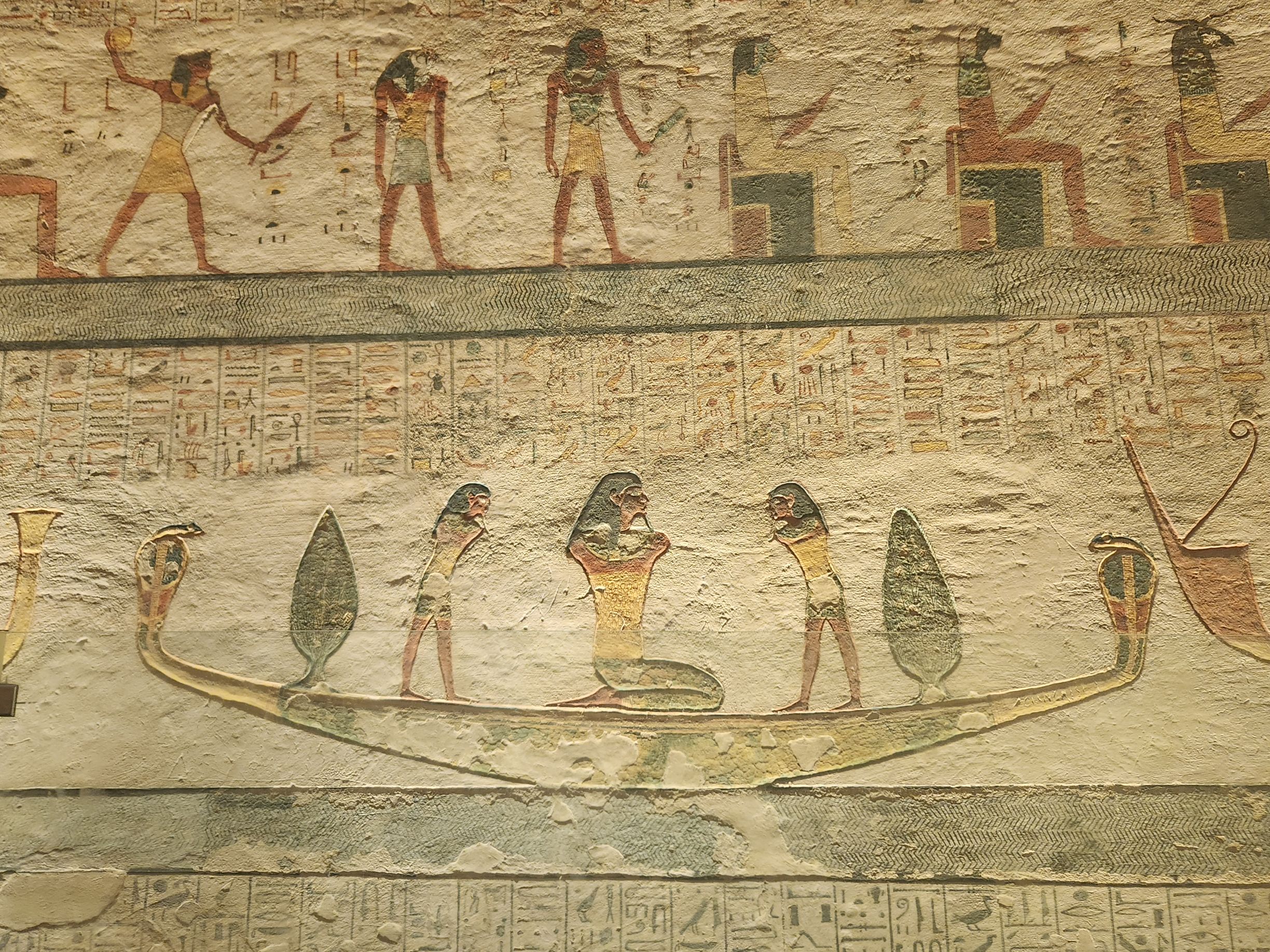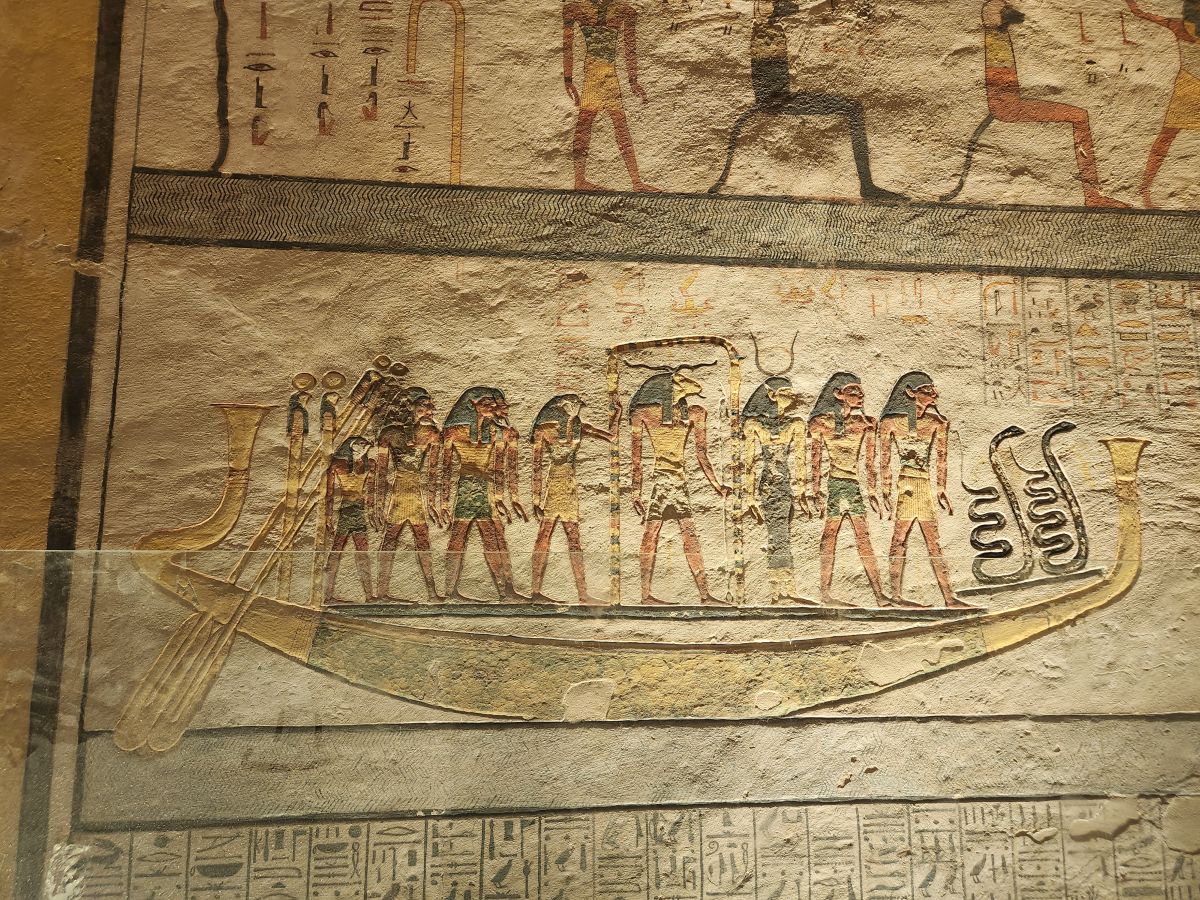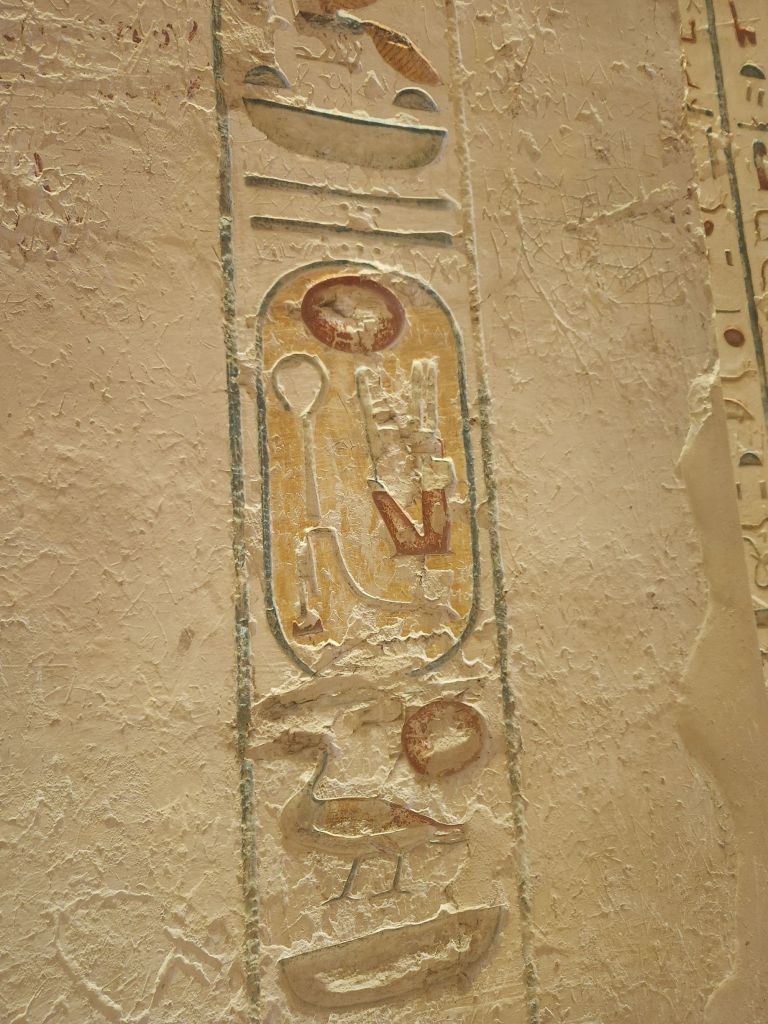 There were also a lot of snakes – cobras representing royalty and divinity – in this tomb. Plus some more fabulous cartouches and a great carving of the King on his boat – Kings were always transported on their boats – and were carried through their kingdom over land in their boats.