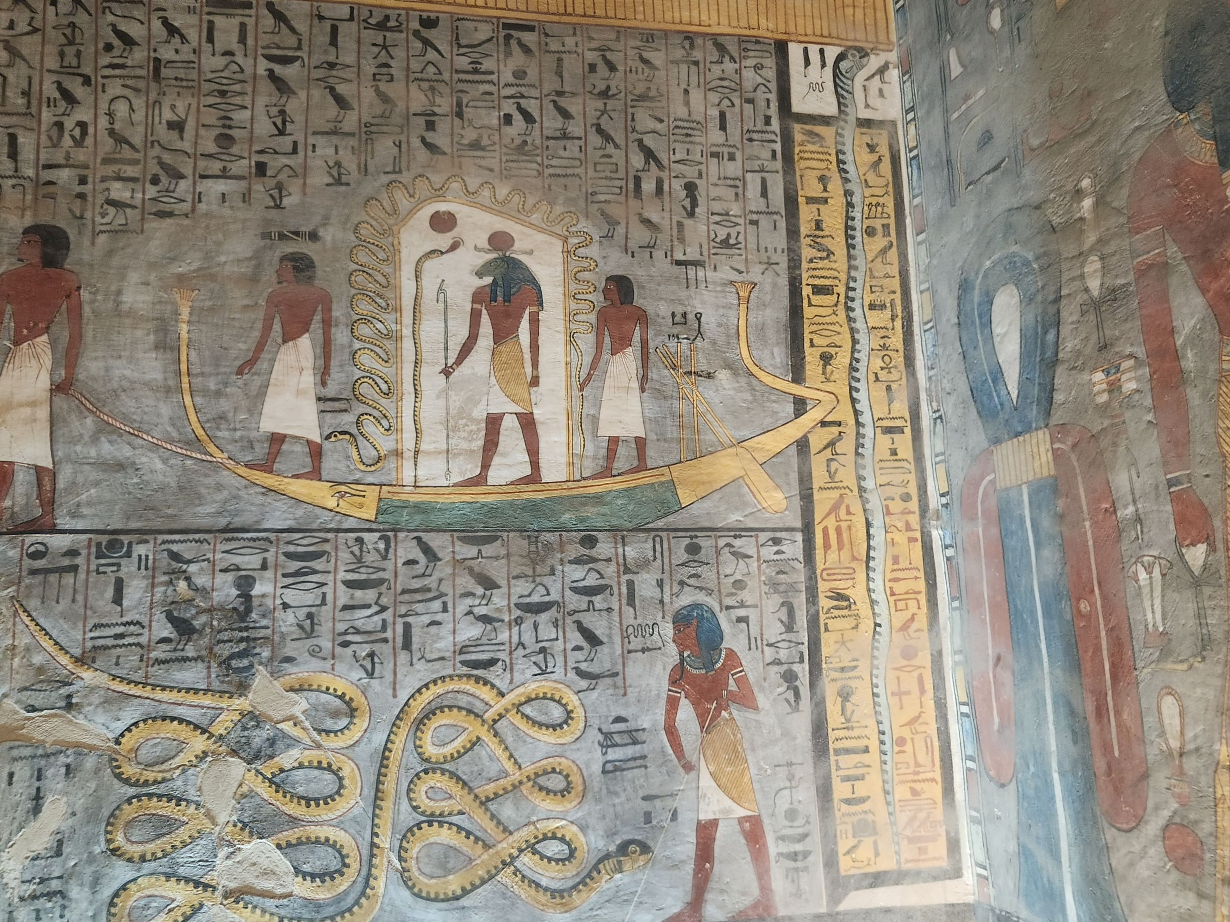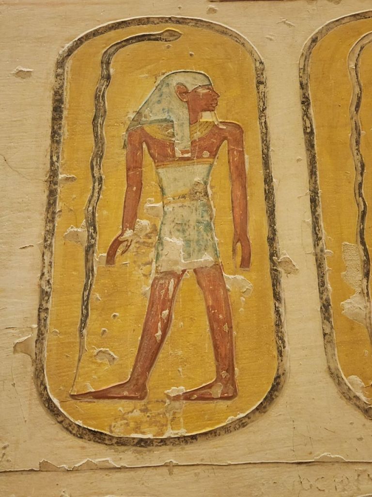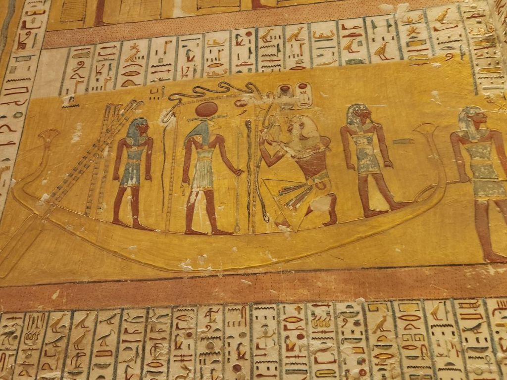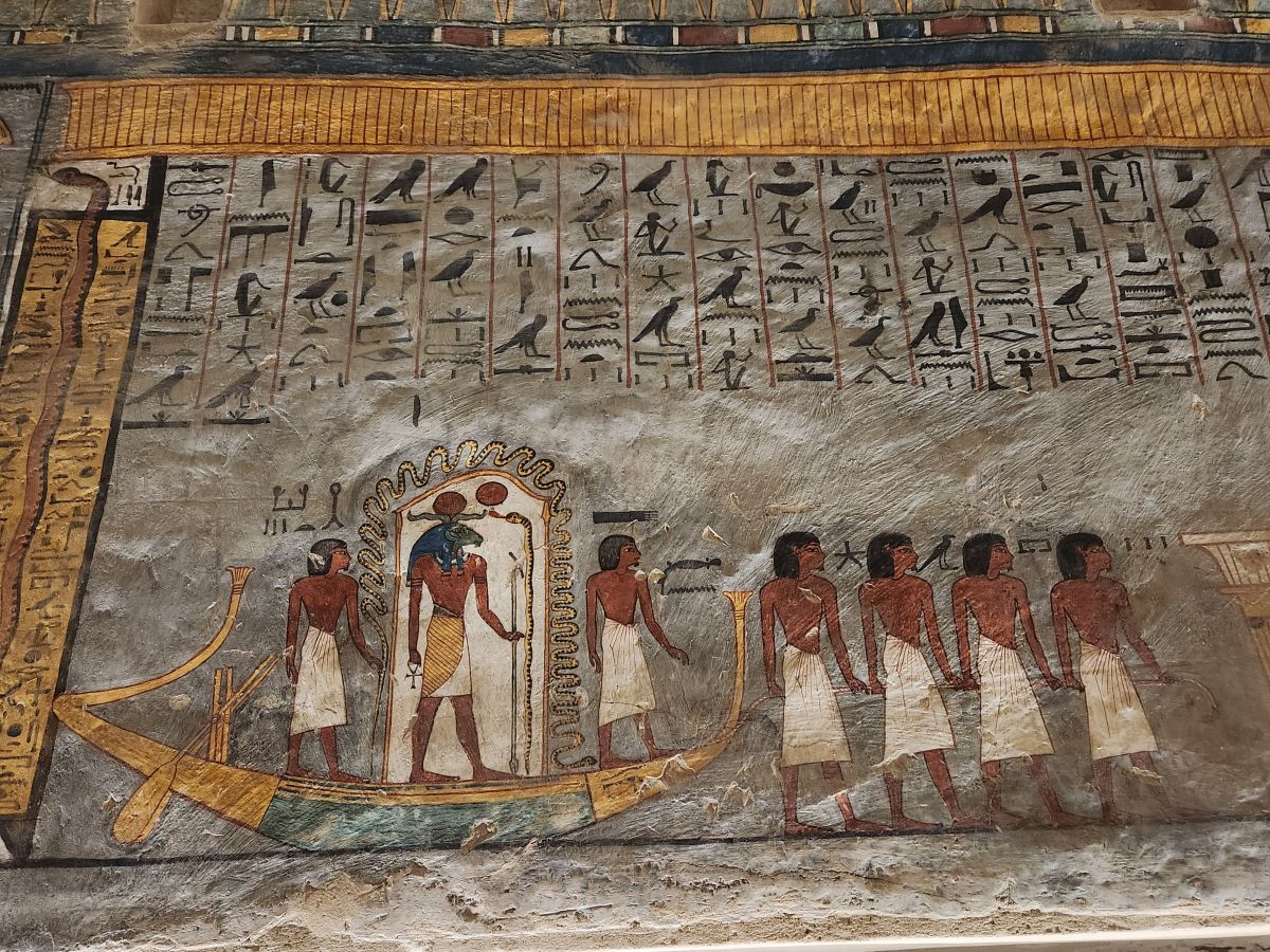 There were also a lot of snakes – cobras representing royalty and divinity – in this tomb. Plus some more fabulous cartouches and a great carving of the King on his boat – Kings were always transported on their boats – and were carried through their kingdom over land in their boats.