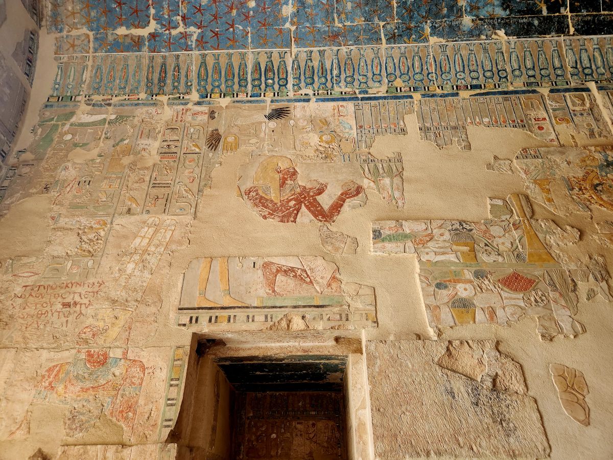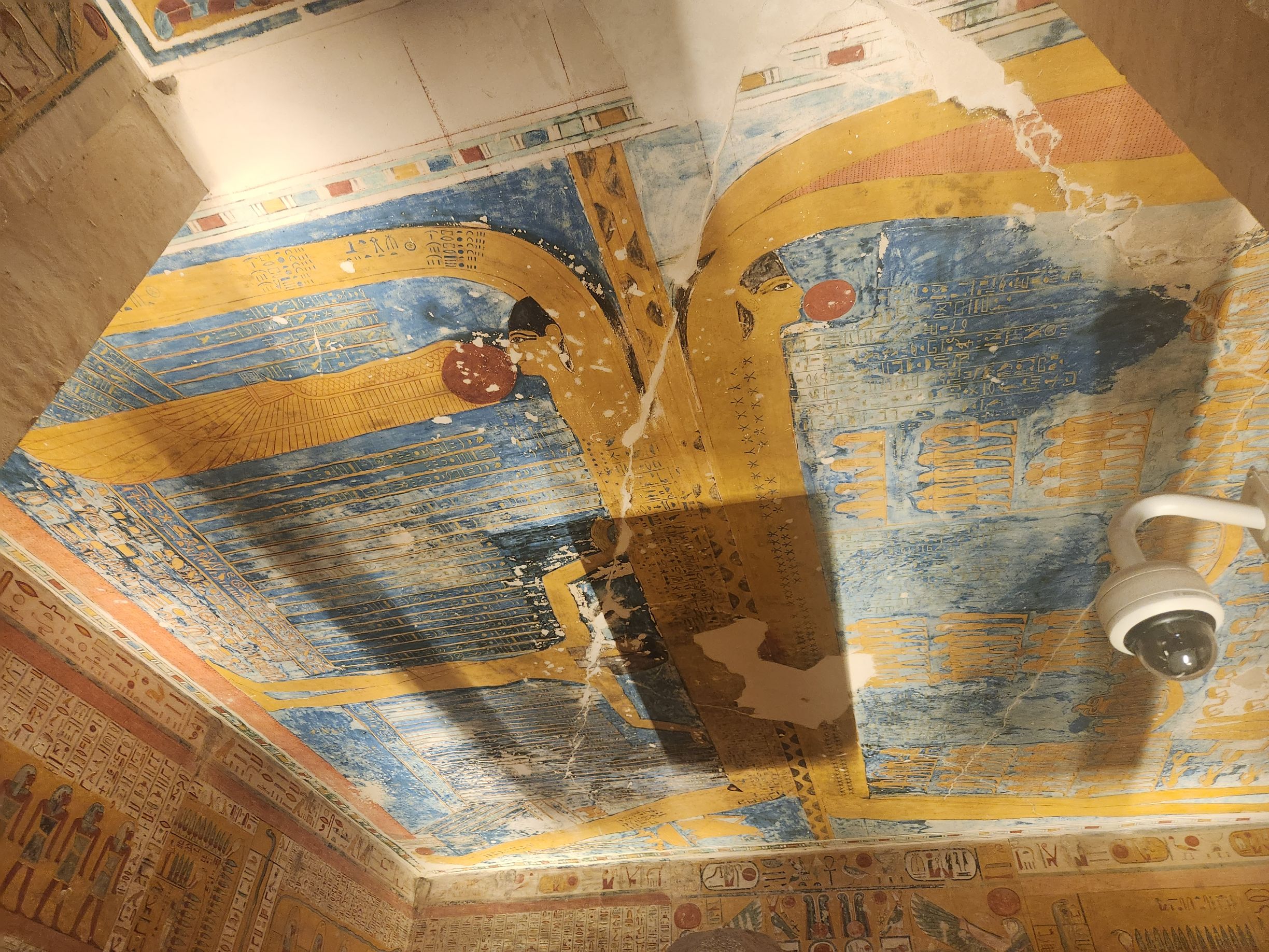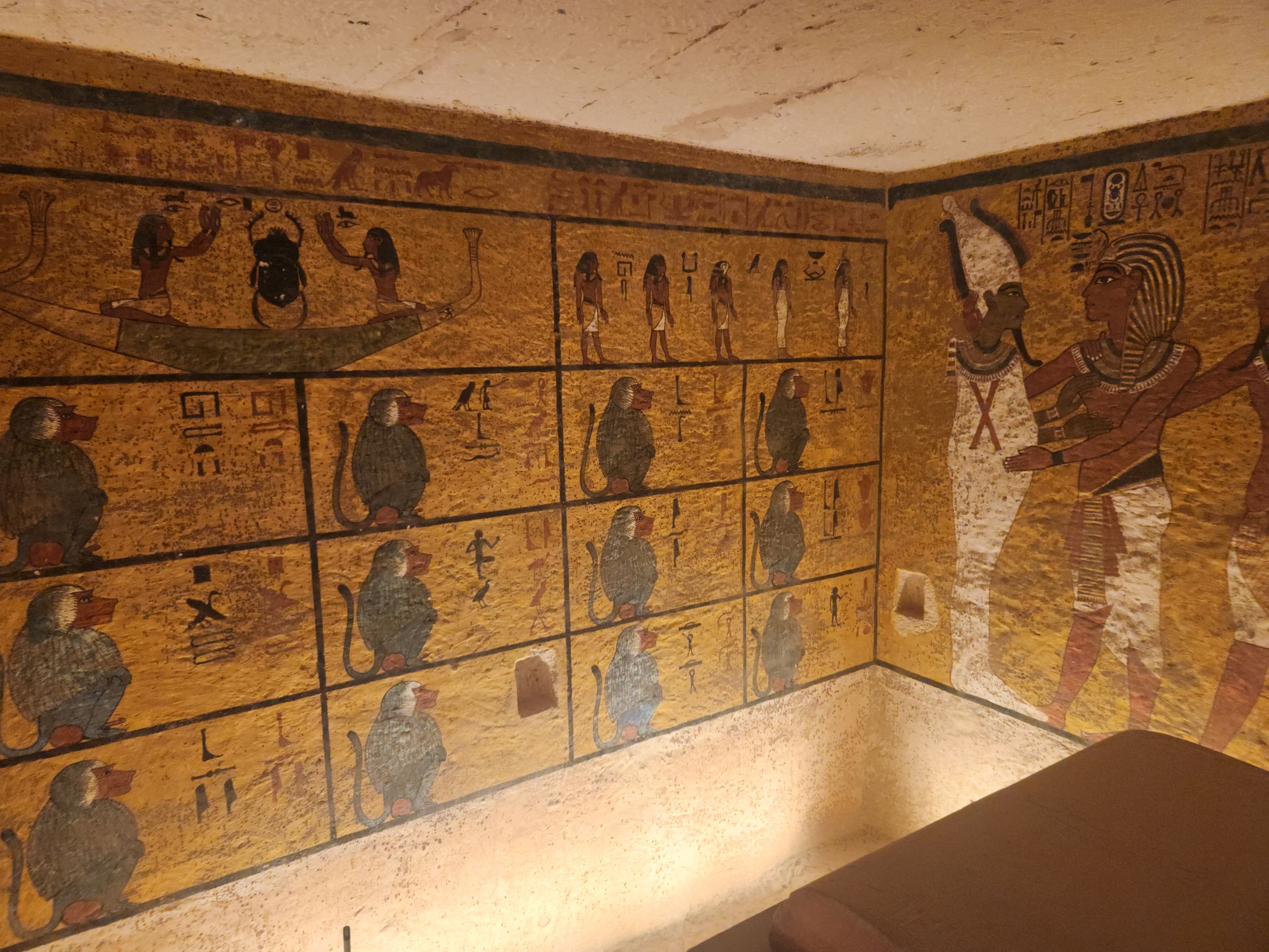 One wall shows King Tut’s successor with a leopard skin and King Tut standing before the Goddess Nut who is welcoming him to his tomb.