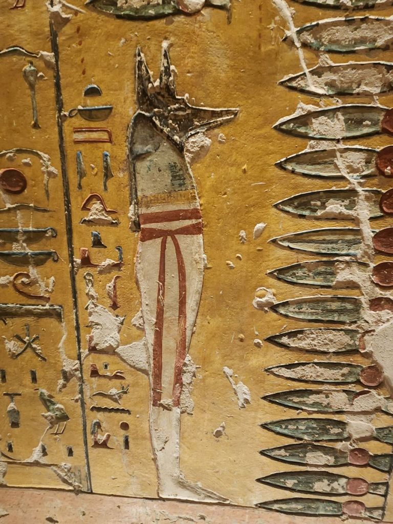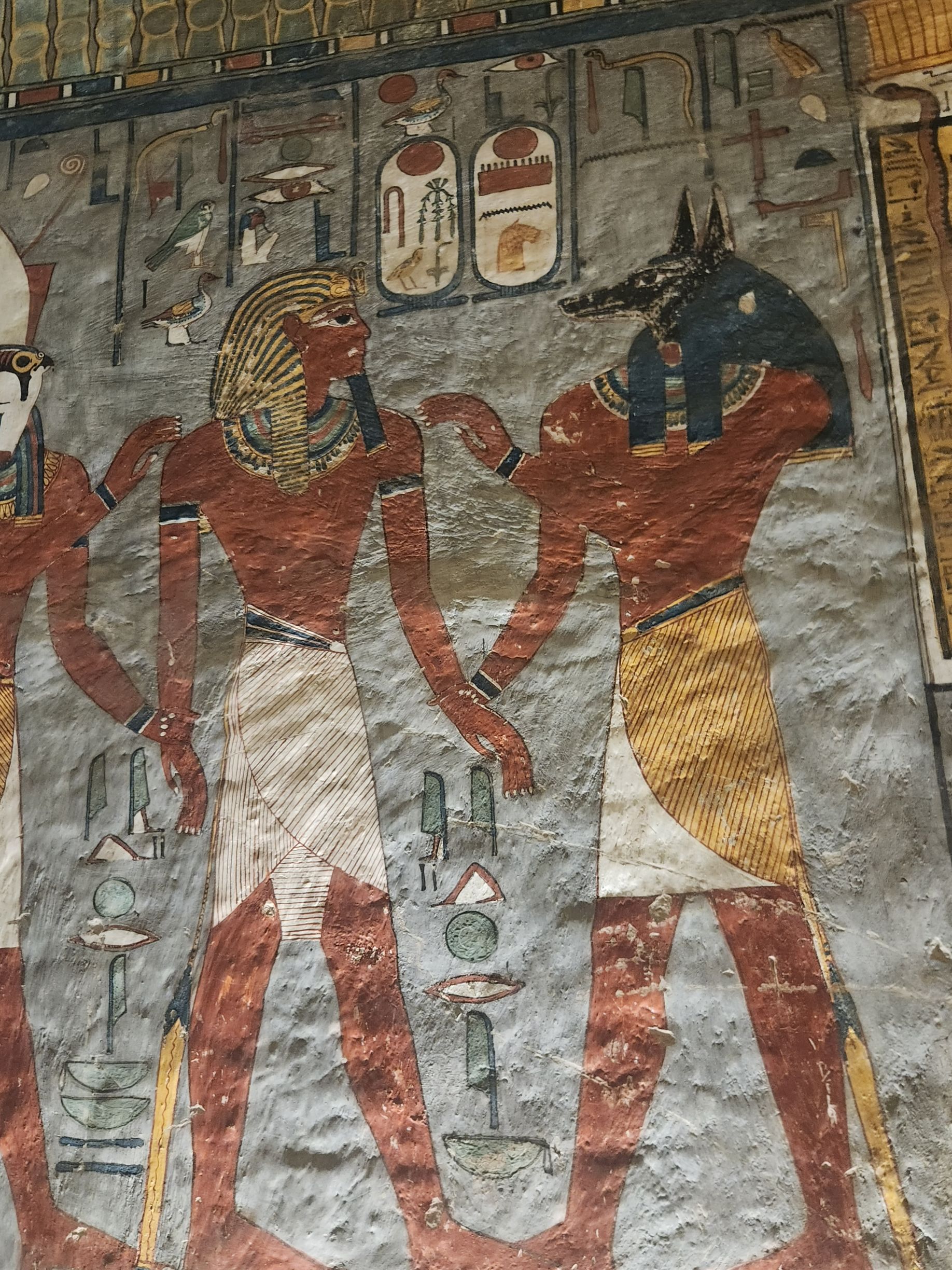 The final wall, which you can’t see very well because it is in an awkward position from the railing that keeps visitors away from the tomb, depicts King Tut standing between the Jackal-headed God Anubis and the Goddess Hathor who is giving him an ankh, the symbol of life.