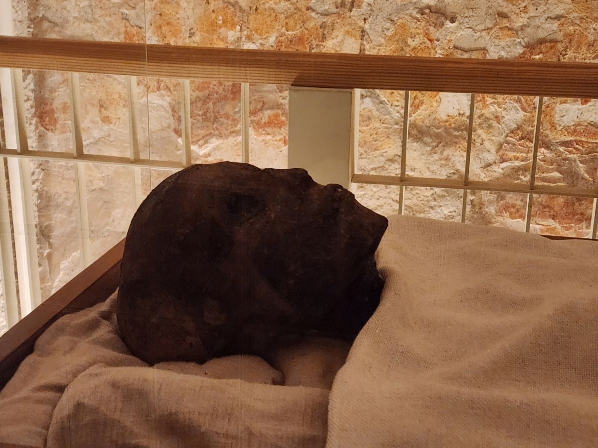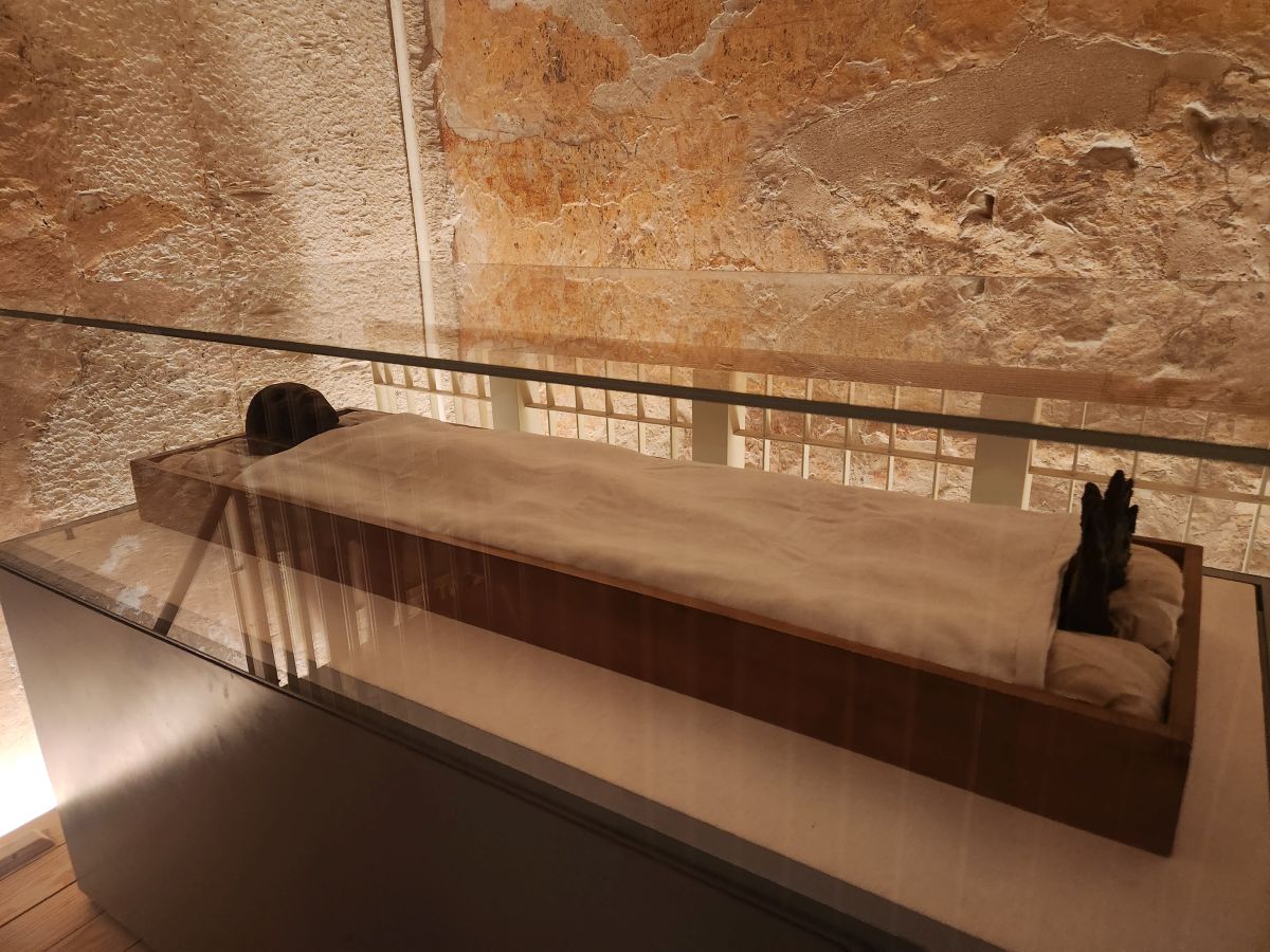 Once outside we headed toward King Tut’s tomb – our extra cost included ticket (most tours don’t include this tomb). We’re lucky here, it isn’t that crowded (probably because of the extra cost!) and we can spend as much time as we want without feeling crushed or pressured. This is the smallest tomb in the complex, which is weird, because it was also the one that held the most treasure. It was found in 1922, hidden under Ramsesses IV’s tomb. While all them main artifacts (the sarcophagus, the famous mummy forms and mask plus additional treasures) have all been removed to be displayed in the Cairo museum (what wasn’t looted that is), but the mummy and coffin still remain. King TuTankhamun died very young, and when you walk into the chamber that holds his mummy you can tell – he is teeny. His little feet are just tiny!