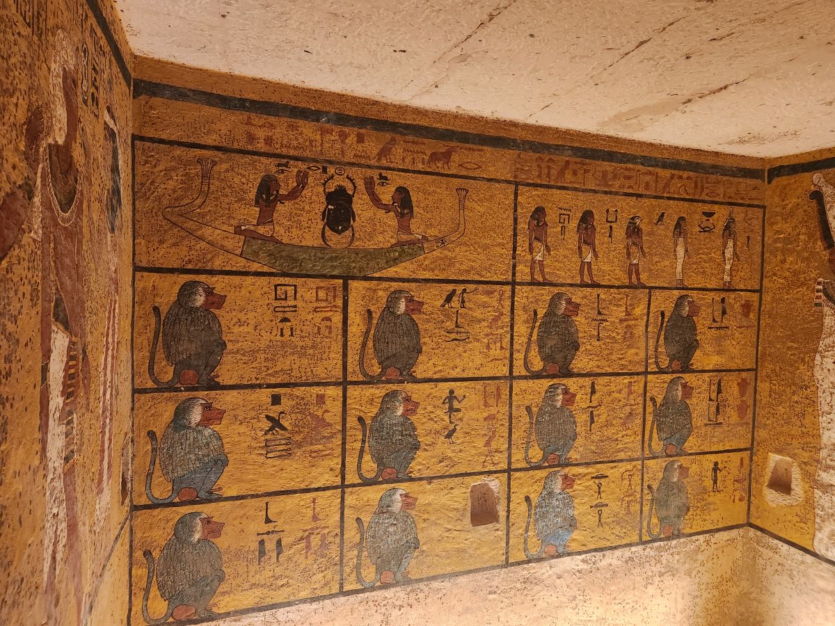 Another wall displays 4 baboons in 3 rows, representing the 12 hours of night with standing gods and the sun barque above them with the scarab.