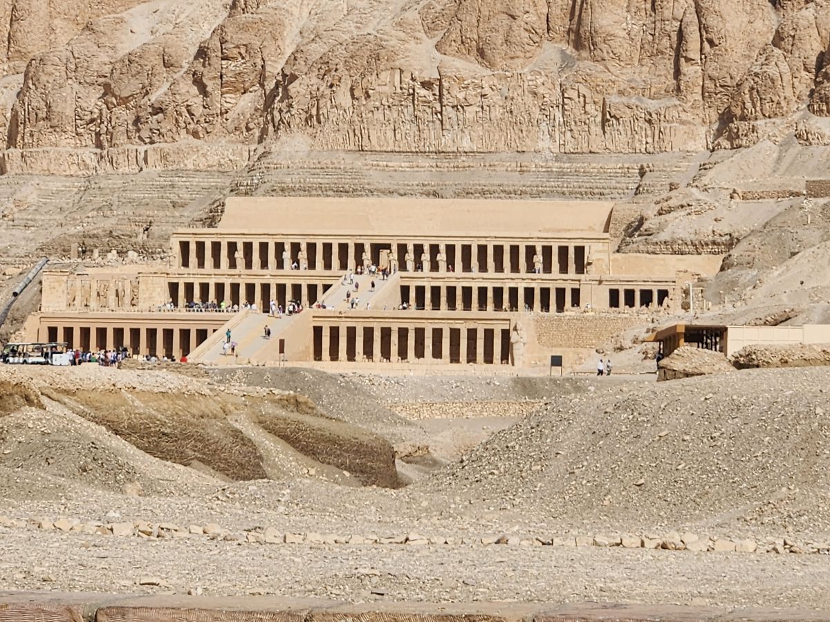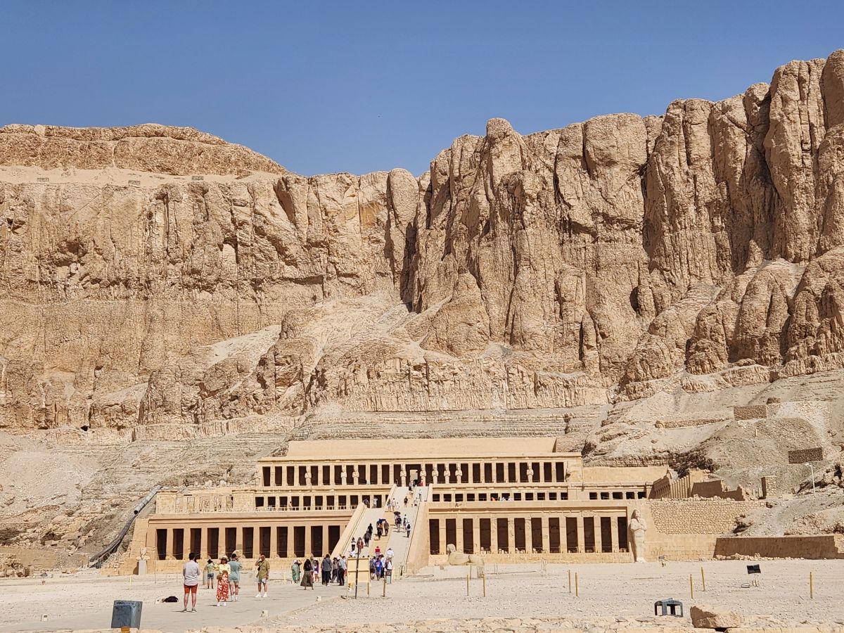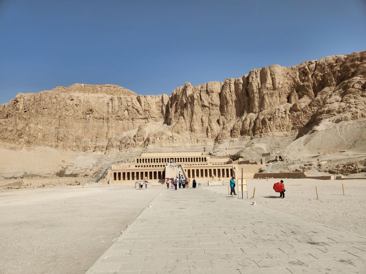 Meeting back up with Amr, we buy a package of photos with a CD of explanations and more photos as a souvenir (and to remind us of what we have seen), then hop in the little golf cart like trolleys that take us back to the entrance. We navigate through the stalls of the market at the entrance, stopping at #46 to buy a book on the Valley of Kings from the vendor we promised at the start of our visit, and we’re off to the other side of the mountain and the Valley of the Queens, otherwise known as Hatshepsut Temple for Queen Hatsheput who had it built.