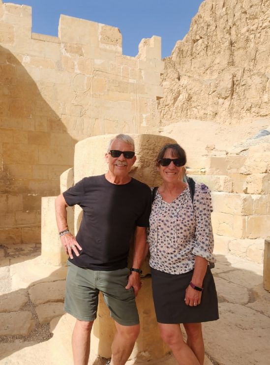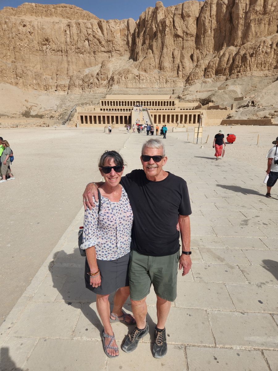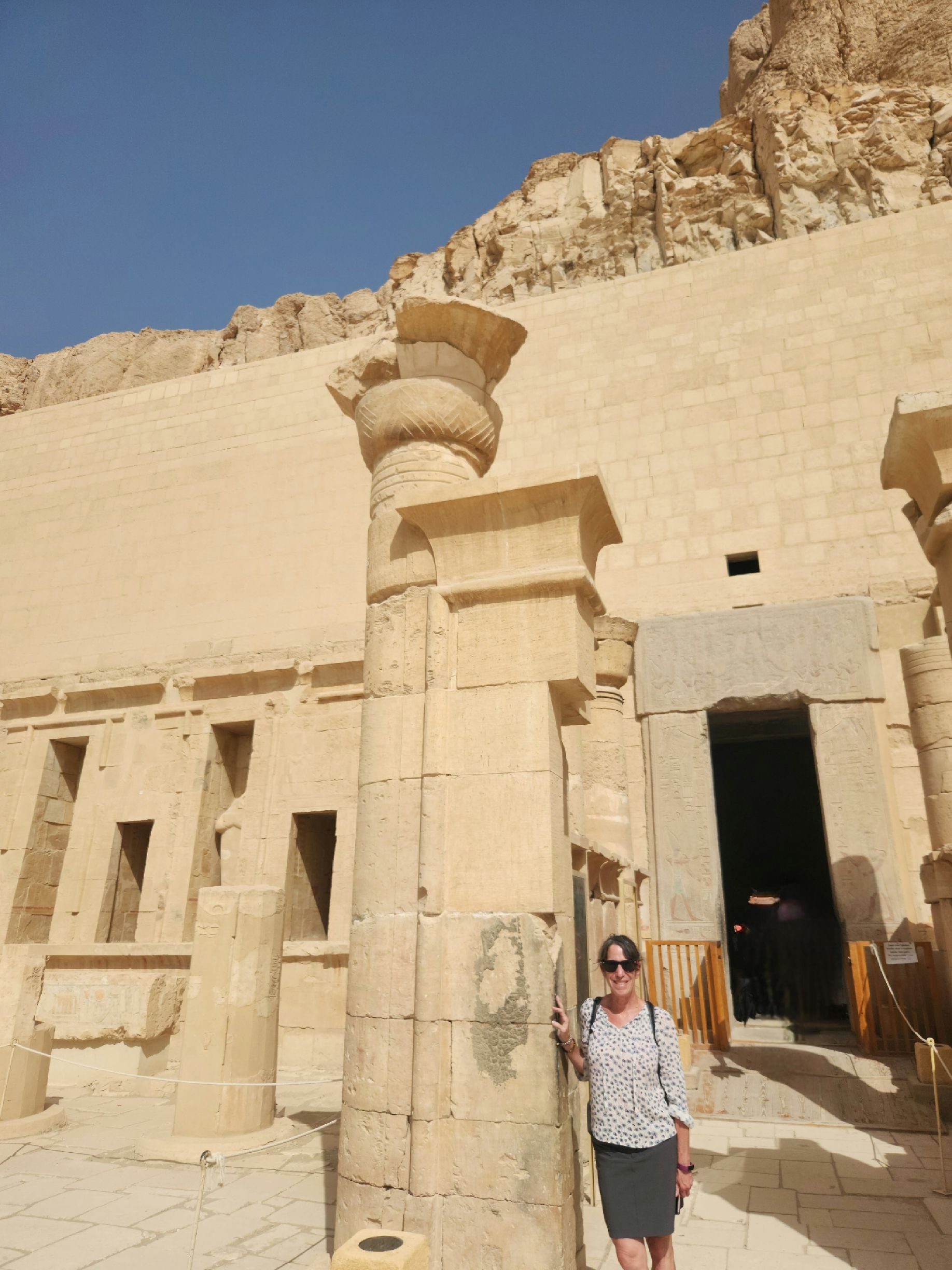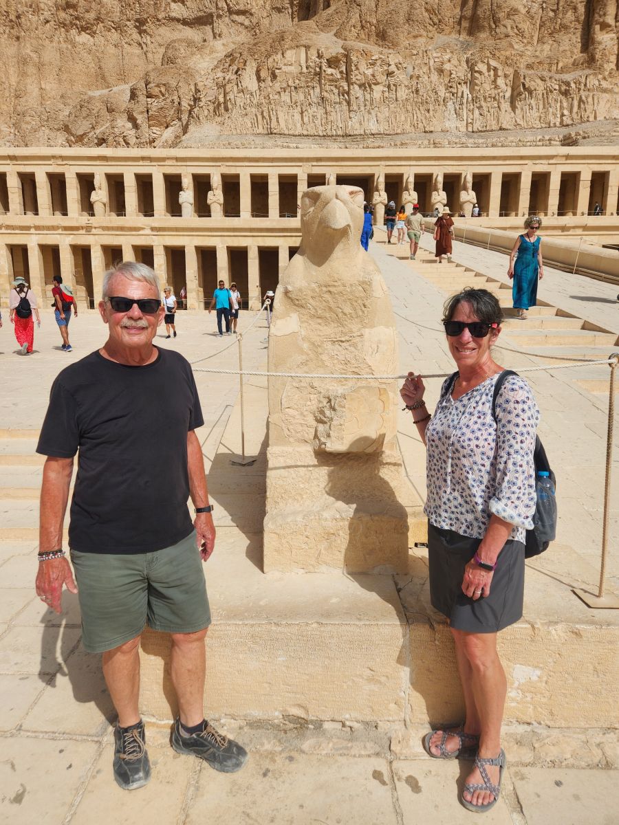 Meeting back up with Amr, we buy a package of photos with a CD of explanations and more photos as a souvenir (and to remind us of what we have seen), then hop in the little golf cart like trolleys that take us back to the entrance. We navigate through the stalls of the market at the entrance, stopping at #46 to buy a book on the Valley of Kings from the vendor we promised at the start of our visit, and we’re off to the other side of the mountain and the Valley of the Queens, otherwise known as Hatshepsut Temple for Queen Hatsheput who had it built.