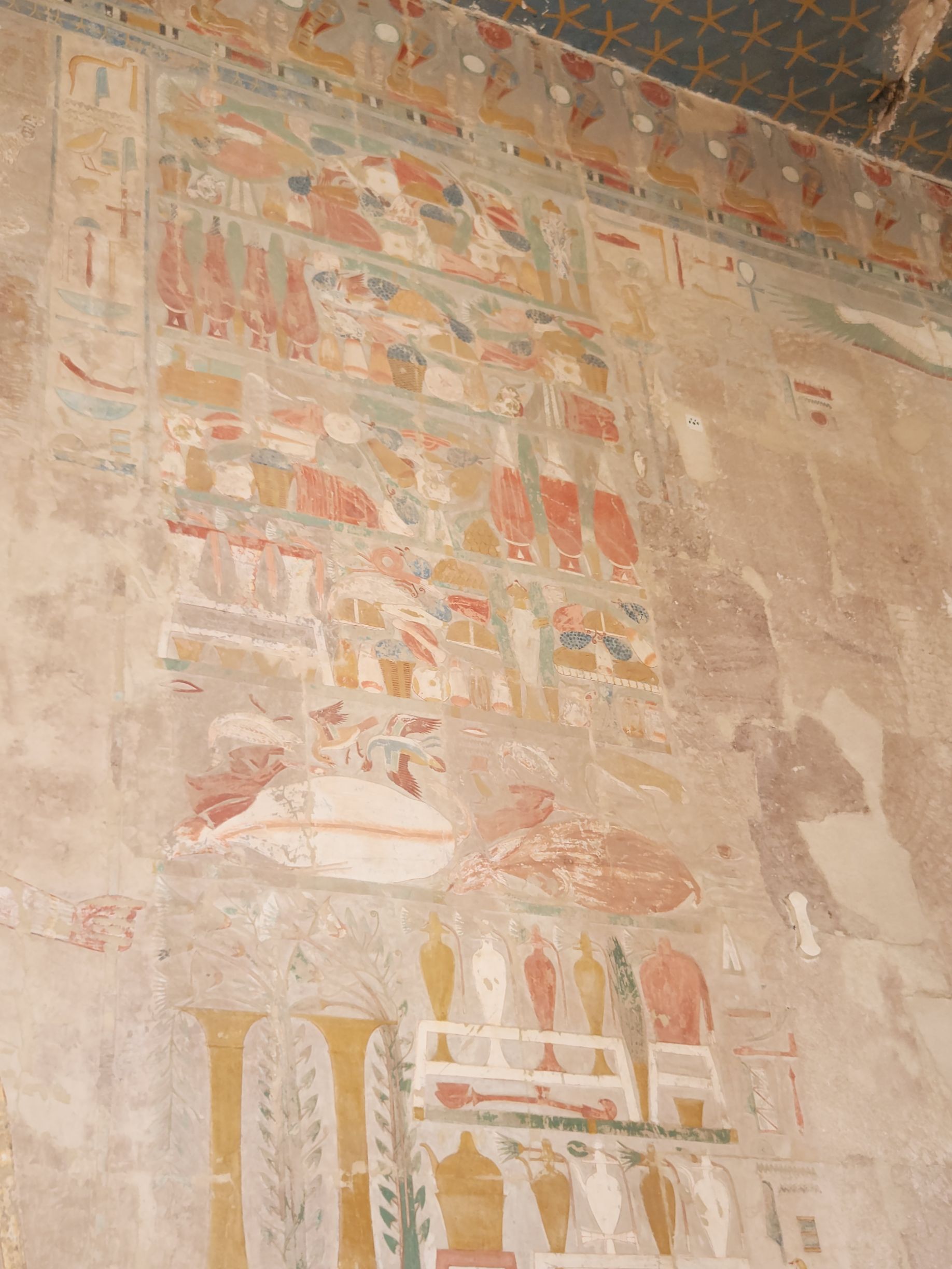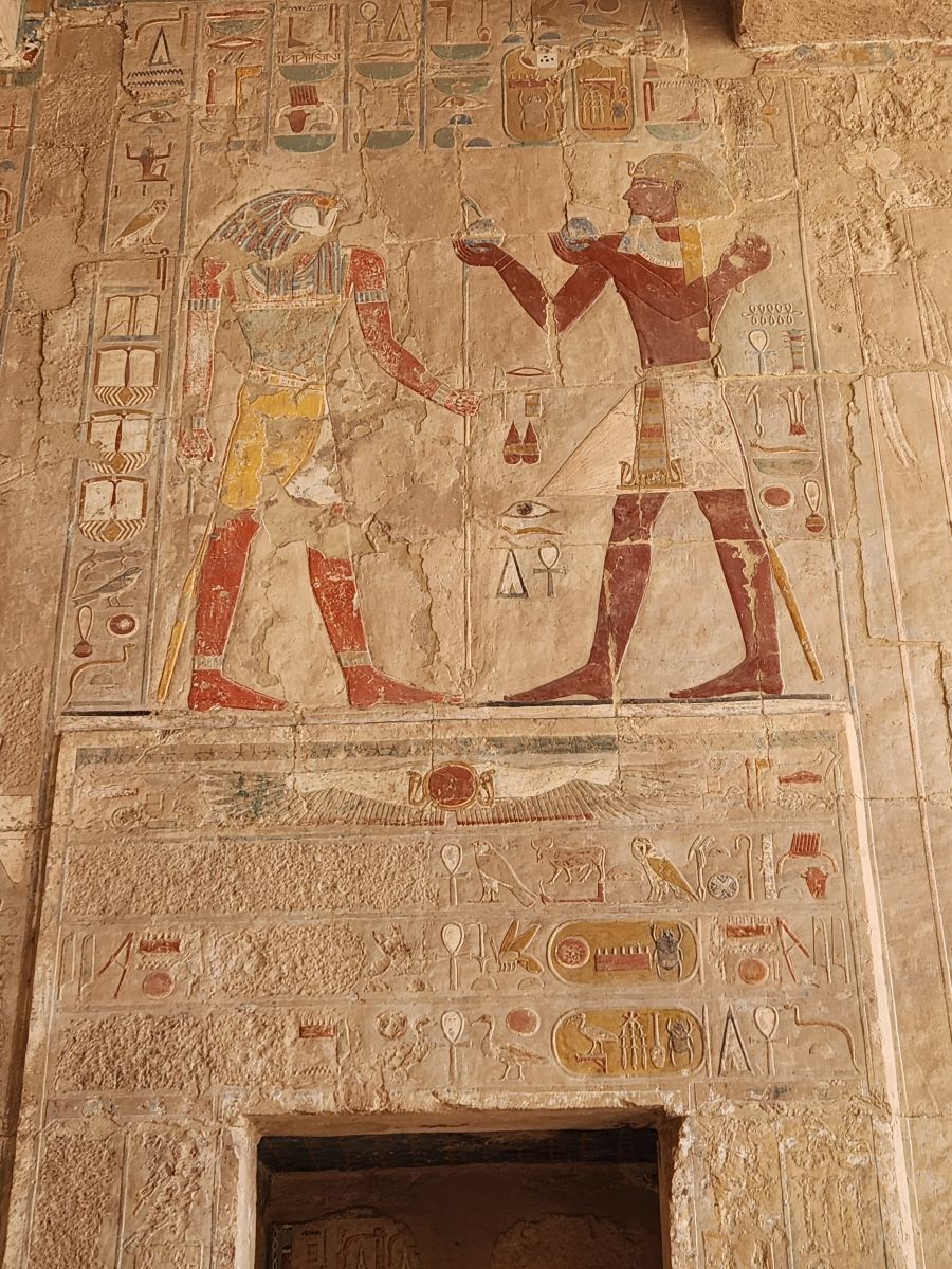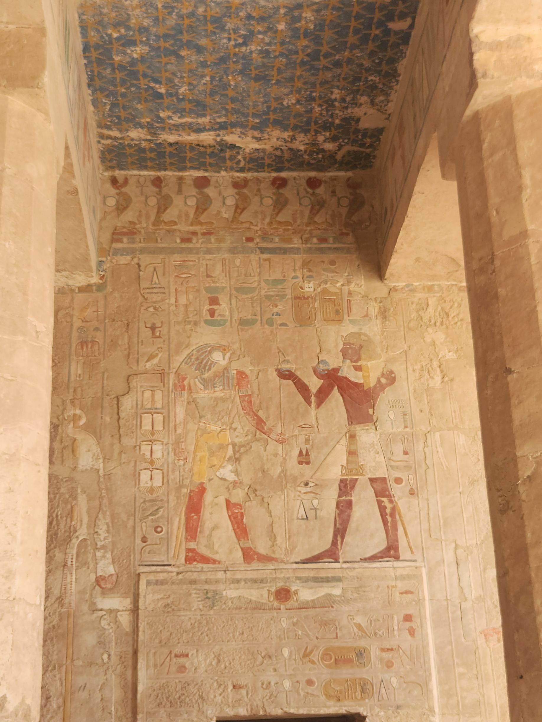 Next we walk through a little portico area with carvings and paintings of the wheat harvest with huge wheat stalks – again I think signifying how much the valley produced. On the way out and up to the upper floors, we stop next to the grumpy falcon. It is said he was grumpy because he fought with his father for 100 years before he could take over the throne. I’d be grumpy too!