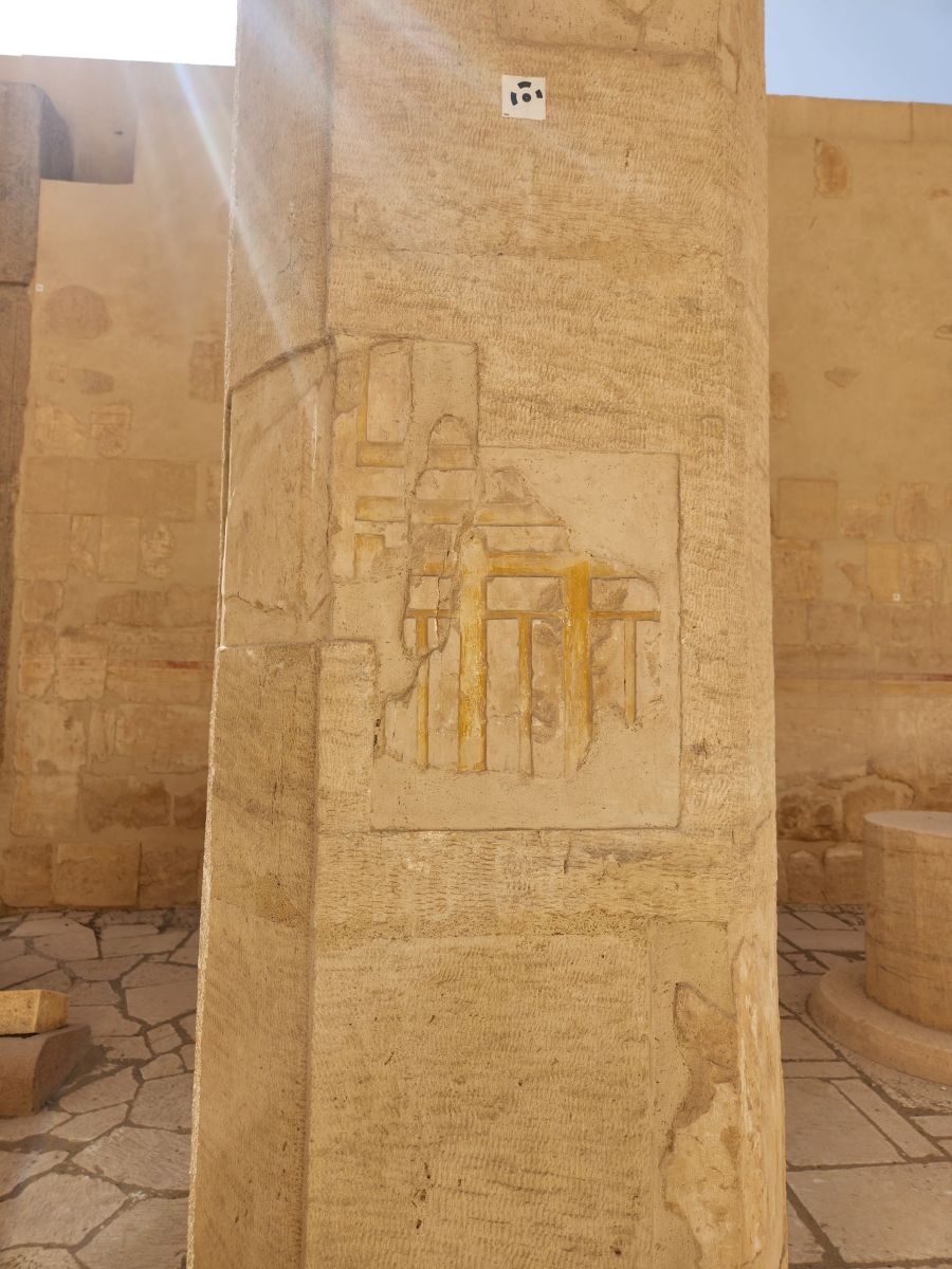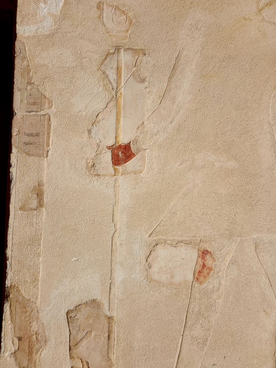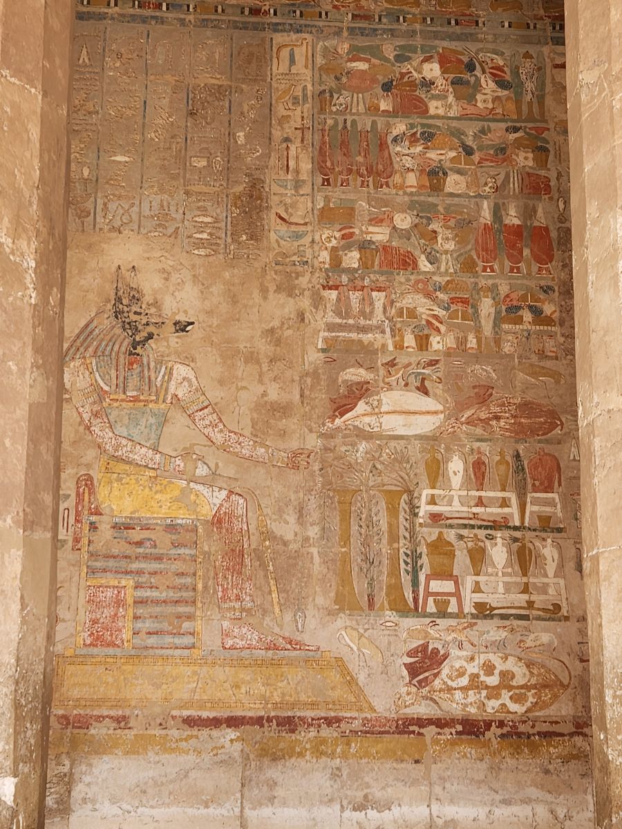 Next we walk through a little portico area with carvings and paintings of the wheat harvest with huge wheat stalks – again I think signifying how much the valley produced. On the way out and up to the upper floors, we stop next to the grumpy falcon. It is said he was grumpy because he fought with his father for 100 years before he could take over the throne. I’d be grumpy too!