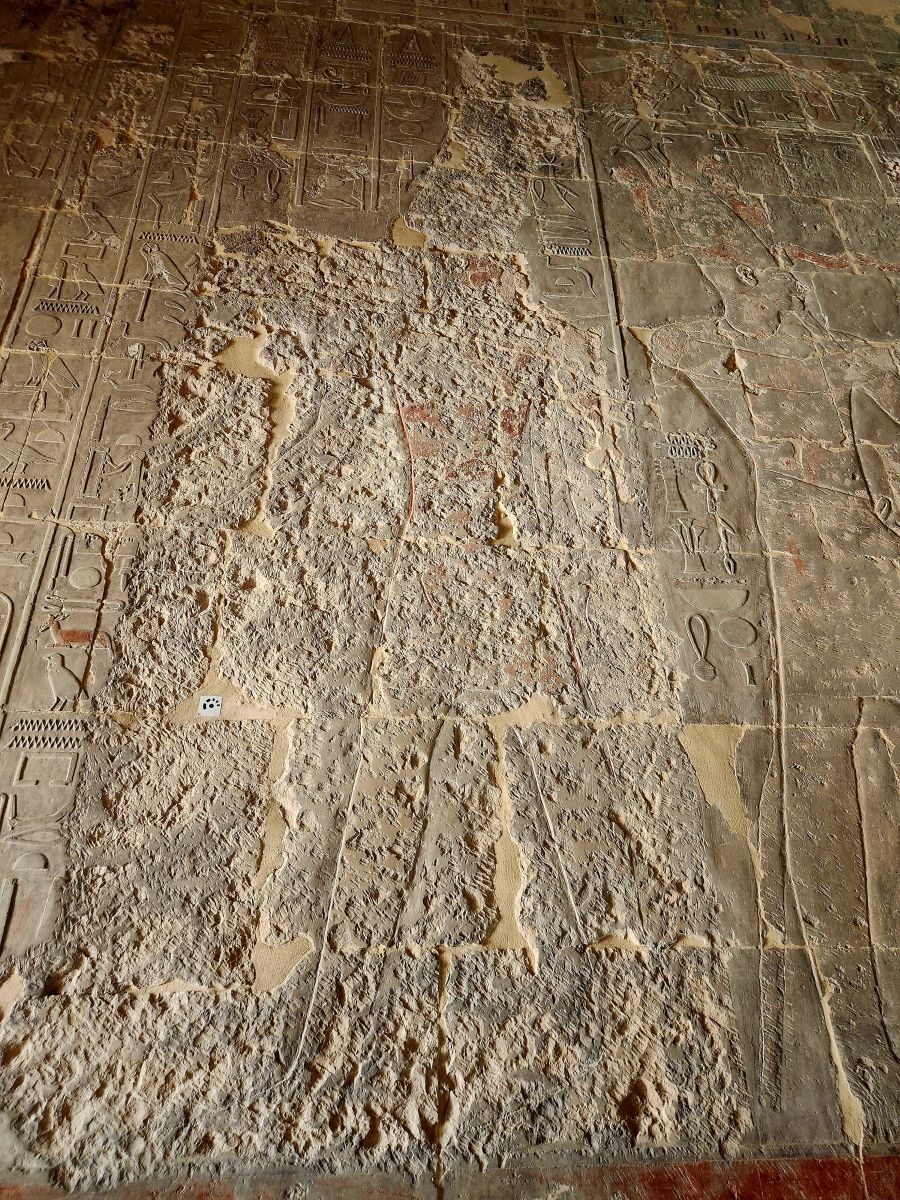 Amr then leaves us on our own to wander through the upper chapels with lots of carvings and cartouches and stories. Again, here, everywhere, the Queen is chiseled out. Look at any of these photos and you will see the King (you can recognize him with the 2 long feathers atop his head) and other beautifully painted and carved figures – but anywhere you see a cut out section, it is the Queen. Still, what remains is amazing.