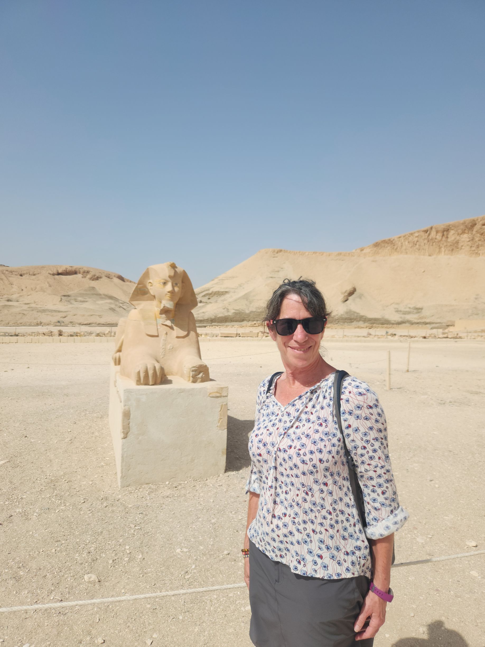 Totally awesome! Meeting Amr outside the tomb – in the shade of course! (Guides aren’t allowed inside the tombs, because of the additional carbon dioxide they would produce which hurts the paintings – but it is also probably because there is no way a guide could narrate inside these tombs, it would create a bottleneck to end all bottlenecks and it is bad enough in there already!) Here we exclaim over what a fabulous tomb and all the symbolism, etc. We have one more tomb to visit – Amr gives us a choice of steep steps and beautiful colors or long steep steps and beautiful carvings. We choose the colors and head off to Ramesses I tomb.