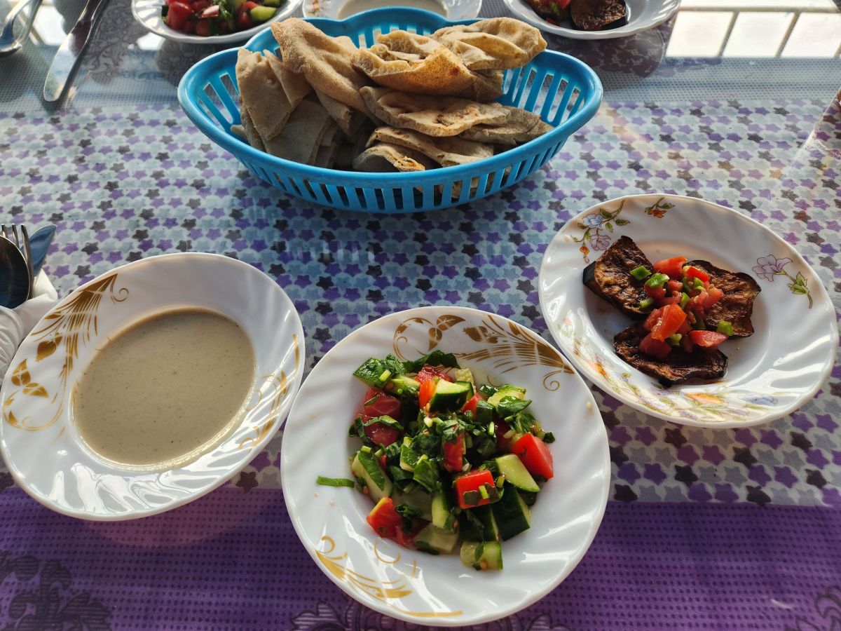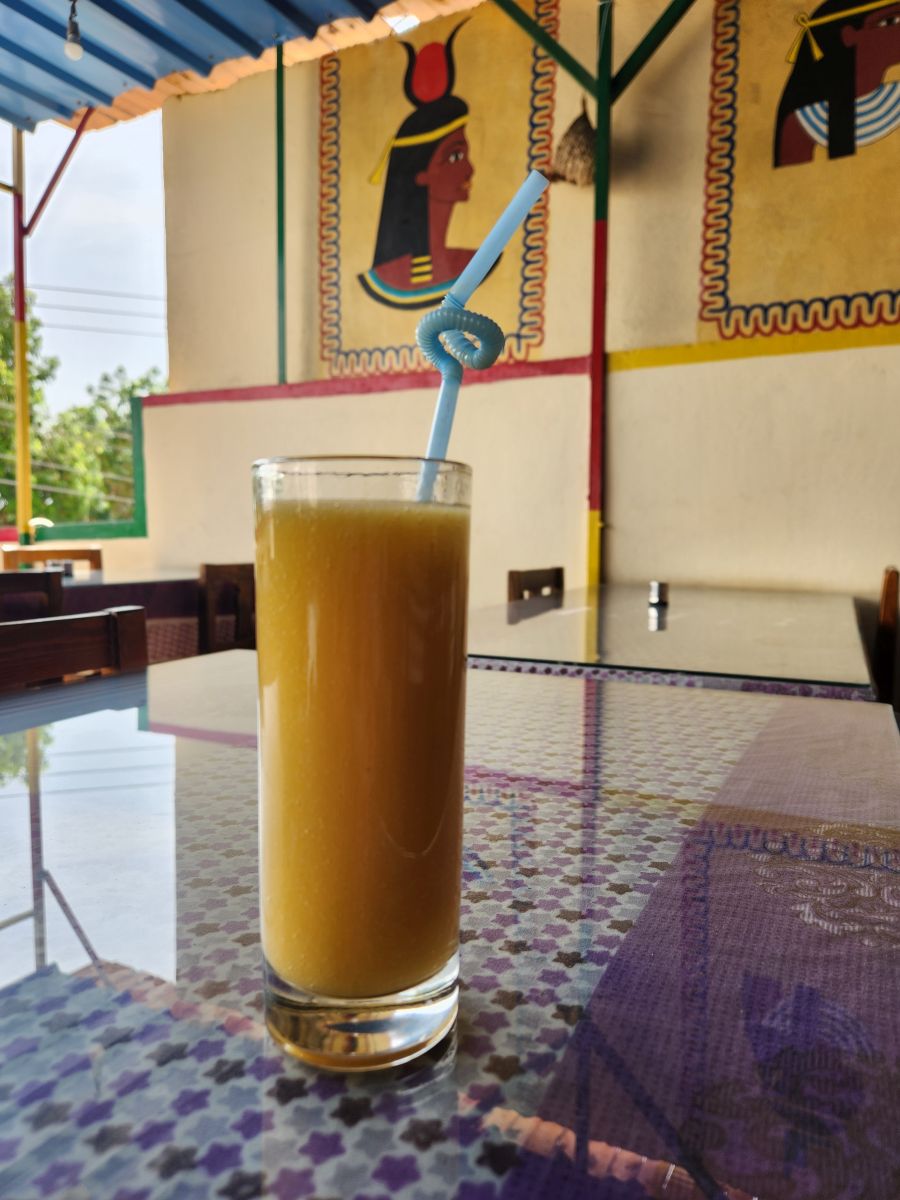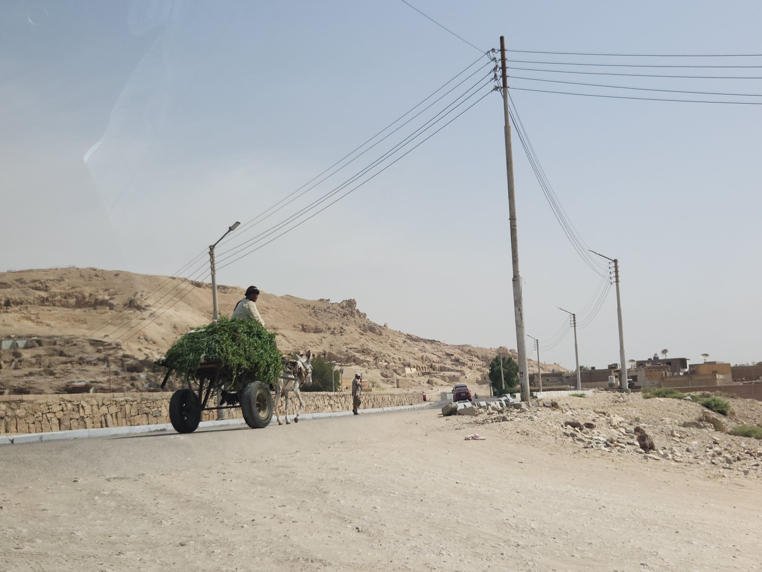 So it is off the restaurant we go – passing an ubiquitous donkey cart hauling clover, back past the Memnon statues and to this really nice little place on the 2nd floor of a building – where, because it is so early, we are the only people there and we need to wait 20 minutes before they can even begin to think about serving us! LOL.