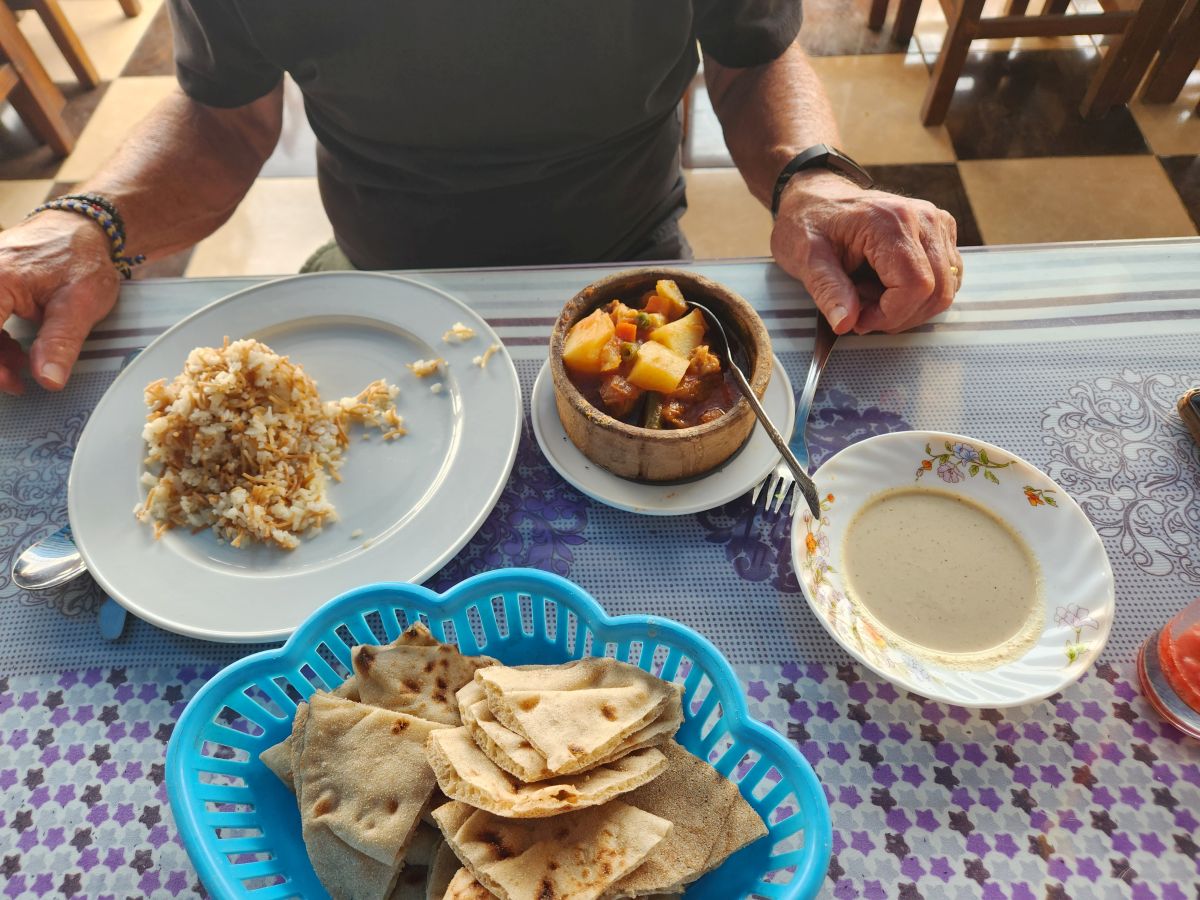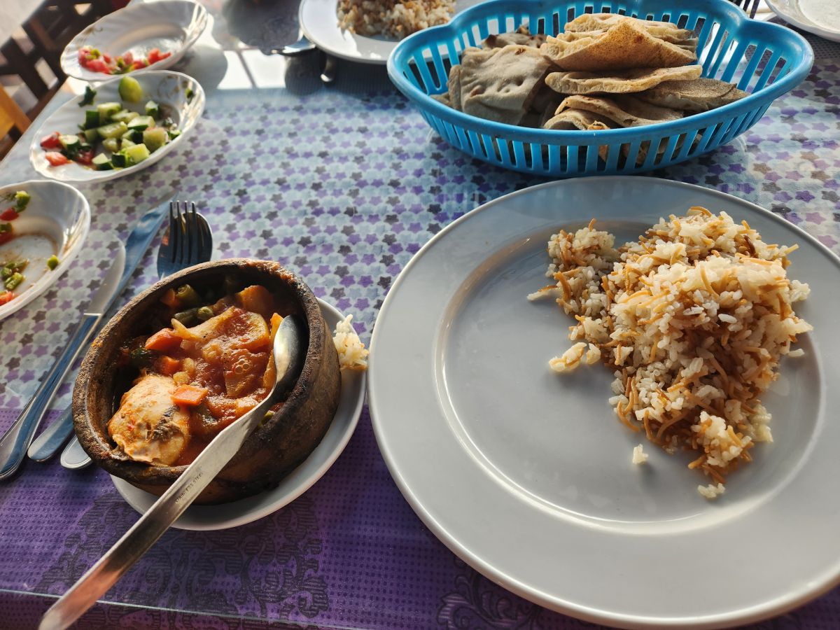 The wait was worth it. The food was awesome – chicken and beef tagine with an awesome little salad and marinated fried eggplant that we will make when we get home. Plus a ton of pita and these great Strawberry and Mango juice drinks (extra cost of course! But oh so worth it! If only we could get mango in the States like this!).