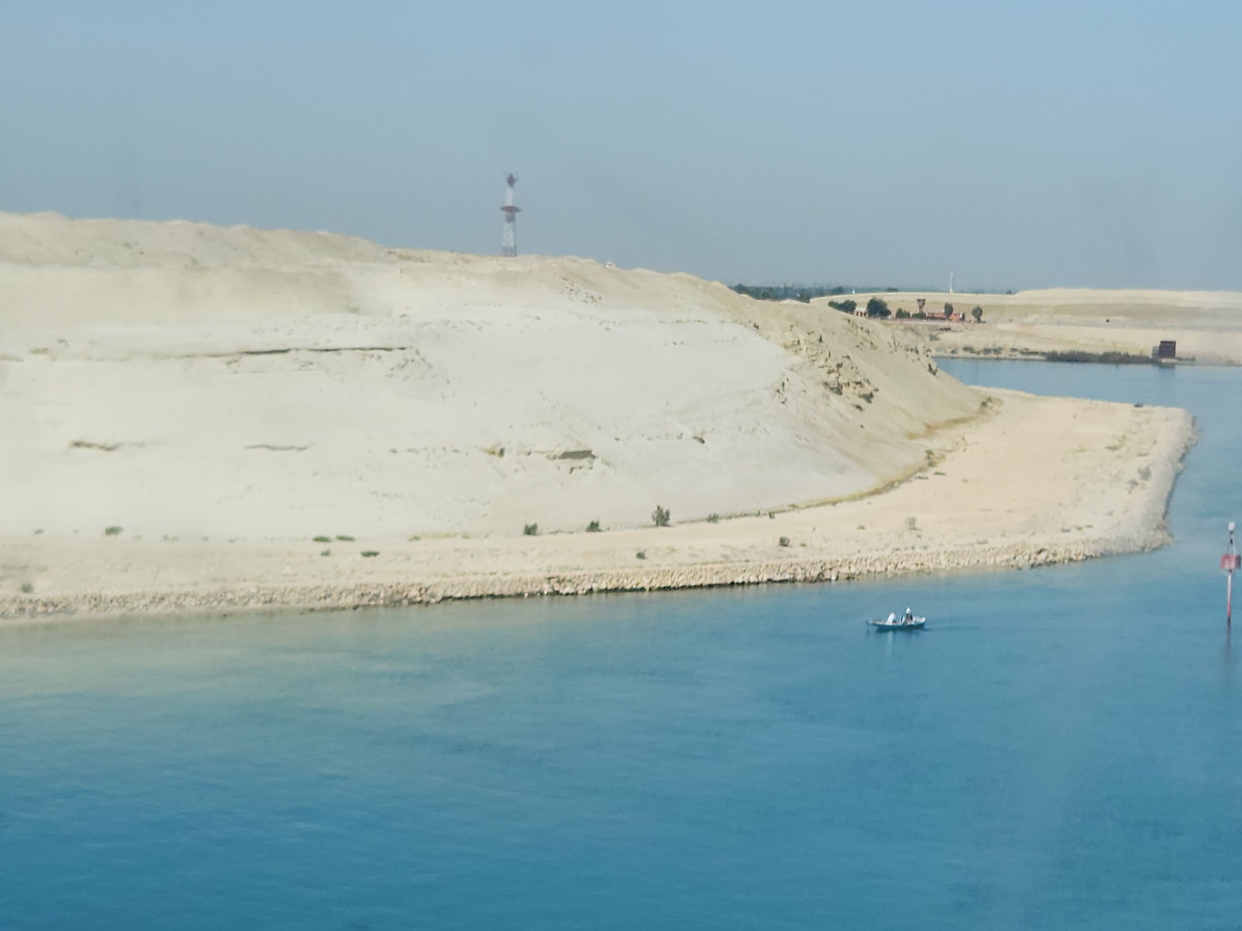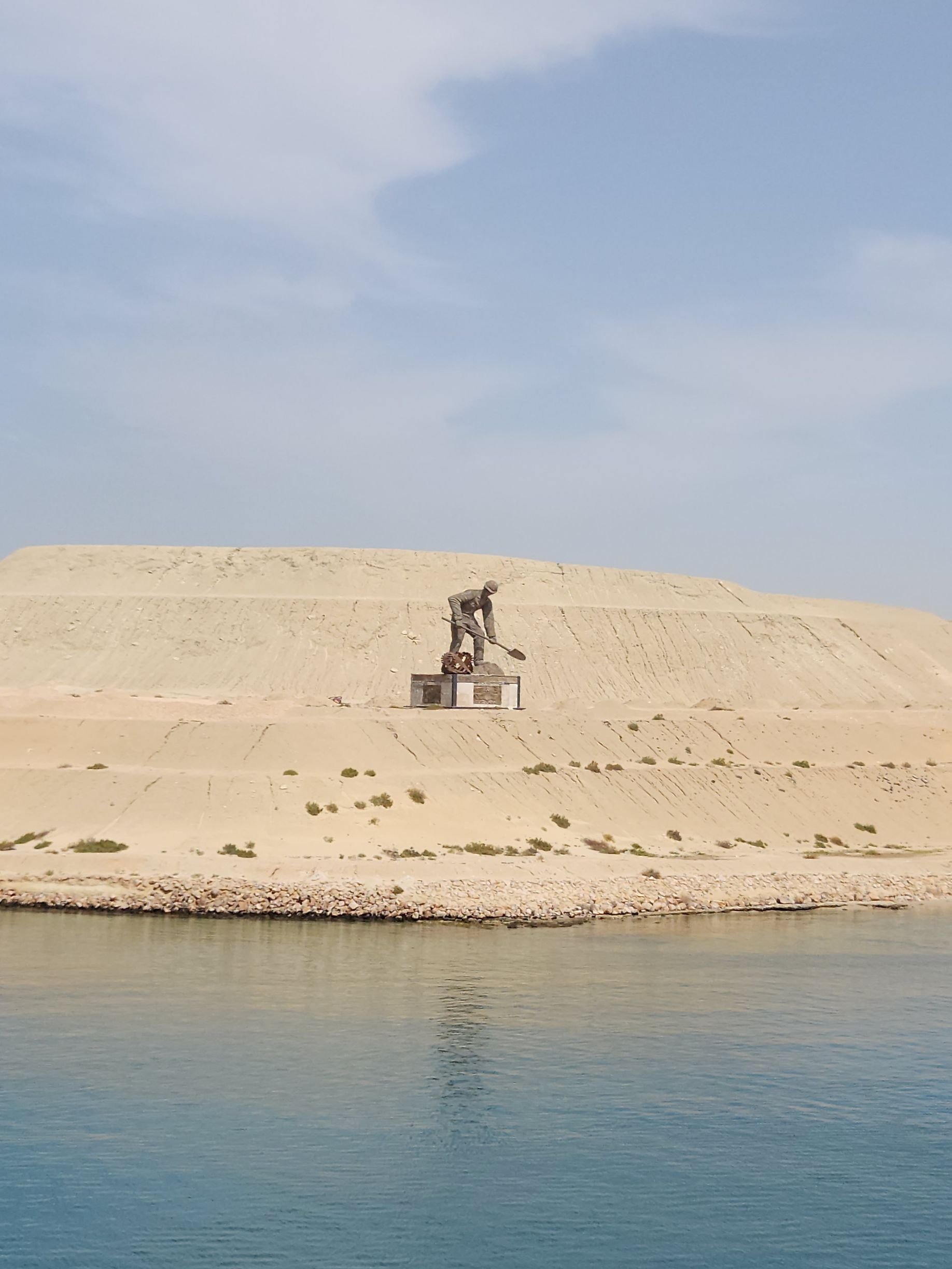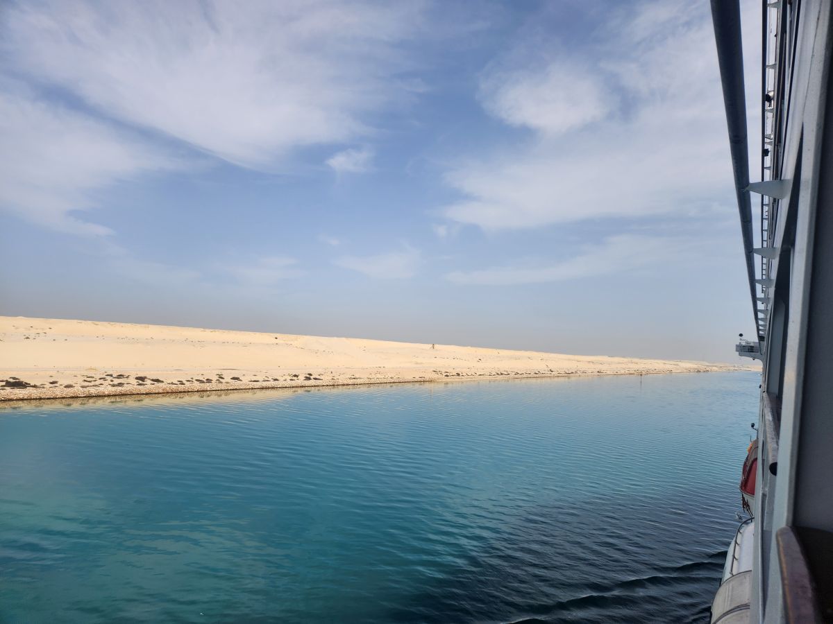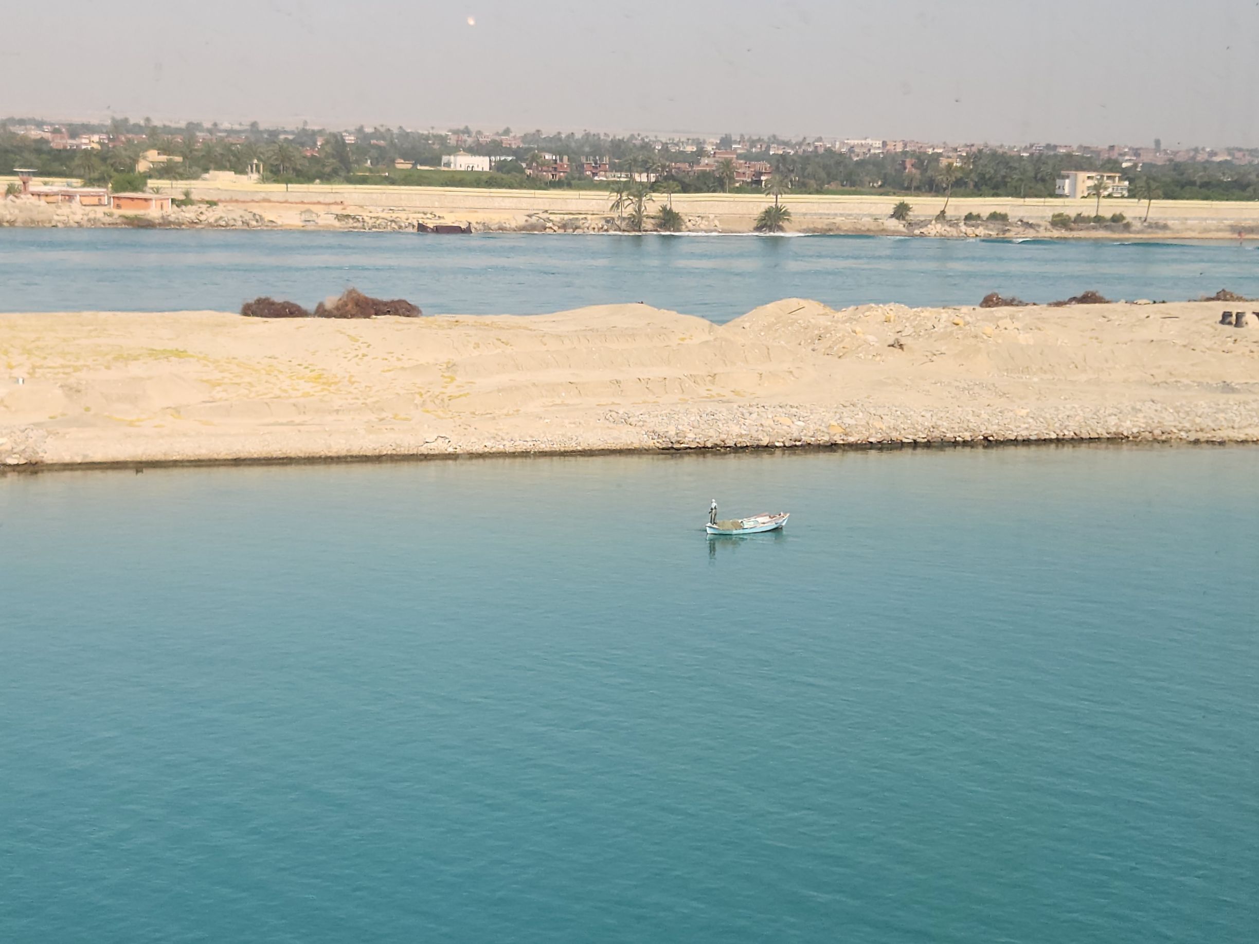 Well, bummer! Whatever time we started through the canal, it was early! Captain said picking up the pilot around 4:30am, but we still figured we’d have time to be up and see the Evergiven memorial. Um. No! God knows what time we actually started the transit, but by the time we are up – and it is still early – we are almost to the damn lake! Sheesh. I never even considered getting up early – at least not that early! Oh well. It was just a thing I had about Evergiven.