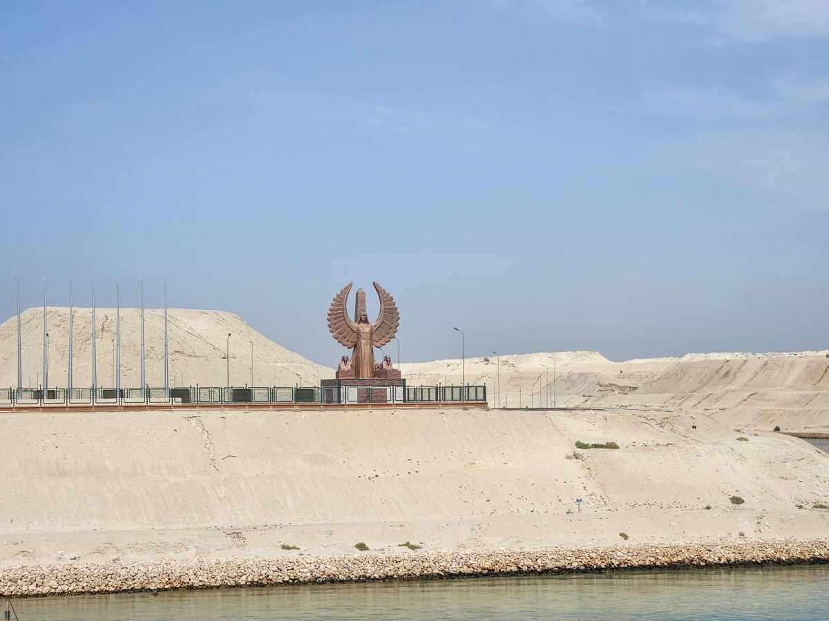 And that’s about the only excitement we have until we reach the Canal headquarters with the winged Pharoah statue on one bank and the digger man on the other. Looks familiar!