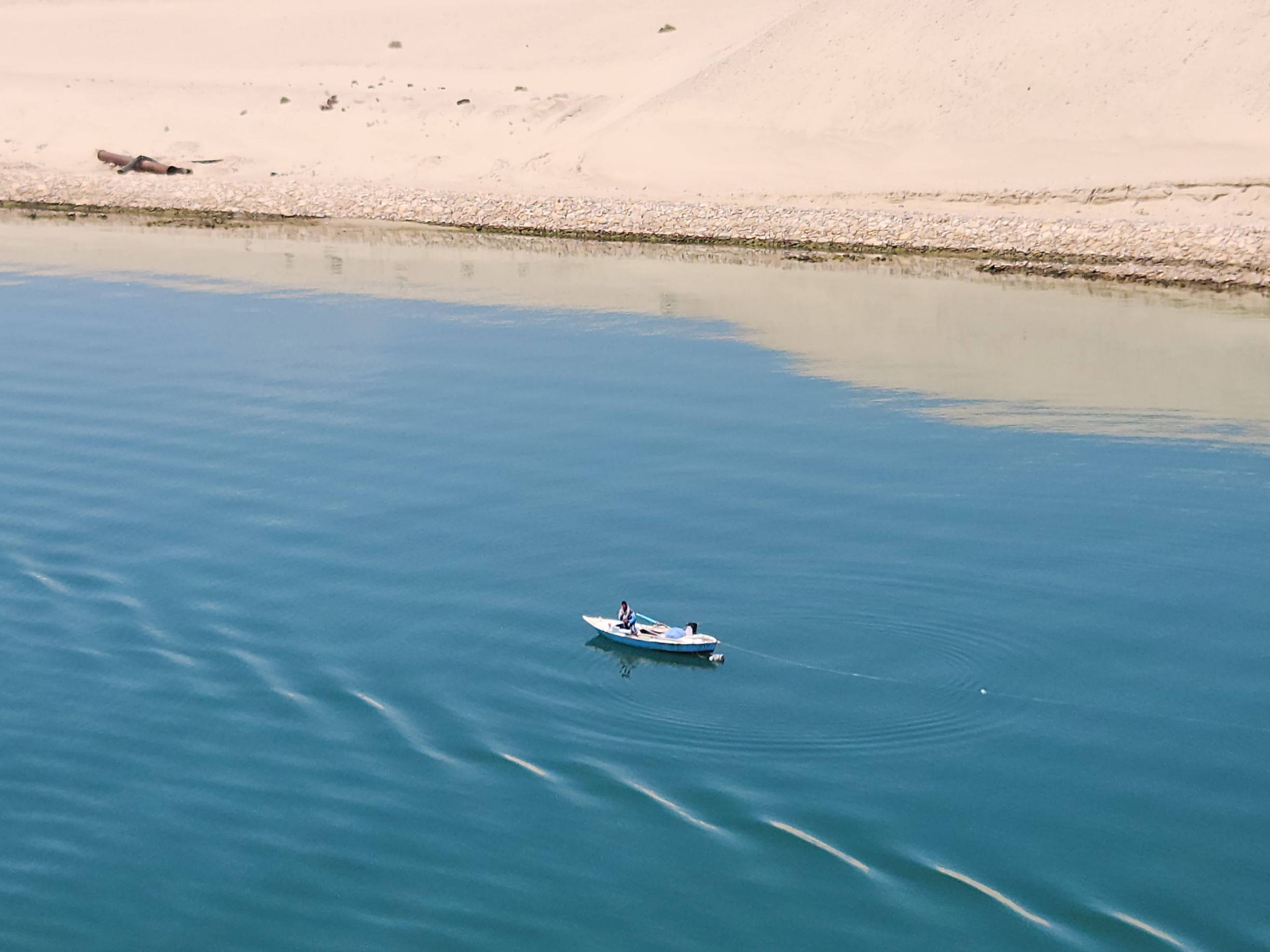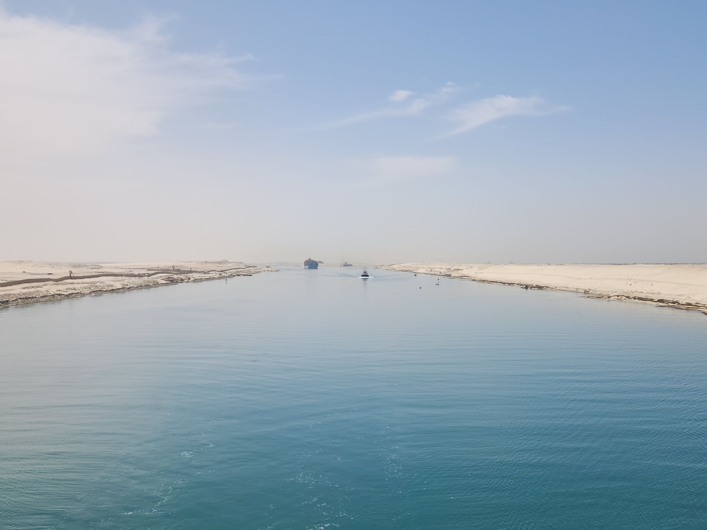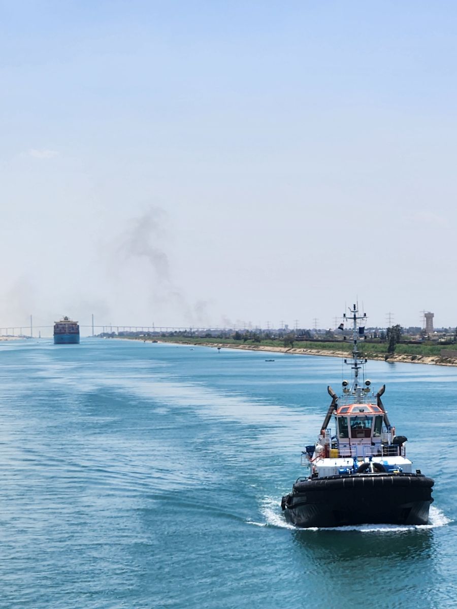 Then we are back to the combined two-way canal with the follow car (there is still a follow car!) as well as more fishing boats and our tug escort and the big container ship behind us. We’re at the head of the parade as we exit the canal and start heading to the Red Sea and Ashdod!