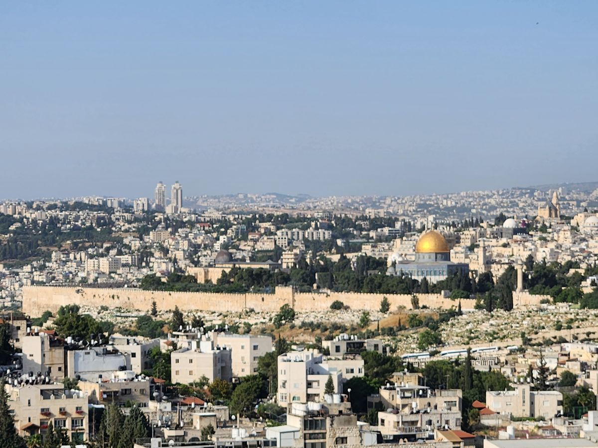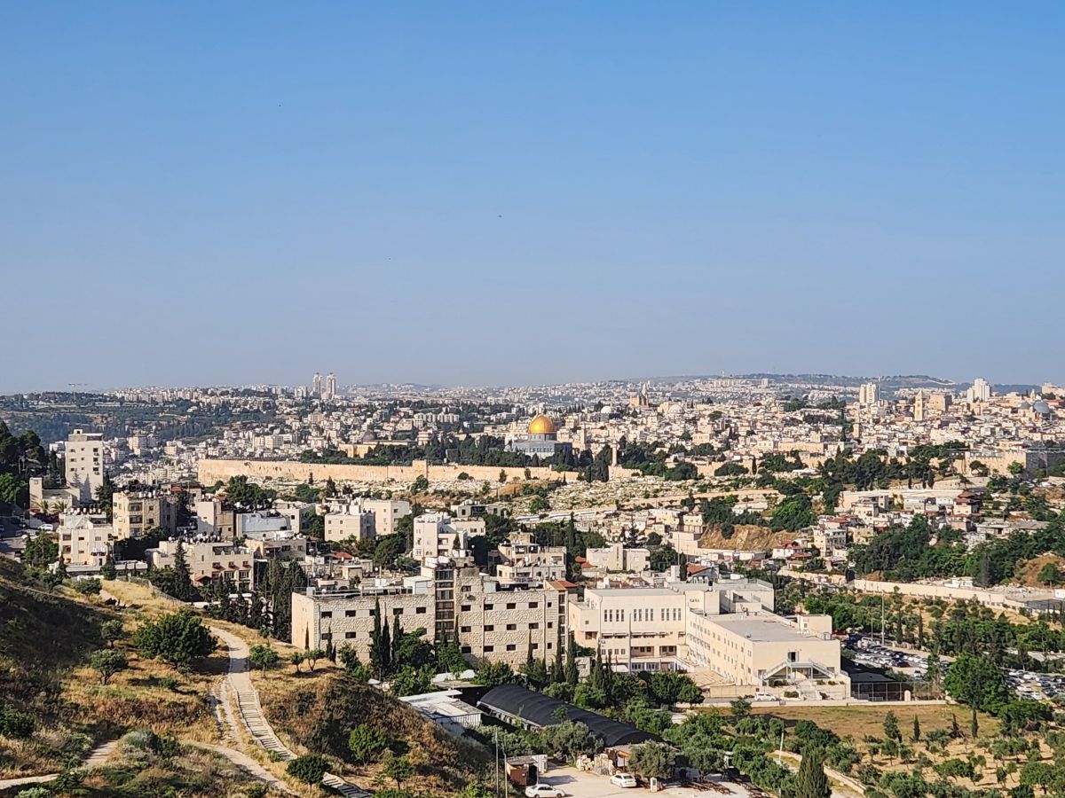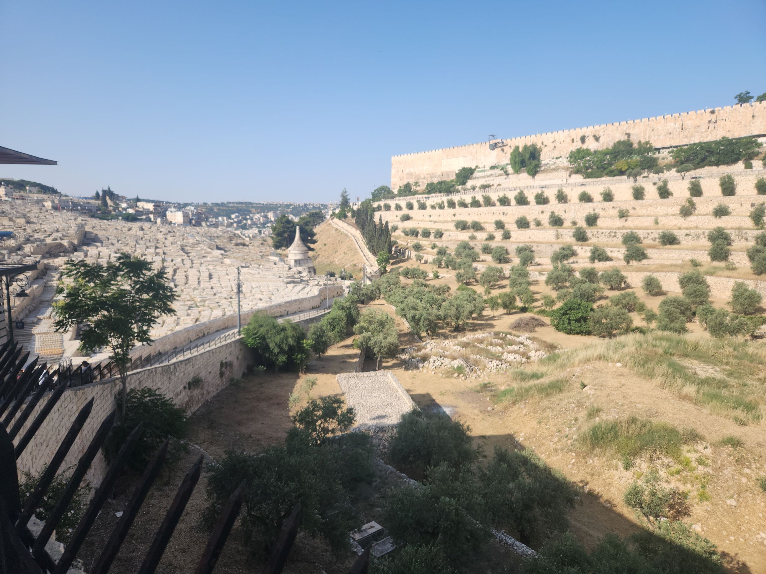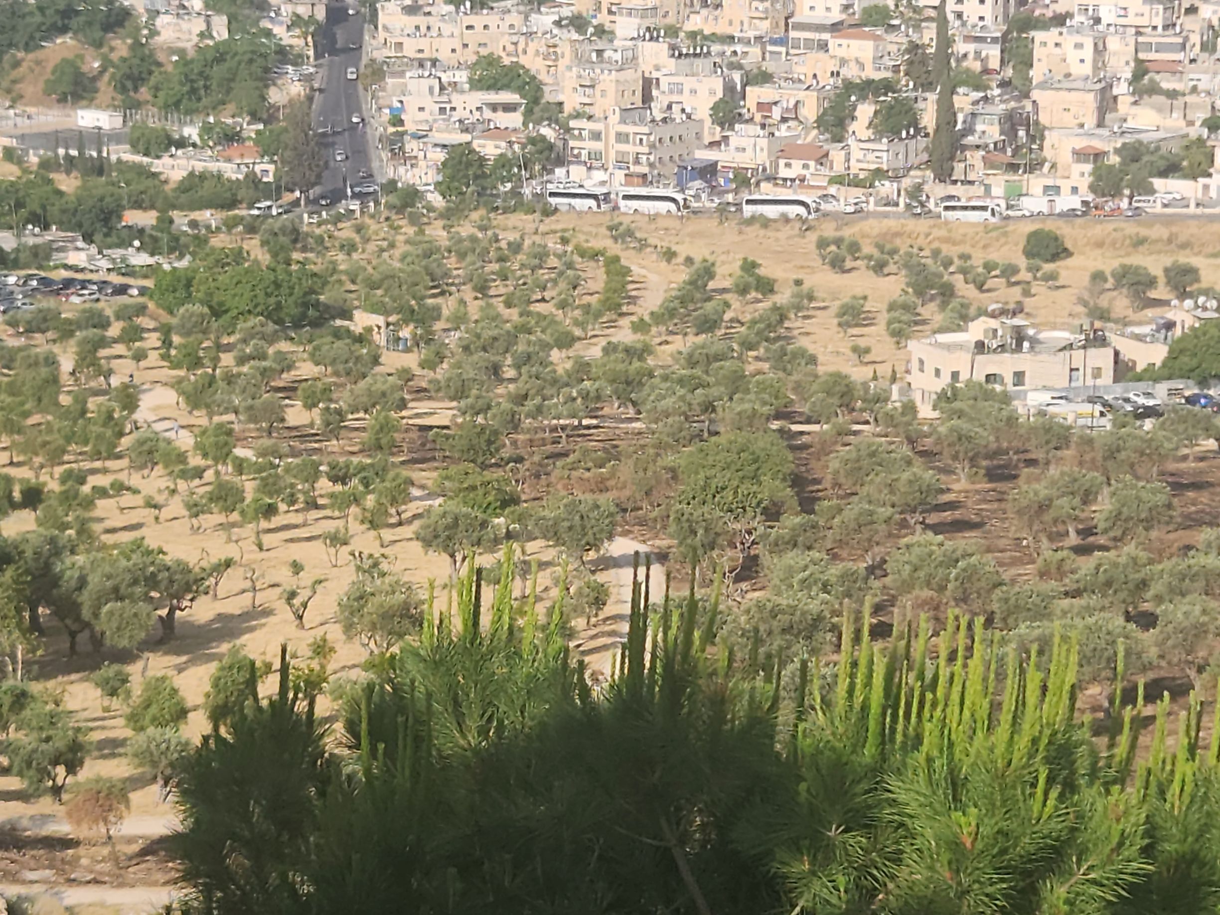 Our first stop is the Mount of Olives where we have a fabulous view out across the valley to the Old walled city of Jerusalem. You can see the Dome of the Rock (the gold dome) and the Church of the Holy Sepulchre (the smaller dark dome across the city). You can also see the sprawl of the new city spreading out up on the hills and in the valleys surrounding the old city. Almost a million people in the city – and you can tell it from the buildings all squeezed into a relatively small footprint!