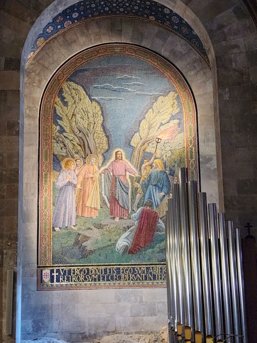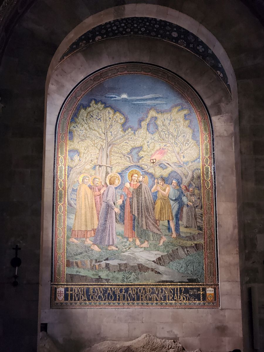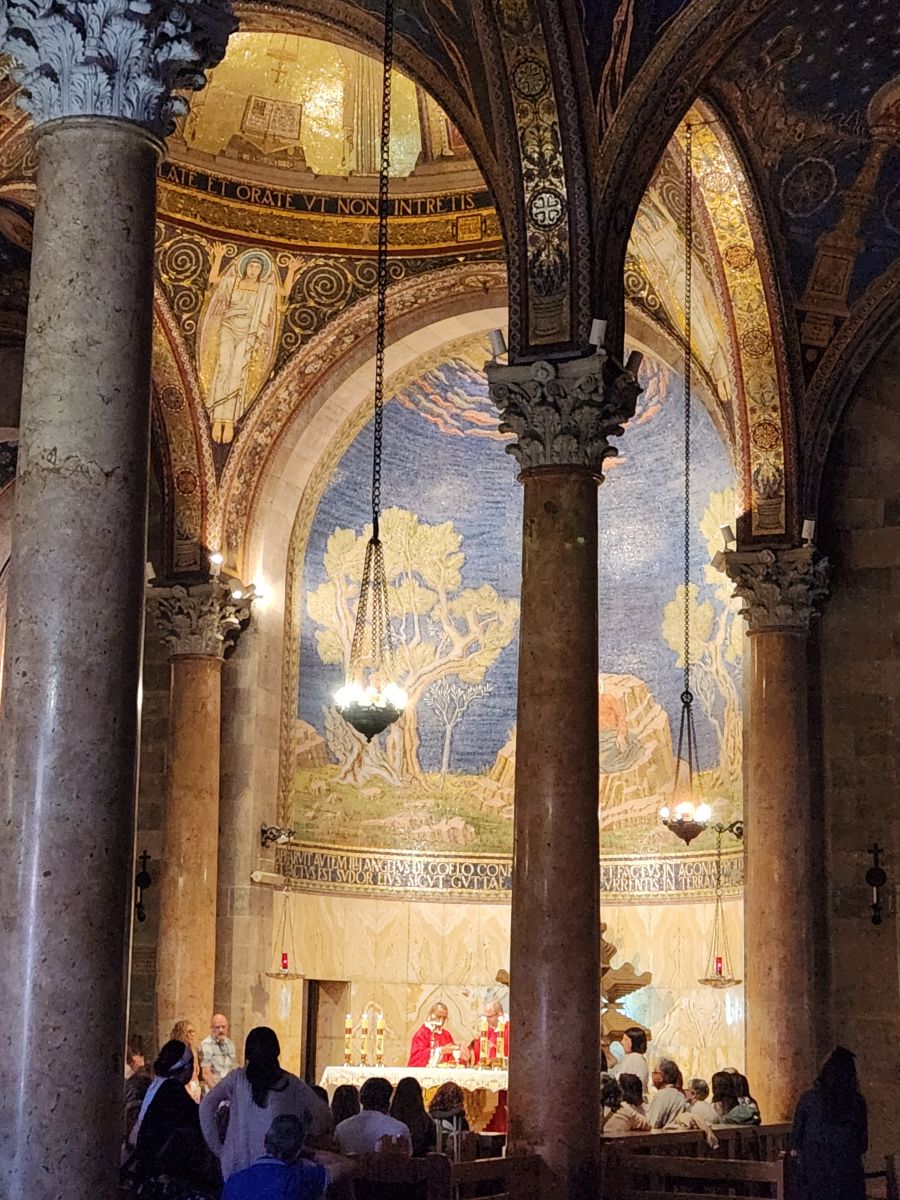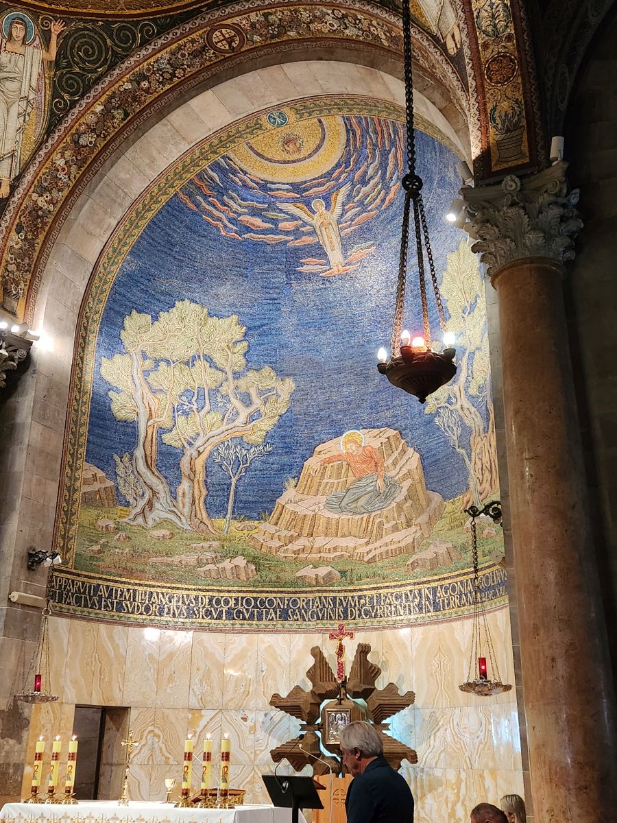 Next we are off to the Gethsemane Church, also called the Church of Agony (because it is here that Jesus was betrayed and arrested) and the Church of all Nations (because so many nations provided contributions for the mosaics in the apses and cupolas in 1919). But first we have a rest stop that has fabulous views of the East wall of the old city, the Mount of Olives cemetery and the Golden Gate – or the gates of Mercy leading into old Jerusalem. Rafael explains that the Gates of Mercy are where the Messiah will enter the Old City upon his return, which is why in addition to the Jewish cemetery, there is also a small Christian cemetery below us and a Muslim cemetery up on the hill. Everyone wants to be close to the Gates when the salvation occurs to be able to follow the Messiah.