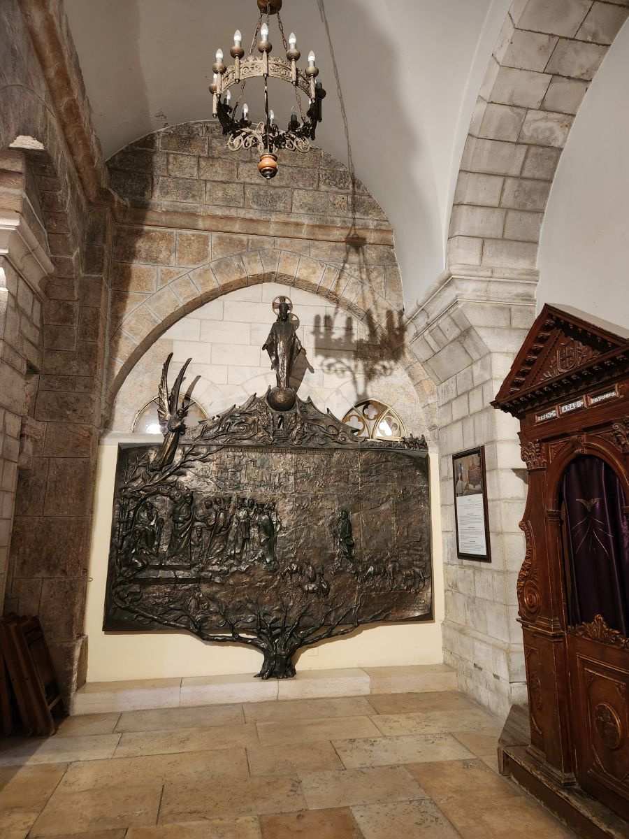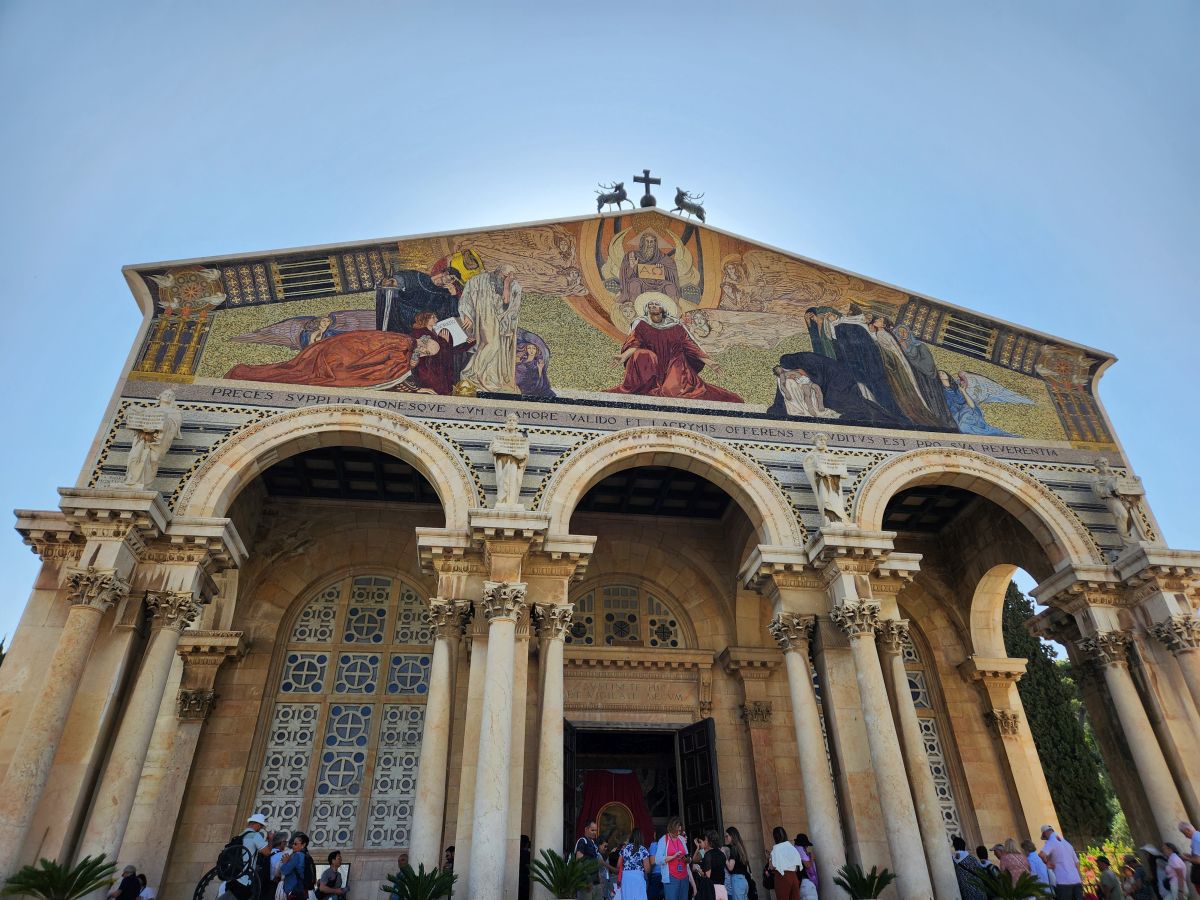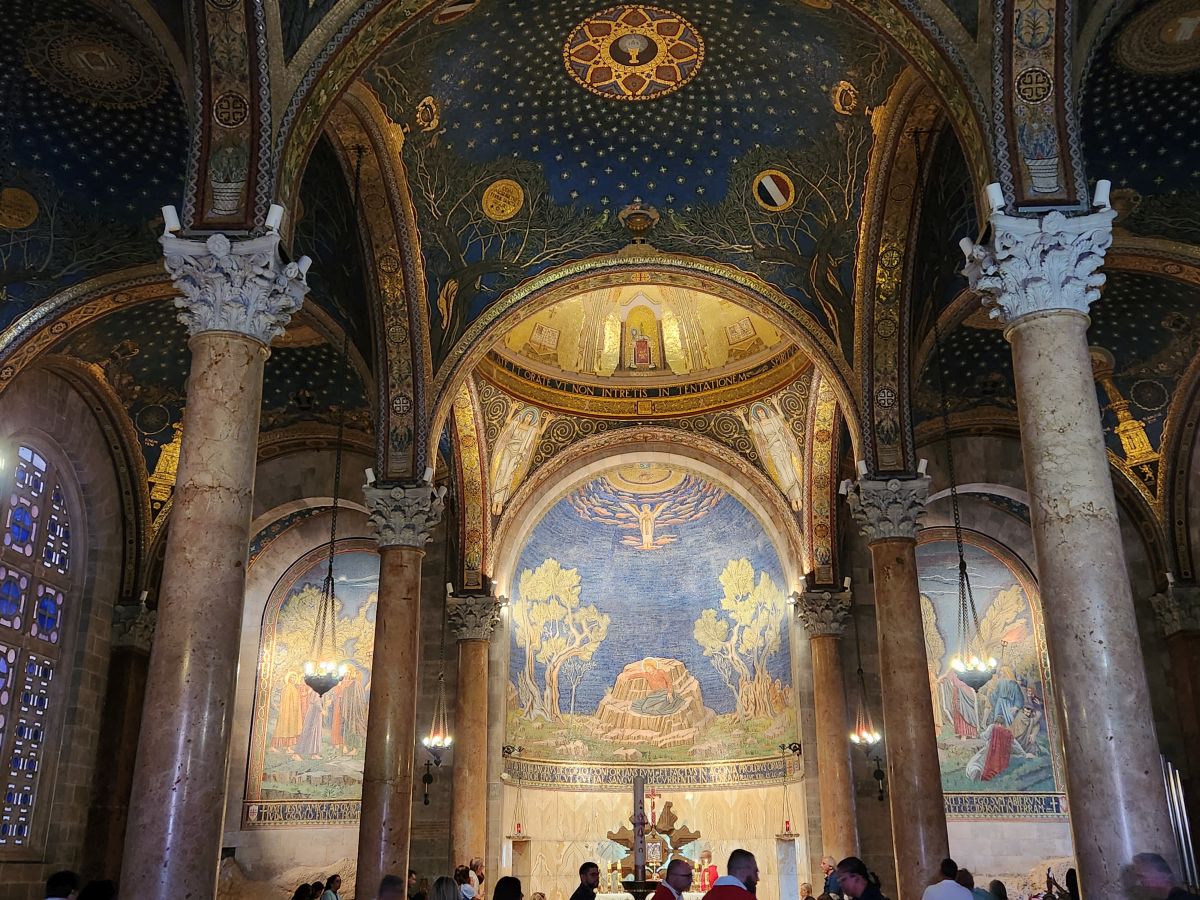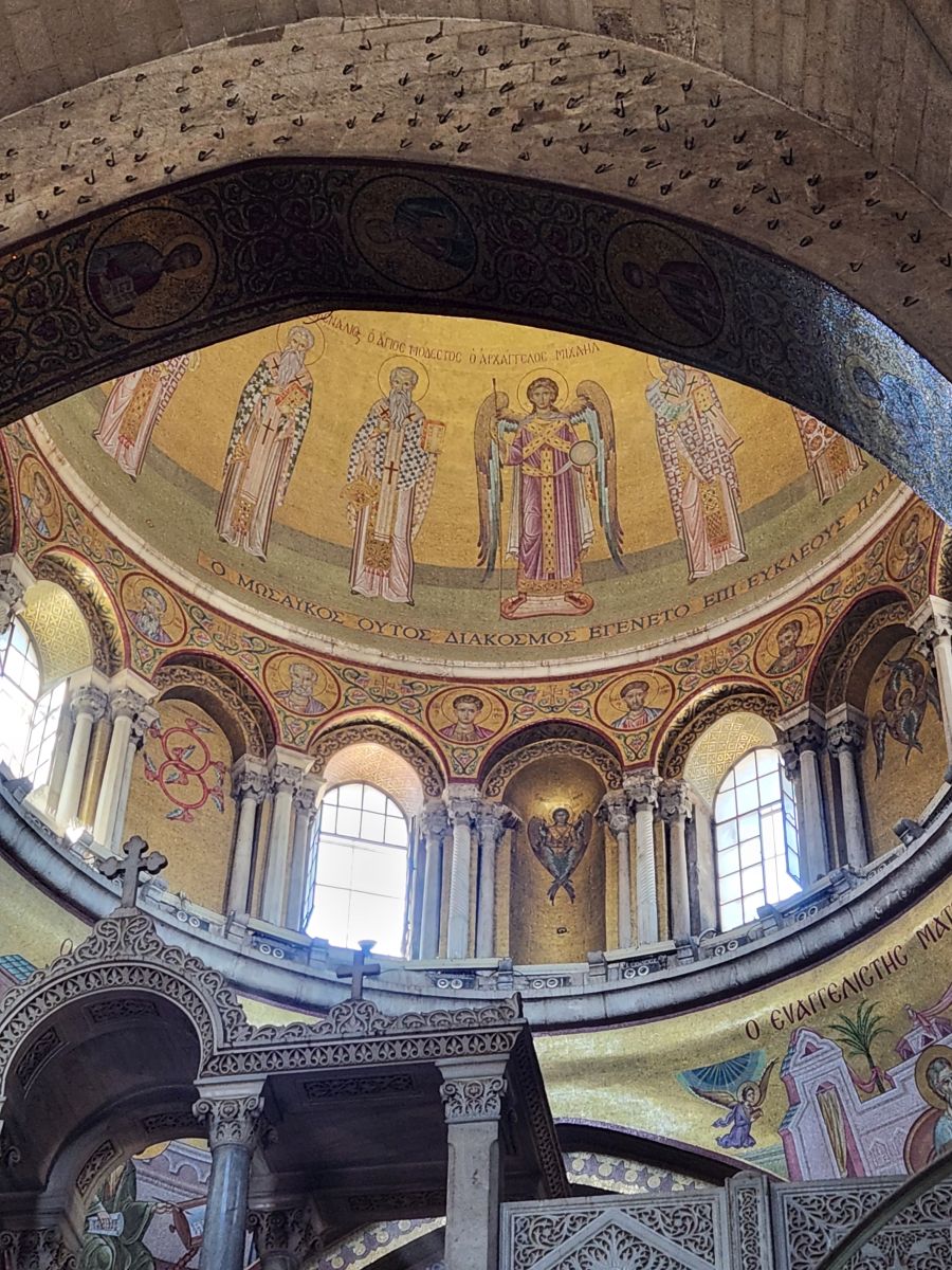 Next we are off to the Gethsemane Church, also called the Church of Agony (because it is here that Jesus was betrayed and arrested) and the Church of all Nations (because so many nations provided contributions for the mosaics in the apses and cupolas in 1919). But first we have a rest stop that has fabulous views of the East wall of the old city, the Mount of Olives cemetery and the Golden Gate – or the gates of Mercy leading into old Jerusalem. Rafael explains that the Gates of Mercy are where the Messiah will enter the Old City upon his return, which is why in addition to the Jewish cemetery, there is also a small Christian cemetery below us and a Muslim cemetery up on the hill. Everyone wants to be close to the Gates when the salvation occurs to be able to follow the Messiah.