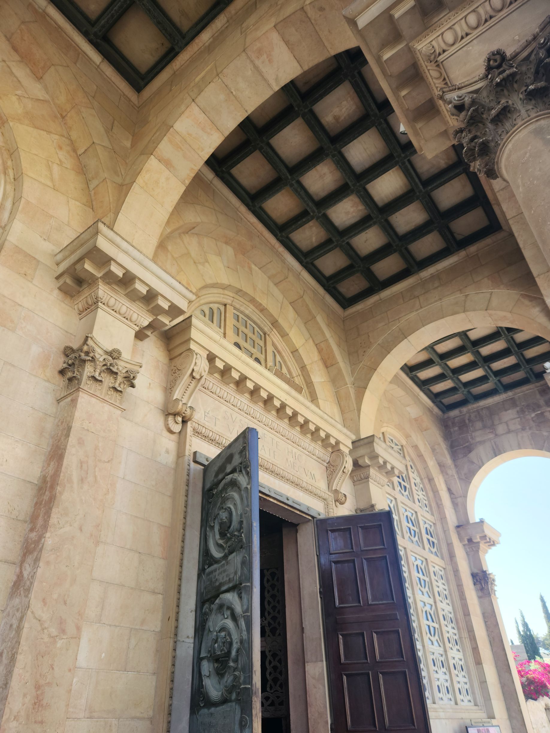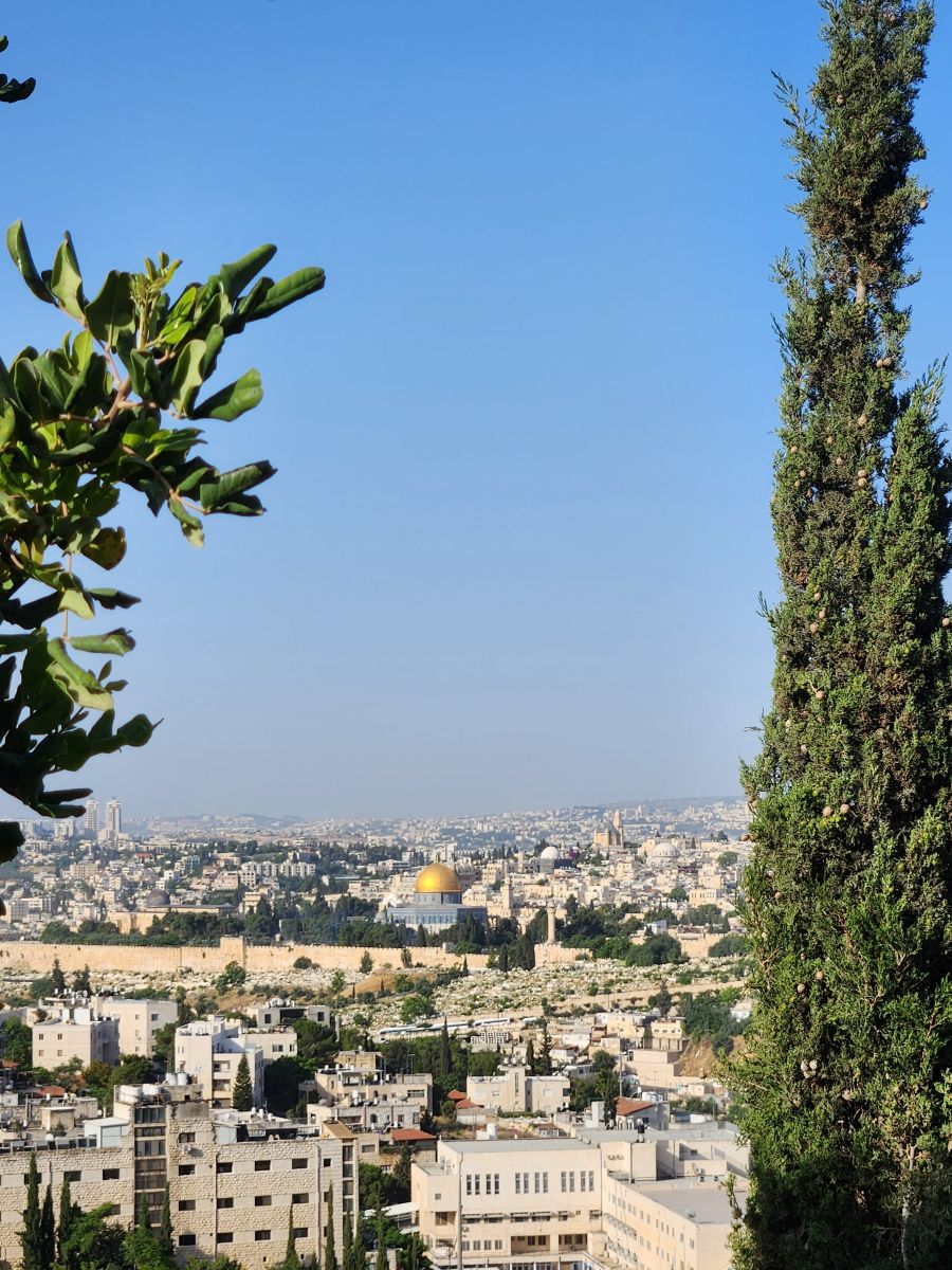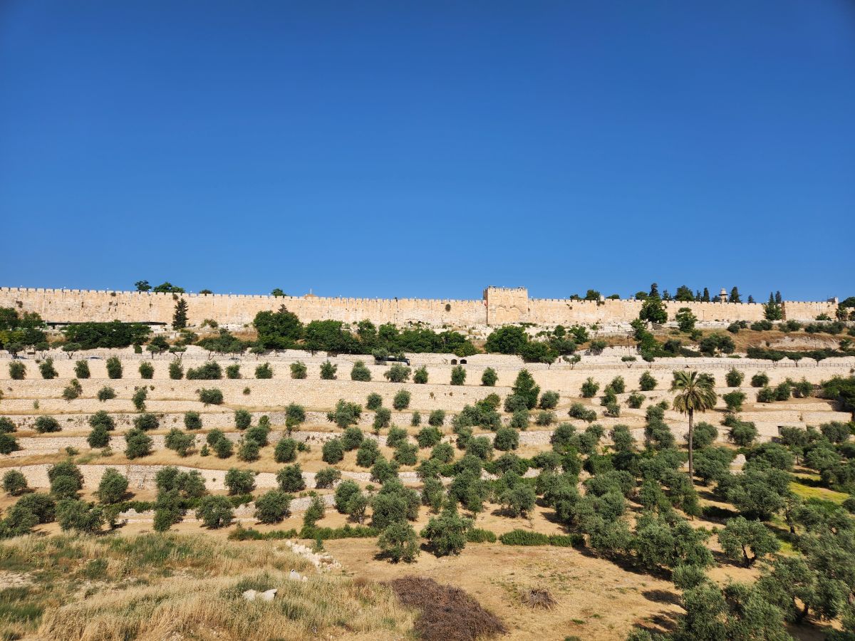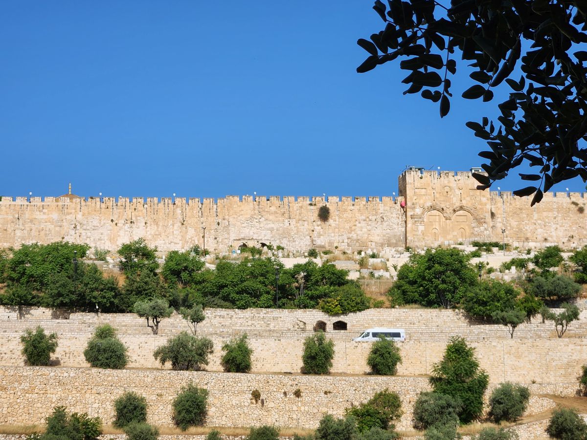 Next we are off to the Gethsemane Church, also called the Church of Agony (because it is here that Jesus was betrayed and arrested) and the Church of all Nations (because so many nations provided contributions for the mosaics in the apses and cupolas in 1919). But first we have a rest stop that has fabulous views of the East wall of the old city, the Mount of Olives cemetery and the Golden Gate – or the gates of Mercy leading into old Jerusalem. Rafael explains that the Gates of Mercy are where the Messiah will enter the Old City upon his return, which is why in addition to the Jewish cemetery, there is also a small Christian cemetery below us and a Muslim cemetery up on the hill. Everyone wants to be close to the Gates when the salvation occurs to be able to follow the Messiah.